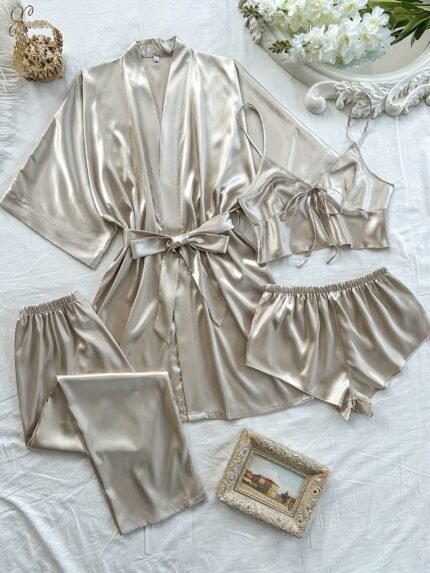 Conjunto de Robe Feminino Elegante de Cetim Rosa C…