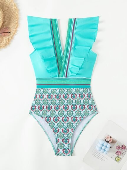 Maiô Com Estampa Tropical, Babados, Cinto, Decote …