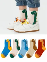 Início Vestuário Meias 5 Pares de Meias Infantis de Quatro Estações para Primavera e Outono, Desenhos Animados, Pescoço, Dragão, Dinossauro, Meninos e Meninas, Meias de Cano Médio, Meias de Bebê.