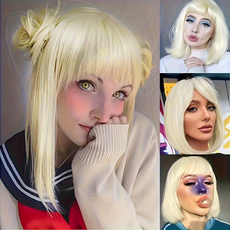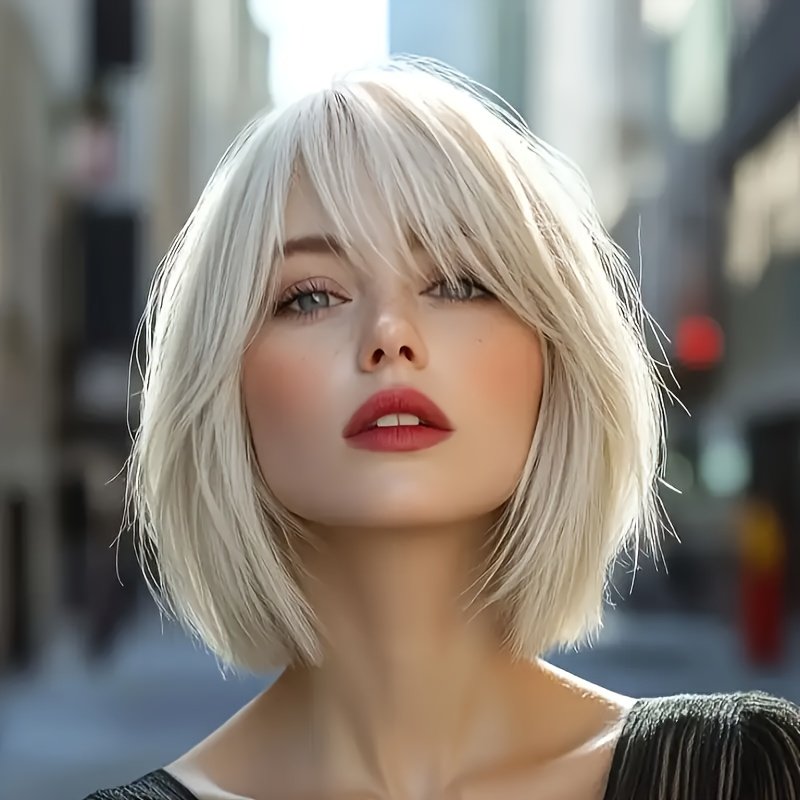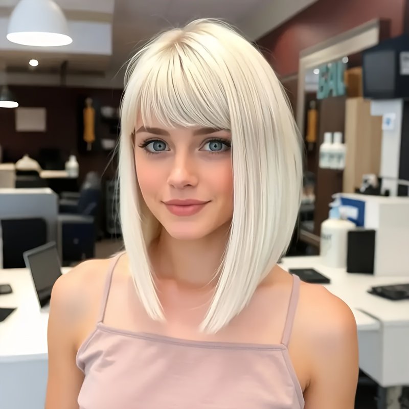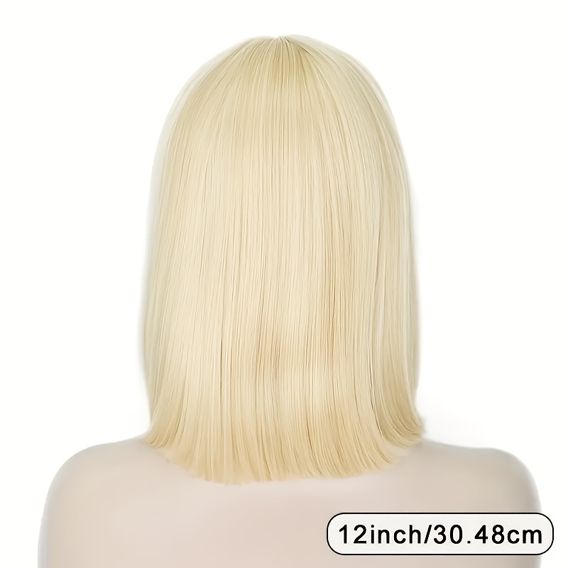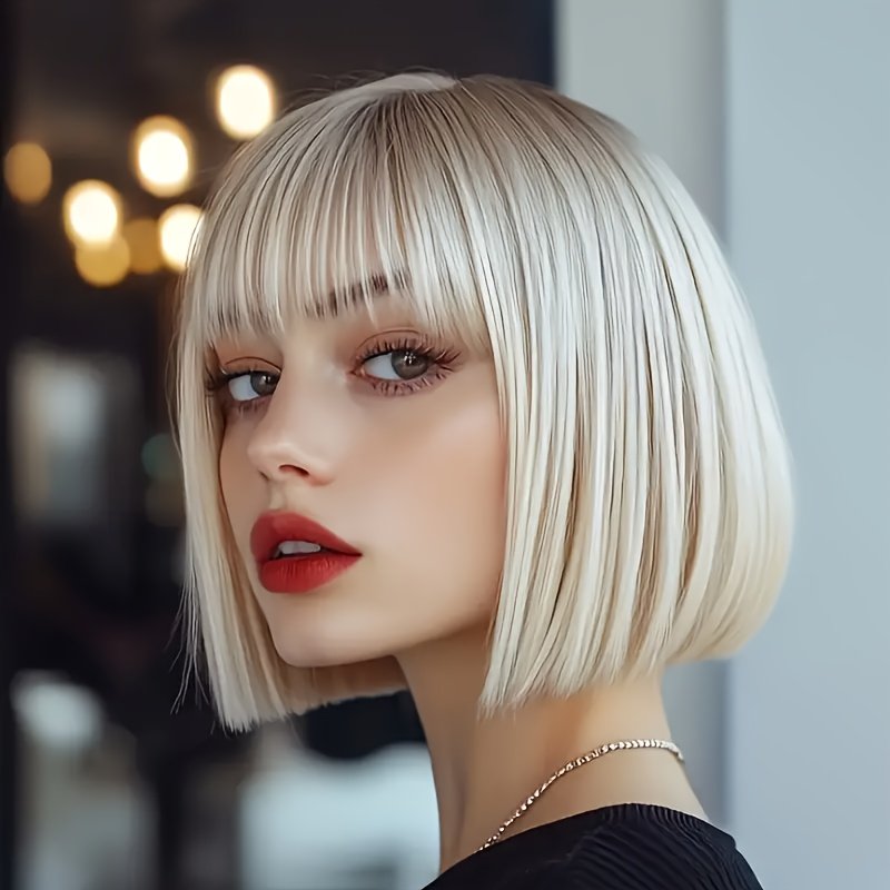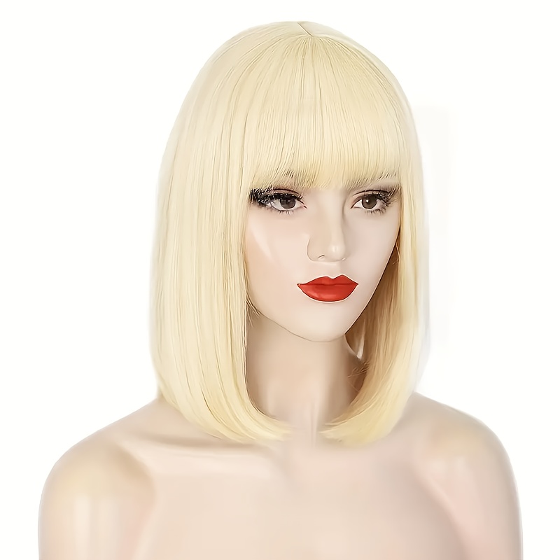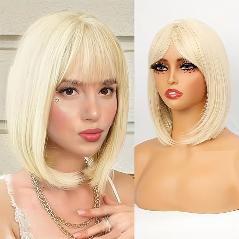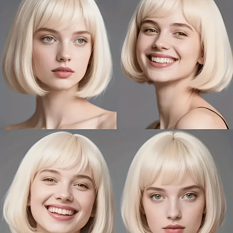 Cabelo Curto e Liso Estiloso Em Um Tom Dourado Claro, Com Franjas Que Complementam o Formato do Rosto, Ideal p/ Qualquer Tipo de Rosto e Tom de Pele, Perfeito para Perucas Festivas e Brincadeiras Com Personagens, Eventos Sociais, Chás da Tarde, Chique e Sofisticado.