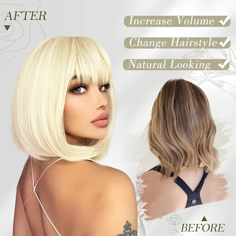 Início Beleza e Estética Perucas e Laces Cabelo Curto e Liso Estiloso Em Um Tom Dourado Claro, Com Franjas Que Complementam o Formato do Rosto, Ideal p/ Qualquer Tipo de Rosto e Tom de Pele, Perfeito para Perucas Festivas e Brincadeiras Com Personagens, Eventos Sociais, Chás da Tarde, Chique e Sofisticado.