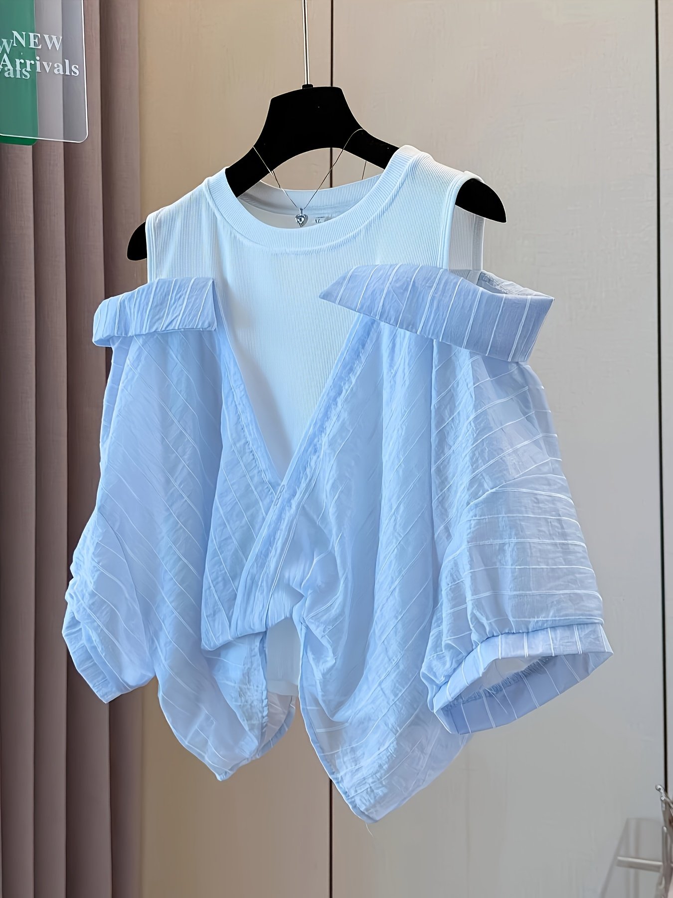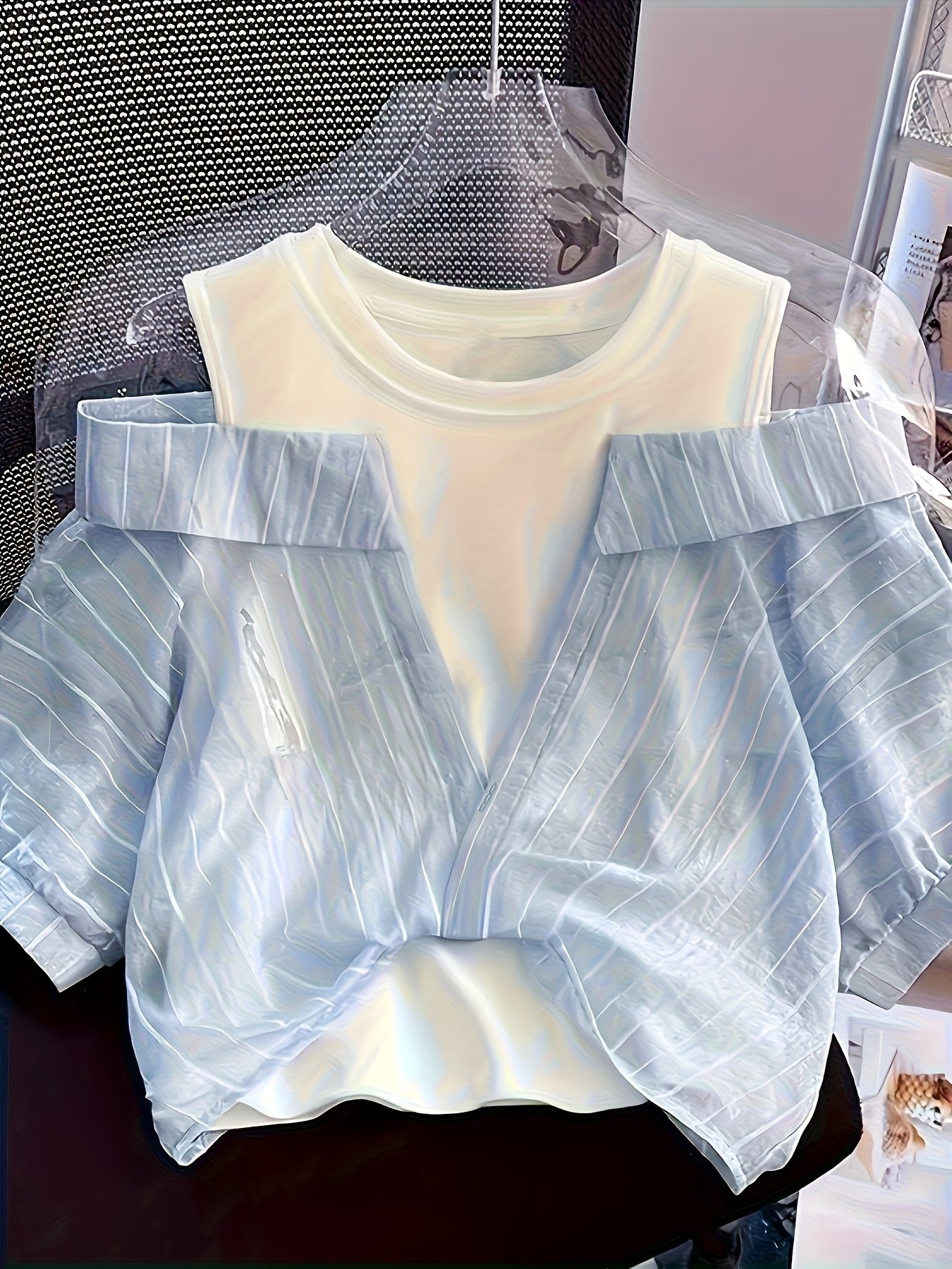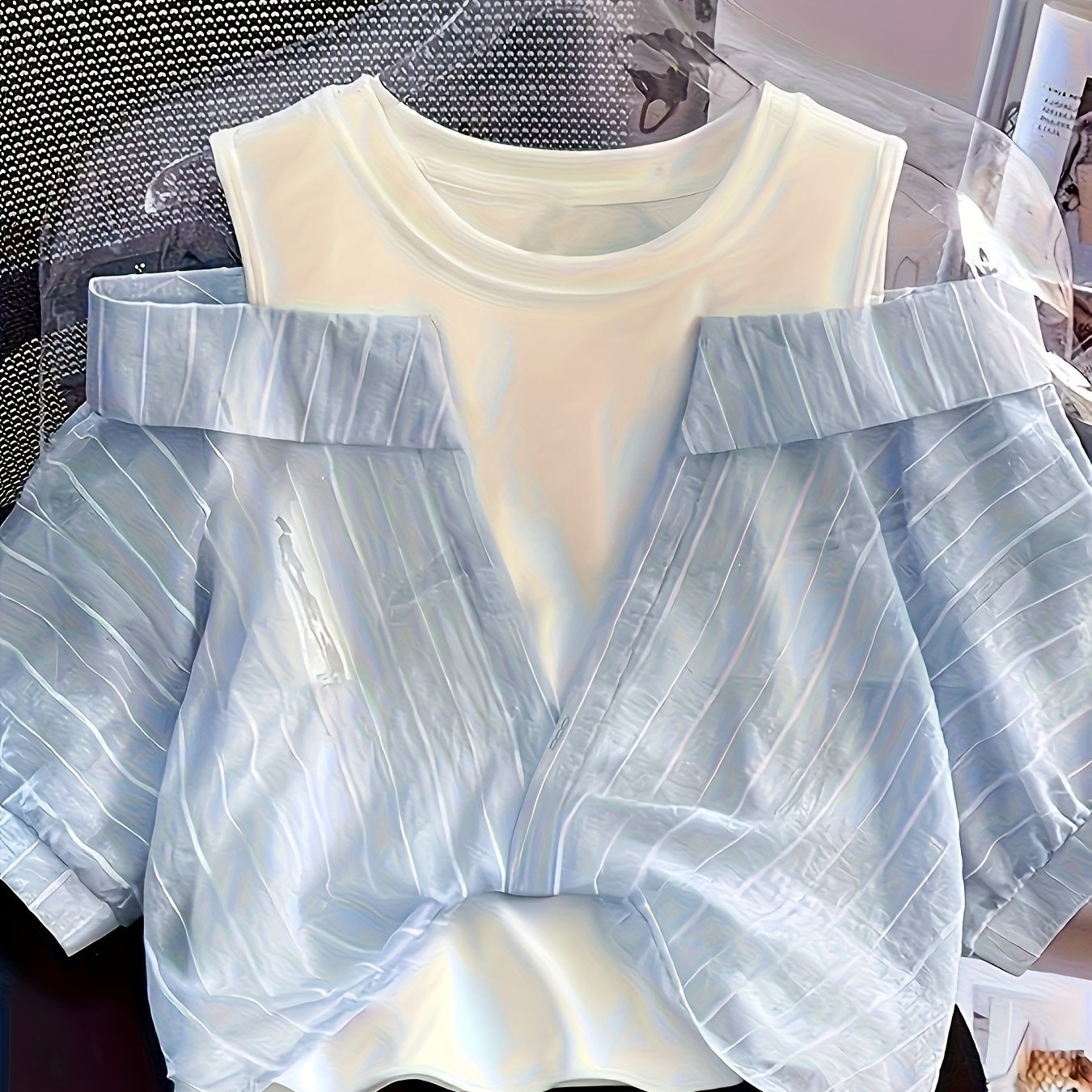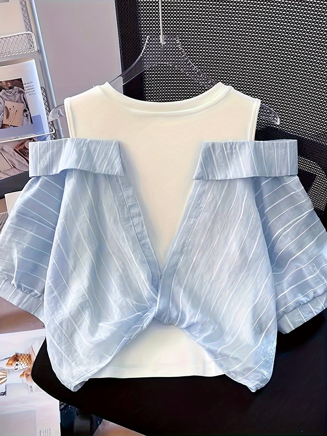 Camisa Curta Feminina Casual de Verão, de Duas Peças, Com Ombros de Fora, Estilo Falso – Caimento Solto, Listrada, Detalhes Em Cores Contrastantes, Top Leve Lavável à Máquina para Passeios na Praia e Trajes Casuais Chiques, Roupas de Praia, Tecido de Textura Suave, Estilo Férias, Material Respirável.