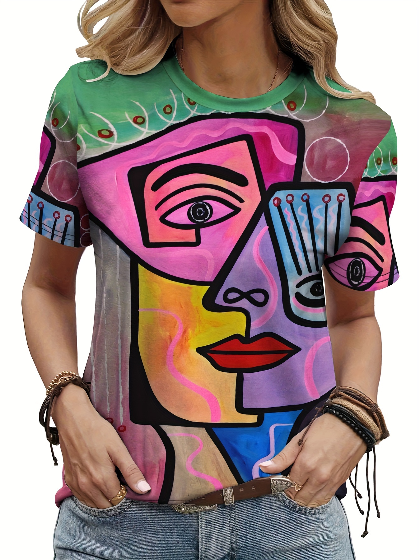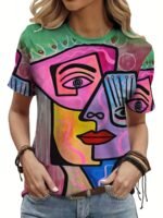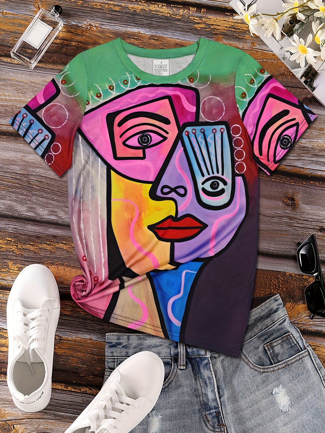 Camiseta Feminina Plus Size e/ou OverSized Fashion Com Estampa Abstrata de Rosto - Camiseta de Manga Curta Com Estampa Multicolorida Em Blocos, Gola Redonda Respirável, Ideal para o Dia a Dia e Ocasiões Formais - Camiseta Feminina para Todas as Estações, Versátil, Moderna e Confortável.