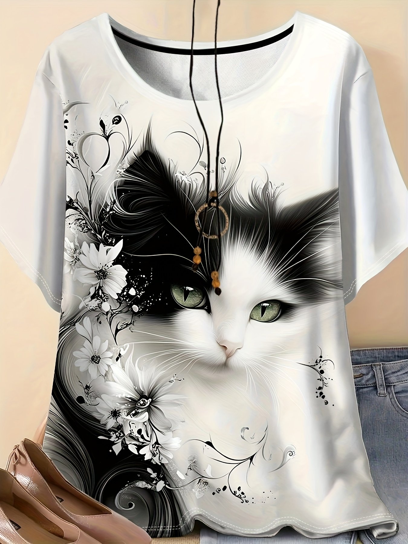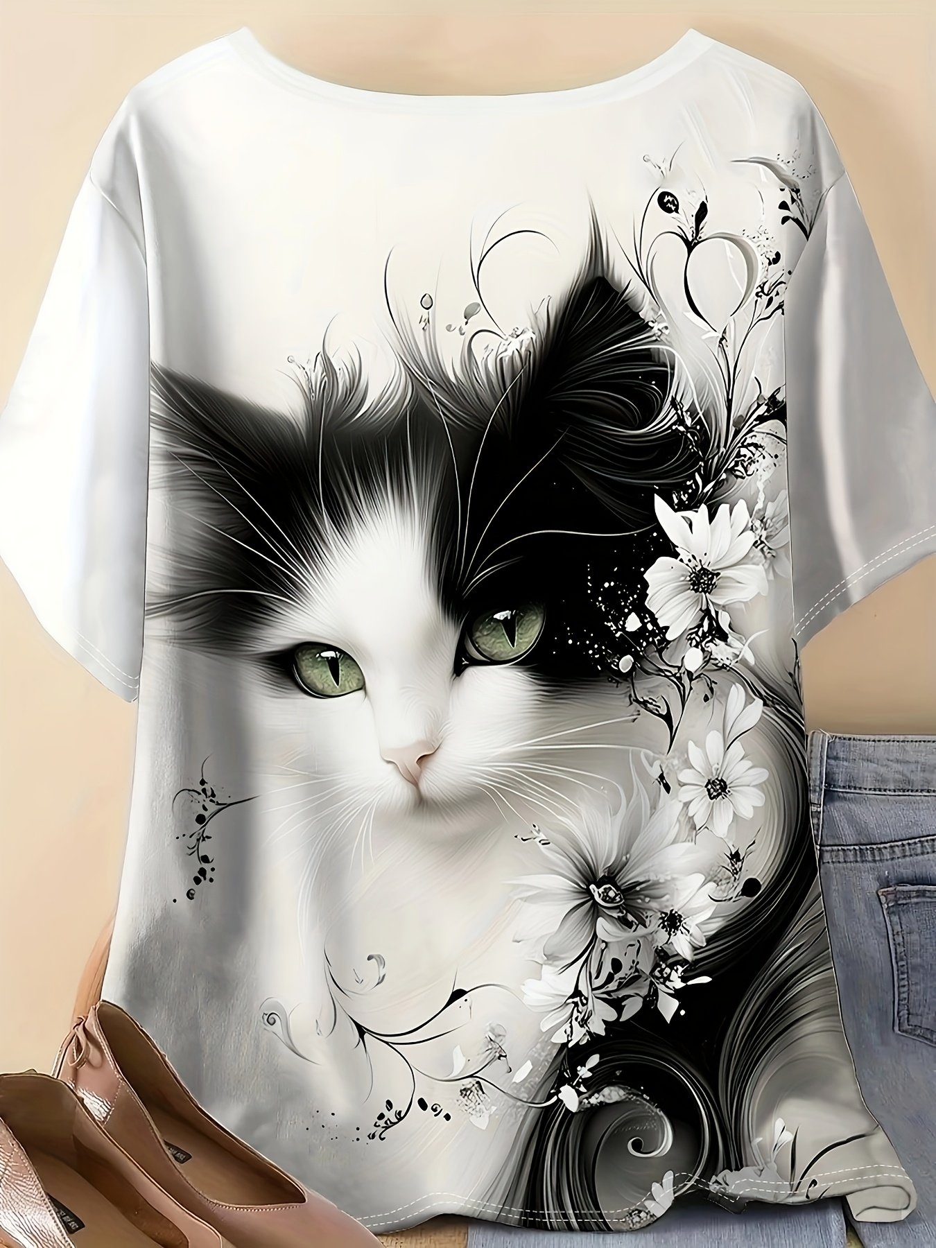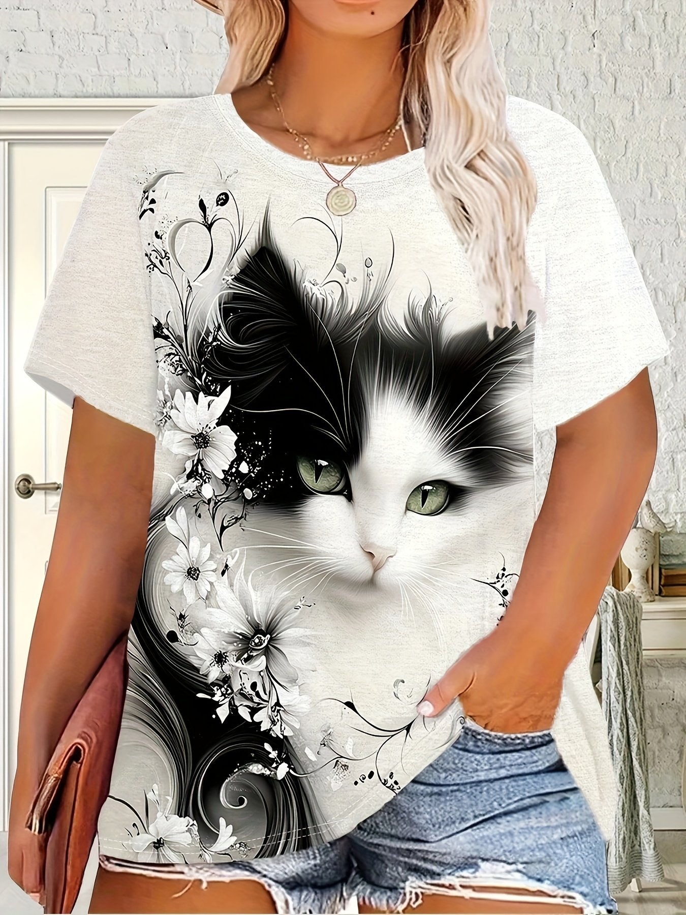 Camiseta Feminina Plus Size e/ou OverSized Fashion Com Estampa de Gato, Manga Curta, Gola Redonda, Tecido Composto por 95% Algodão e 5% Elastano, Perfeita para Atividades Ao Ar Livre e Viagens.