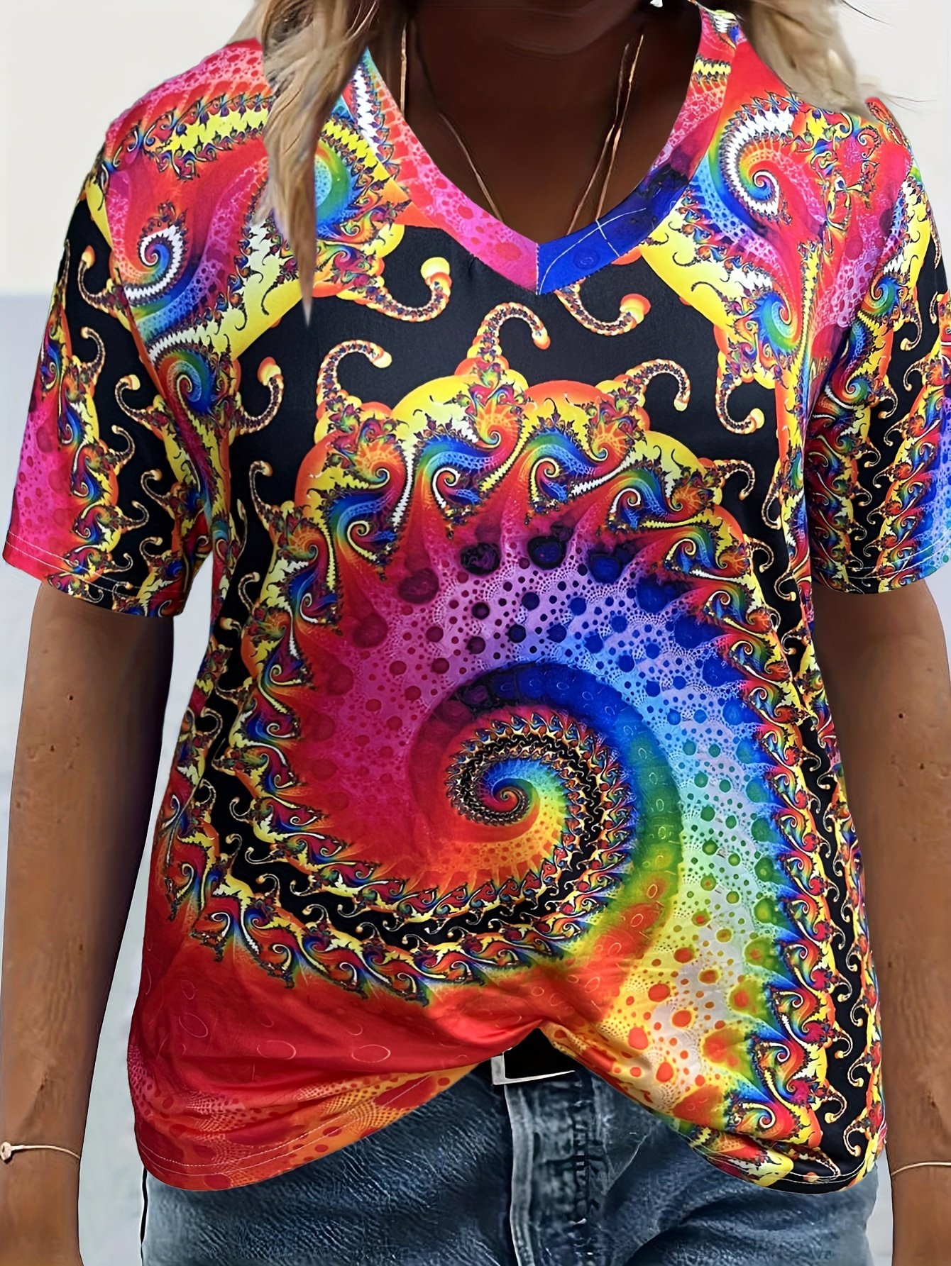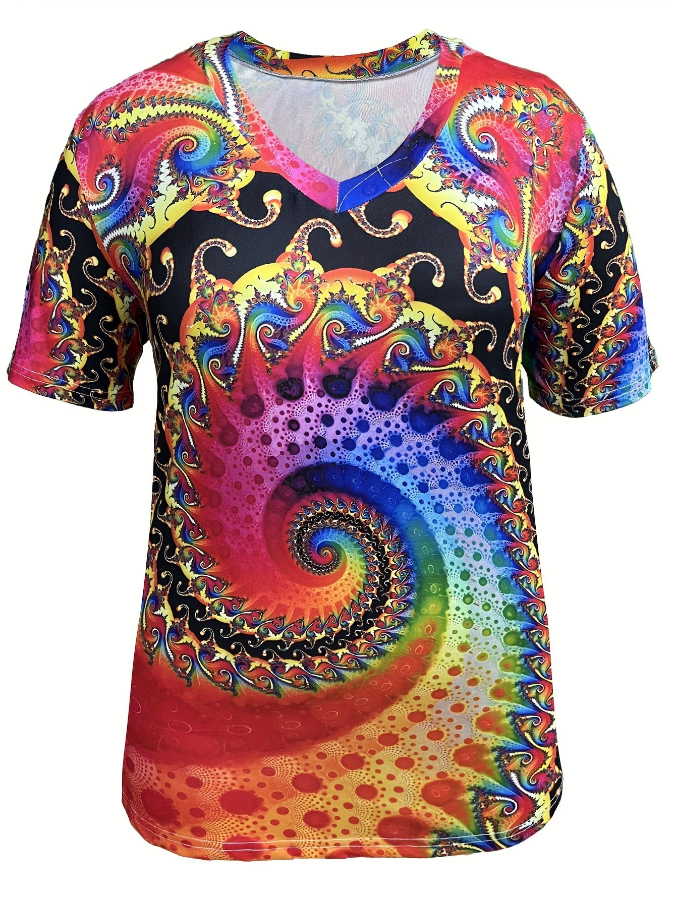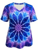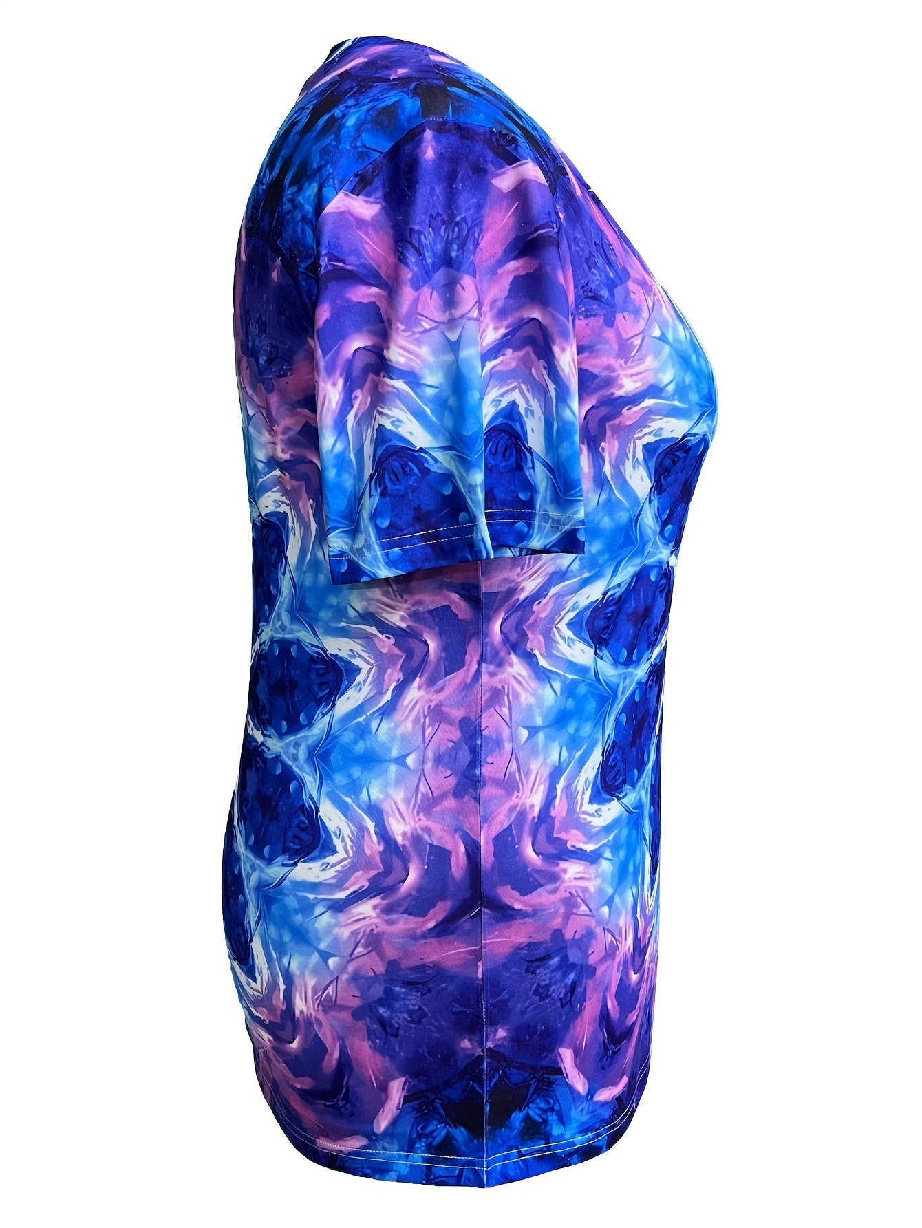 Camiseta Feminina Plus Size E/ou Oversized Fashion Com Estampa Floral Tie-Dye, Blusa Casual de Manga Curta Com Decote Em “V”.