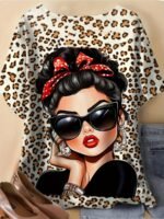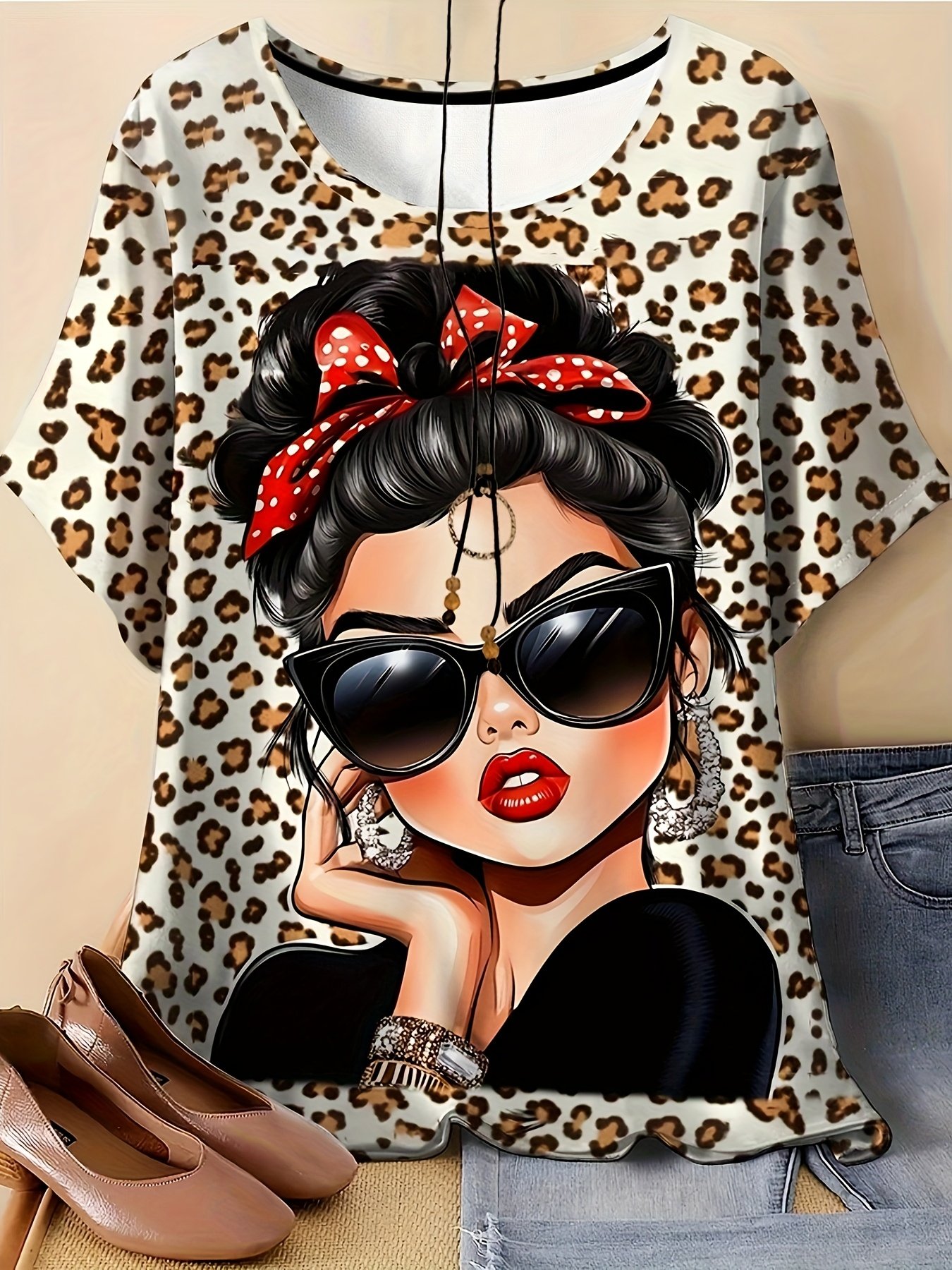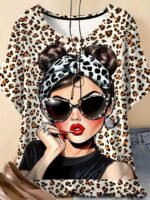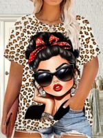 Camiseta Feminina Plus Size e/ou OverSized Fashion Com Estampa Retrô de Leopardo Em 3D, Manga Curta e Gola Redonda. Ideal para Primavera / Verão / Outono / Inverno, Confortável e Respirável, Perfeita para Todas as Estações.