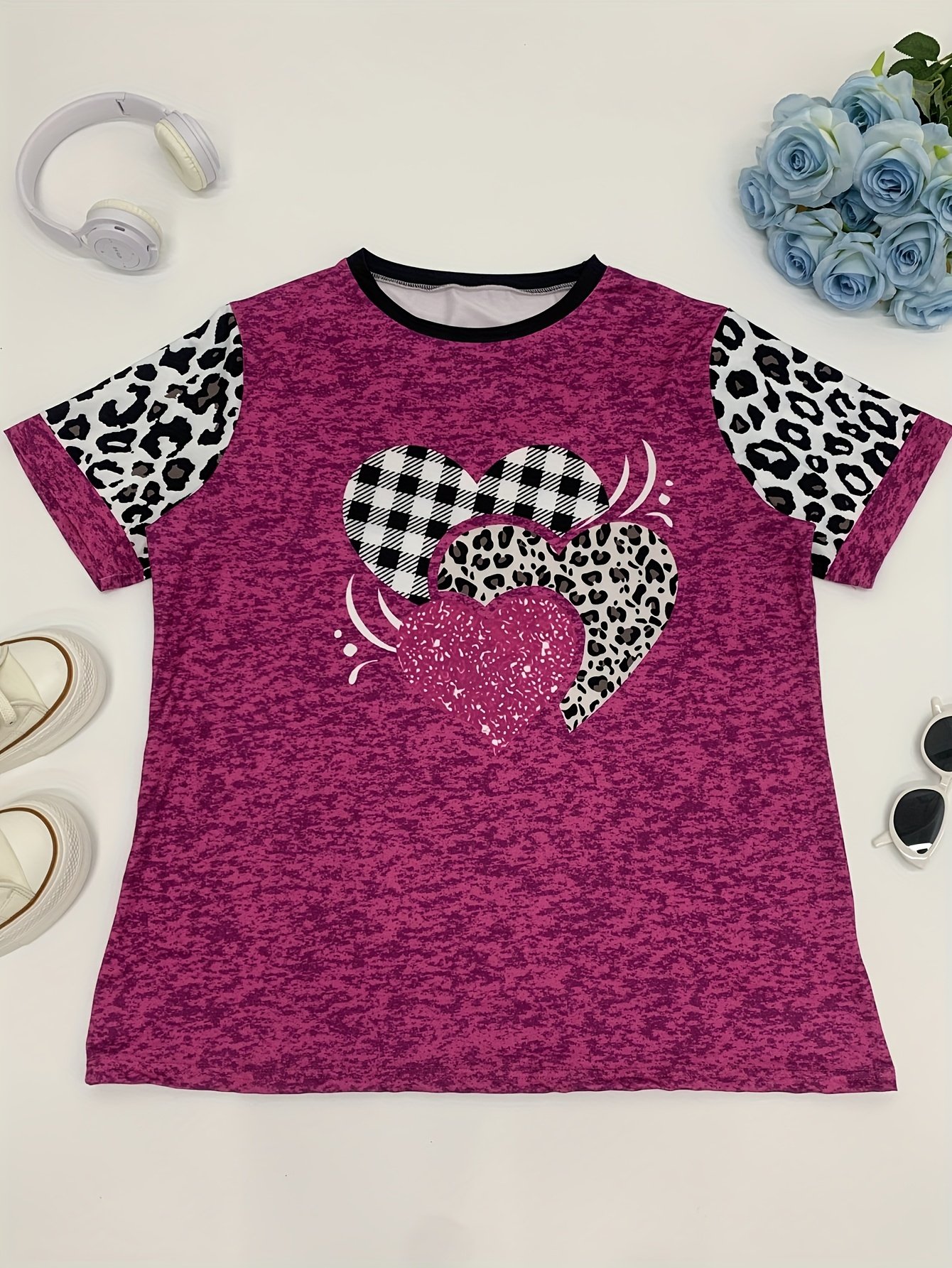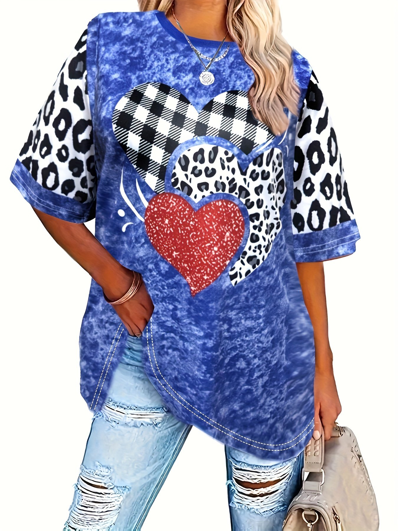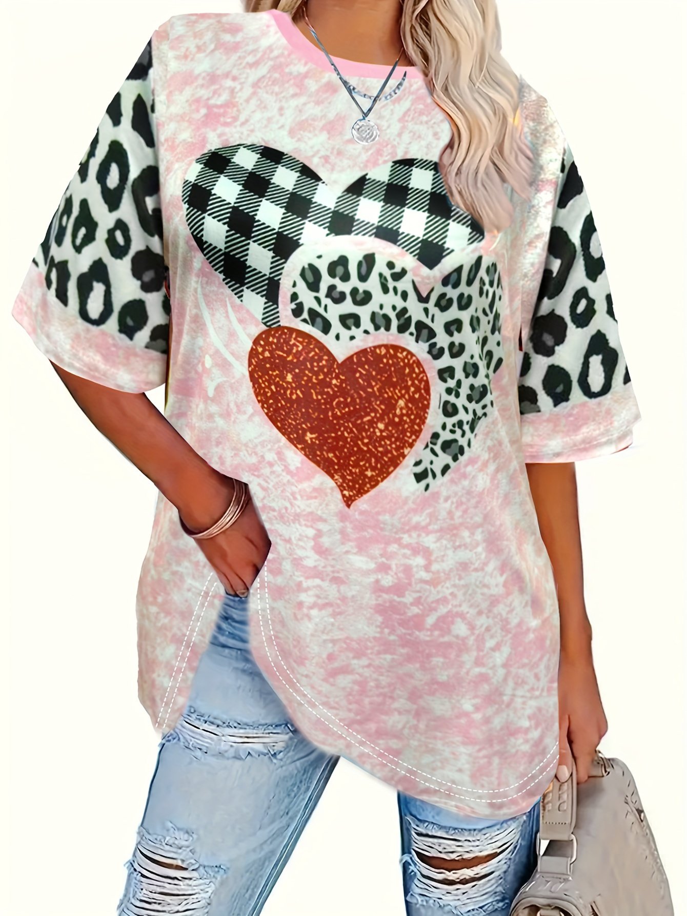 Camiseta Feminina Plus Size e/ou OverSized Fashion Com Estampa Tie-Dye de Corações – Gola Redonda Casual, Elasticidade Média, Blusa da Moda Primavera / Verão / Outono / Inverno Com Estampa de Leopardo e Corações Com Glitter.