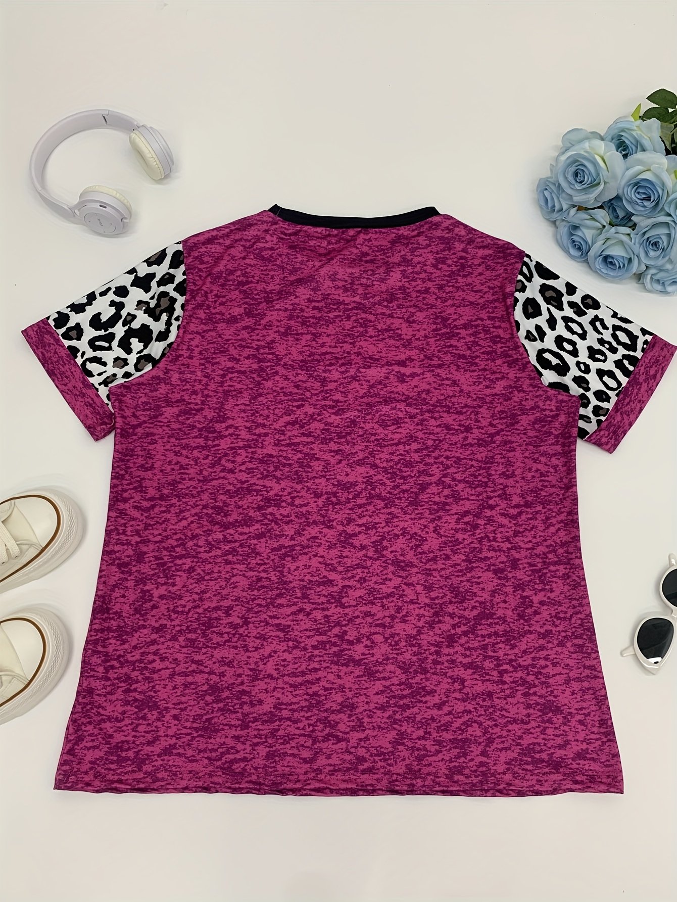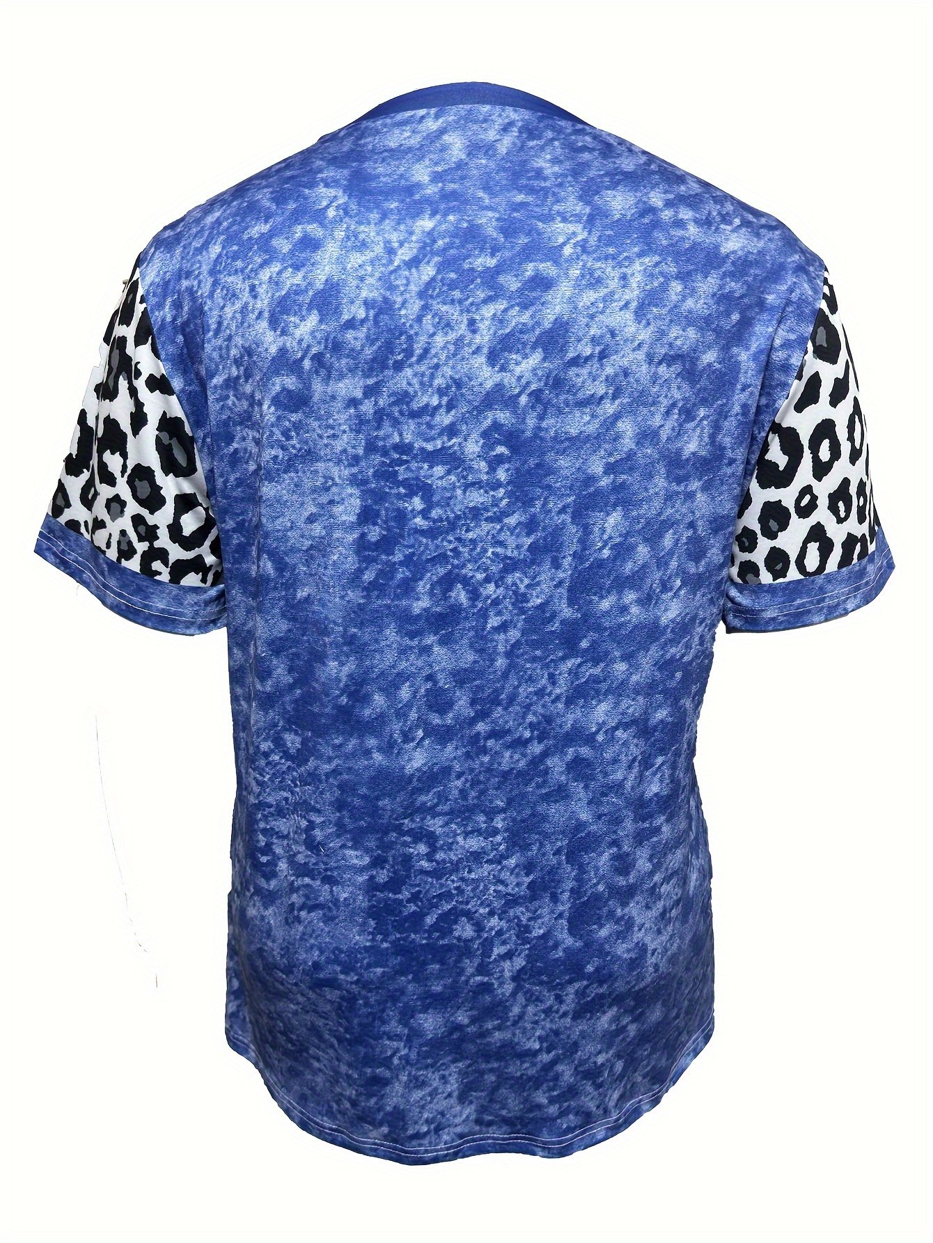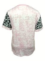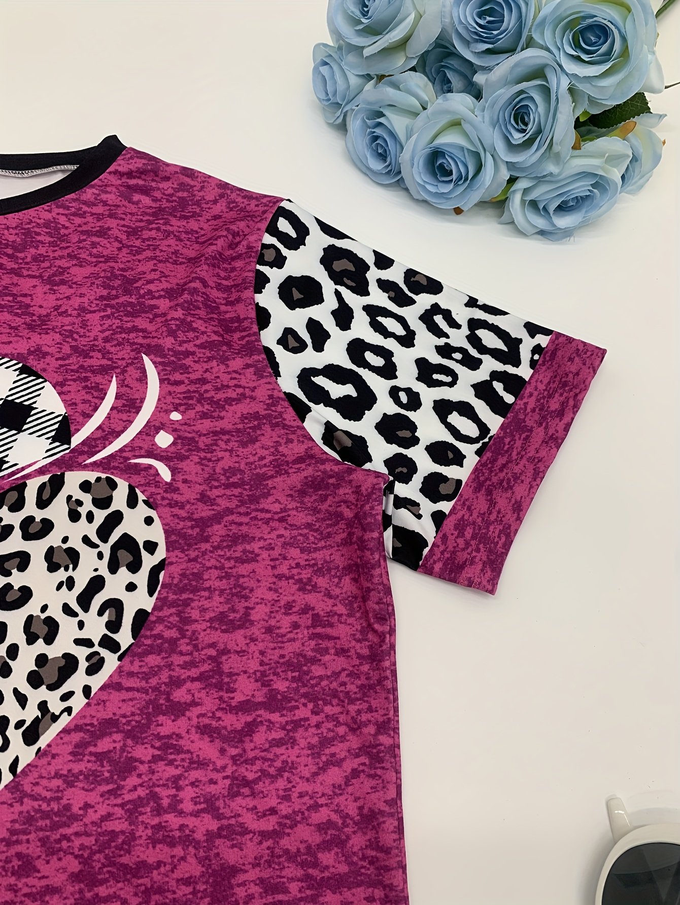 Camiseta Feminina Plus Size e/ou OverSized Fashion Com Estampa Tie-Dye de Corações – Gola Redonda Casual, Elasticidade Média, Blusa da Moda Primavera / Verão / Outono / Inverno Com Estampa de Leopardo e Corações Com Glitter.