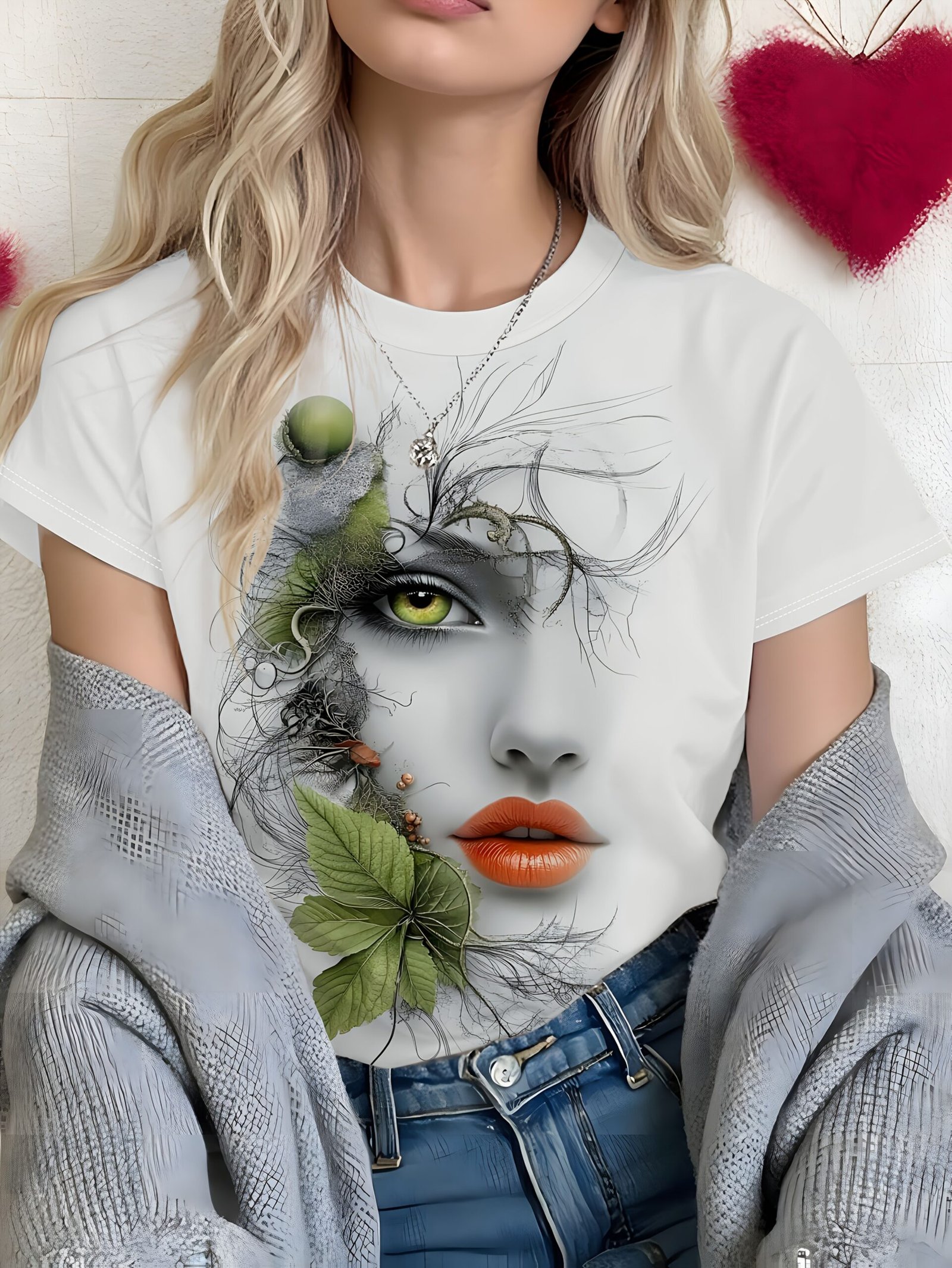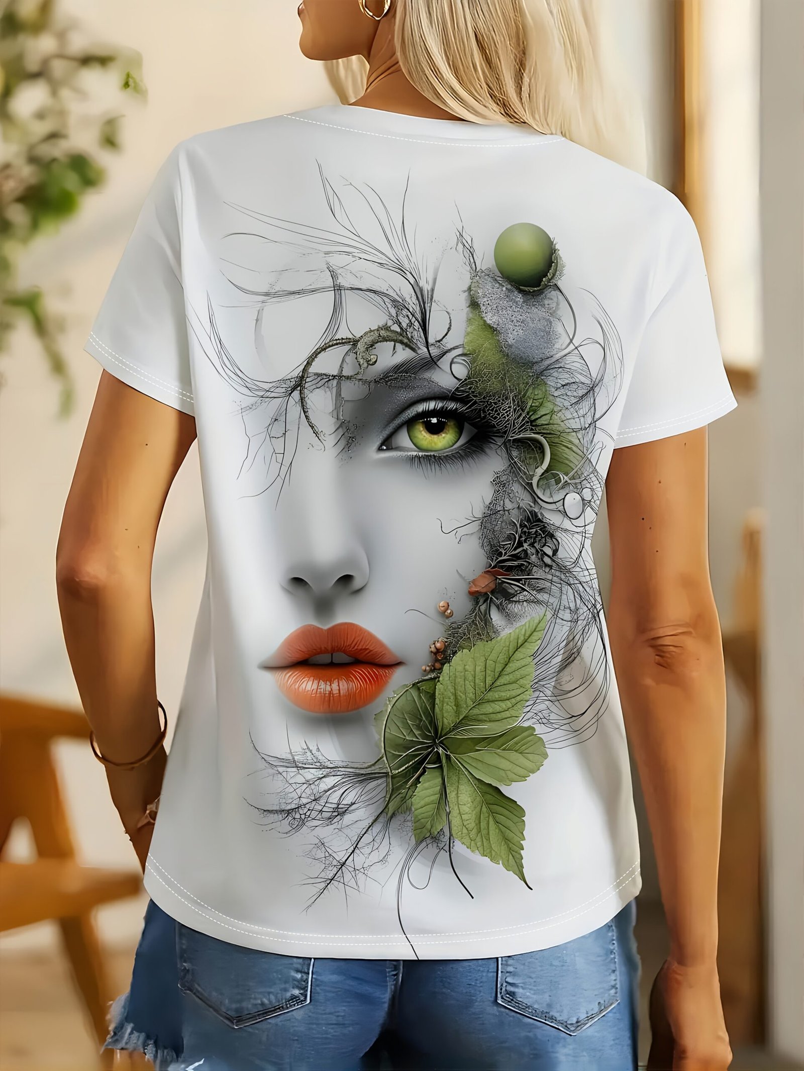 Camiseta Feminina Plus Size e/ou OverSized Fashion de Arte Vanguardista – Estampa Exclusiva de Rosto de Planta Com Folhas e Trepadeiras Verdes, Manga Curta, Gola Redonda, 100% Poliéster, Lavável à Máquina, Design Moderno e Criativo, Roupa para Todas as Estações | Camiseta Com Estampa Artística | Durável.