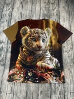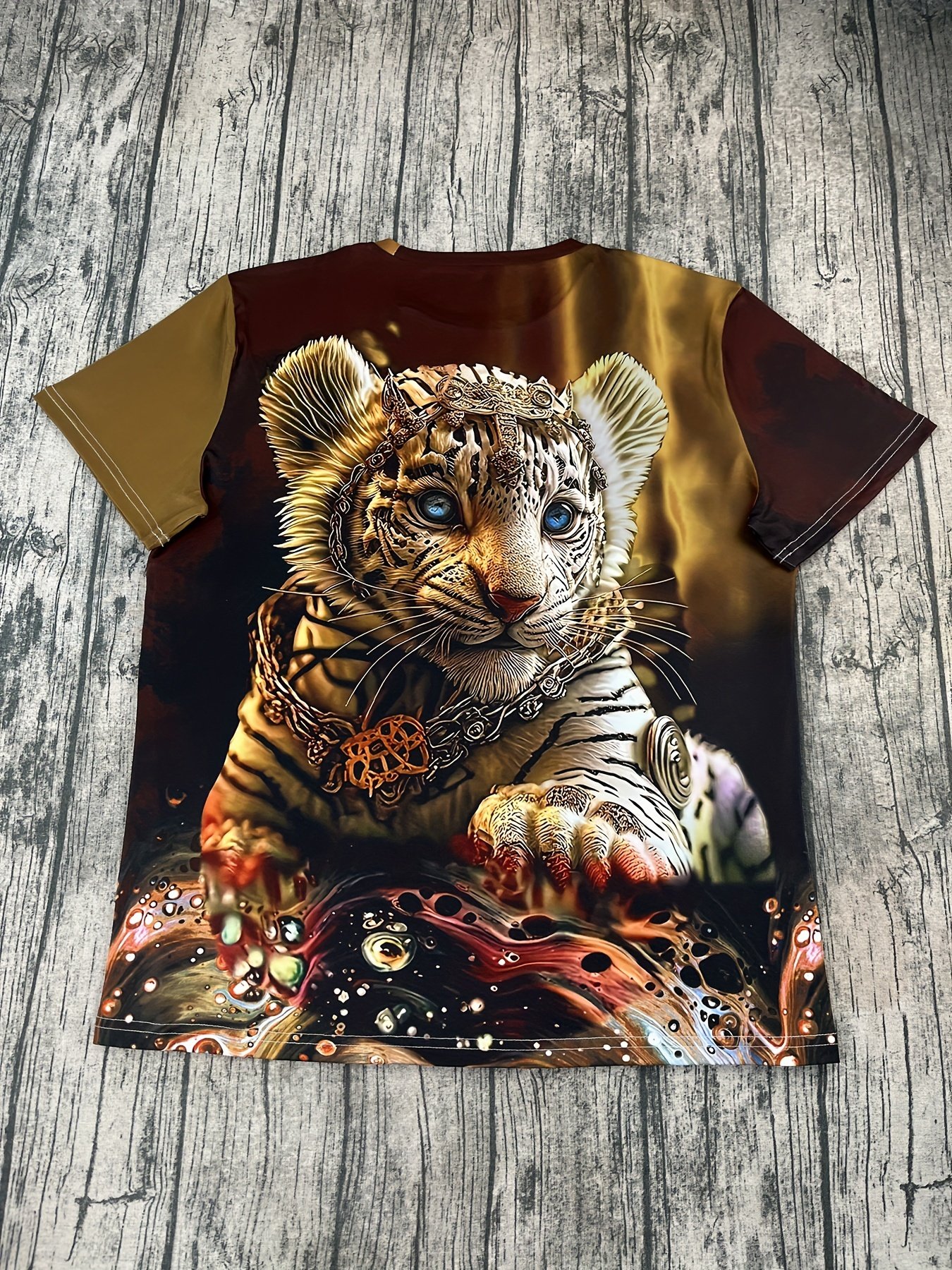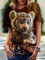 Camiseta Feminina Plus Size e/ou OverSized Fashion de Gola Redonda Com Estampa de Tigre – Blusa Casual de Manga Curta Com Estampa Vibrante de Tigre por Toda a Peça, Tecido Elástico e Respirável, Lavável à Máquina, Peça Casual e Moderna, Camiseta Com Estampa Detalhada.