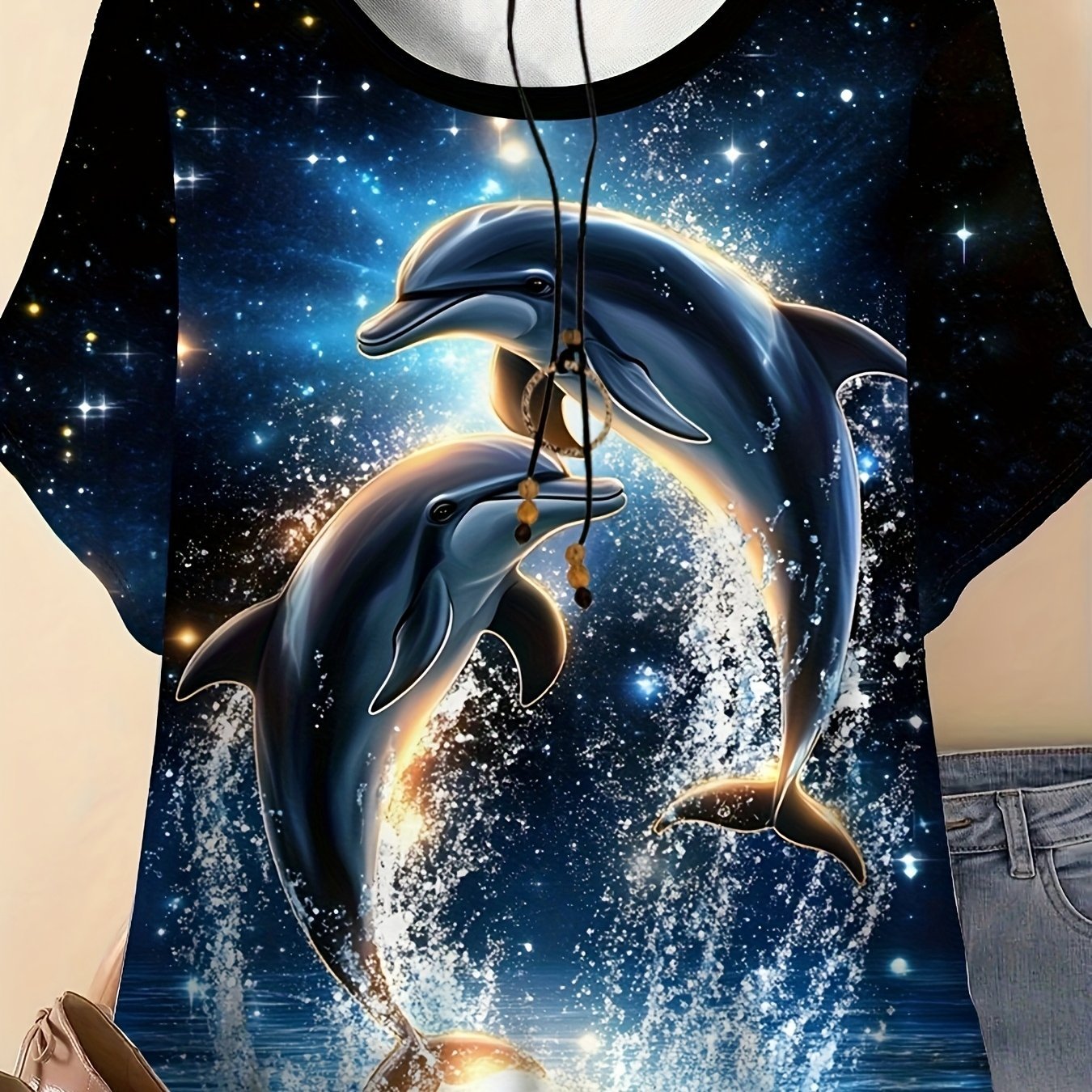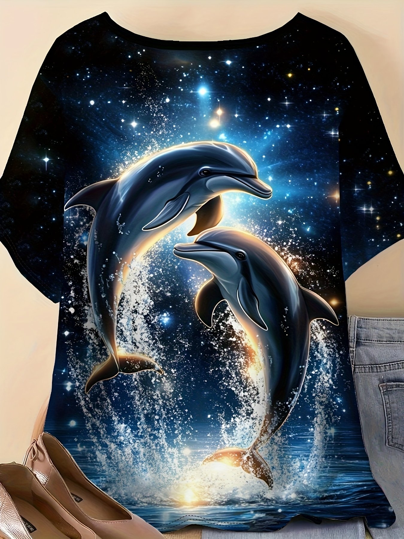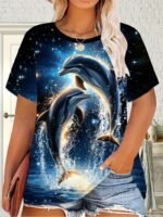 Camiseta Feminina Plus Size E/ou Oversized Fashion de Gola Redonda Com Estampas Divertidas de Golfinhos e Céu Estrelado. Esta Camiseta Casual e Confortável é Perfeita para a Primavera / Verão / Outono / Inverno.