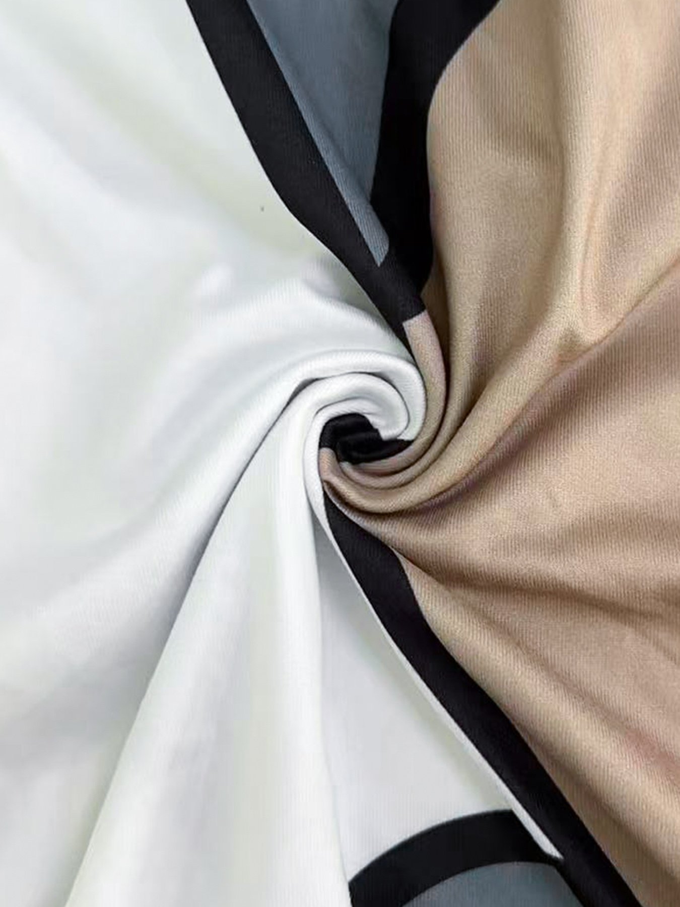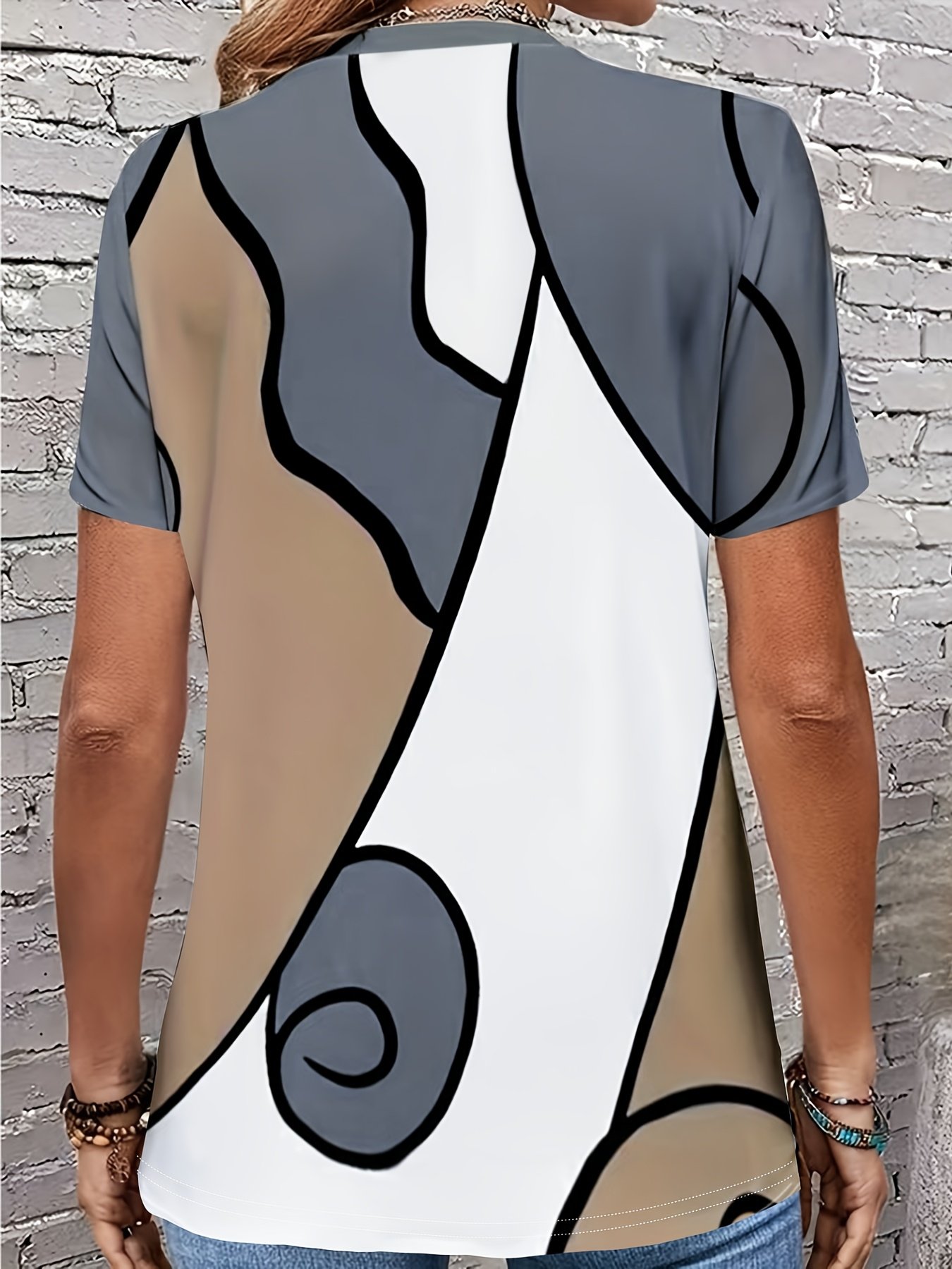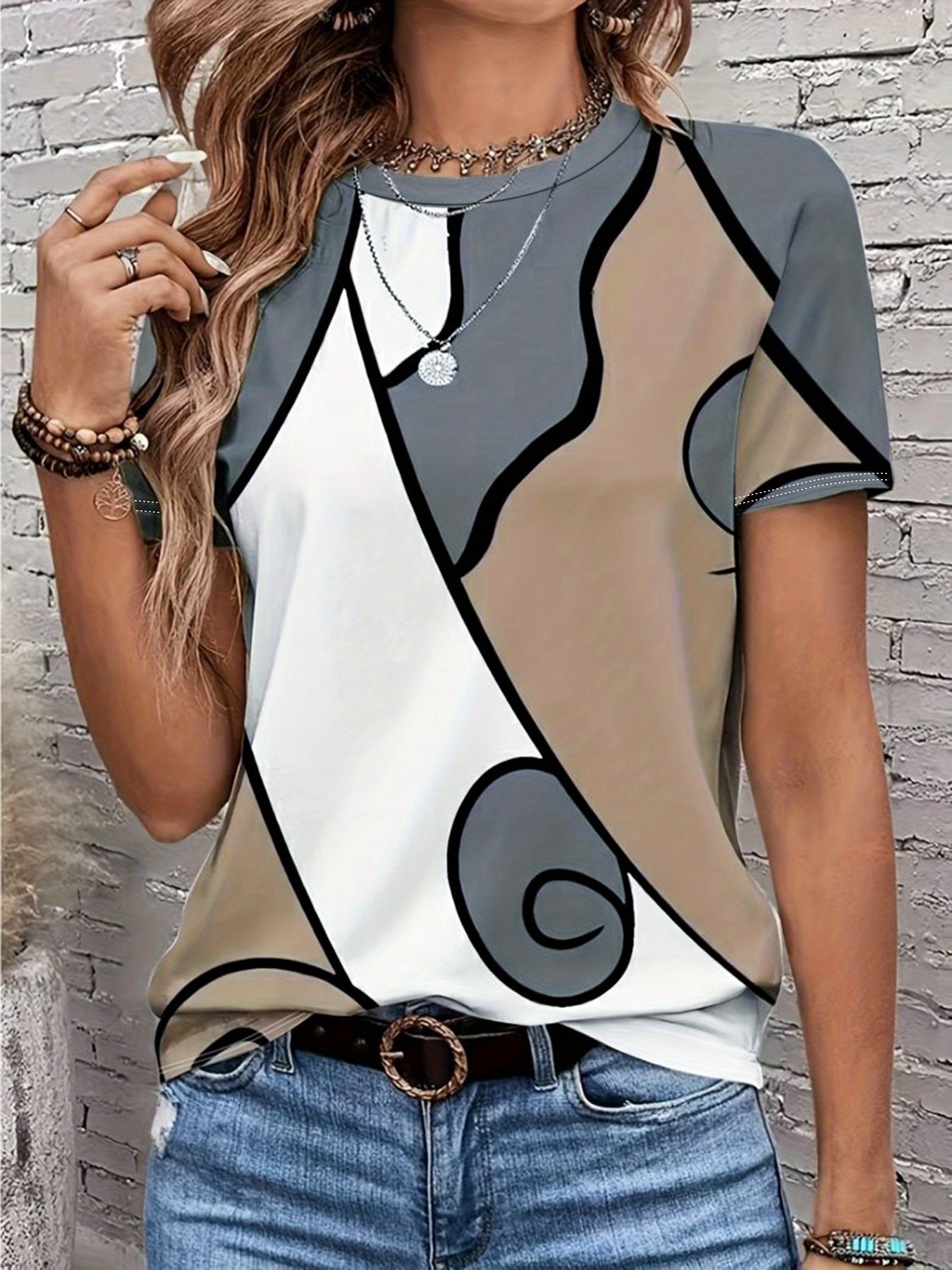 Camiseta Feminina Plus Size e/ou OverSized Fashion de Manga Curta Com Estampa Geométrica Abstrata, Modelagem Relaxada – Camiseta Moderna e Casual Com Gola Redonda, Elasticidade Média, Lavável à Máquina, Confortável para Todas as Estações, Ideal para o Dia a Dia, Design Artístico, Tecido Macio e Estilo Artístico.