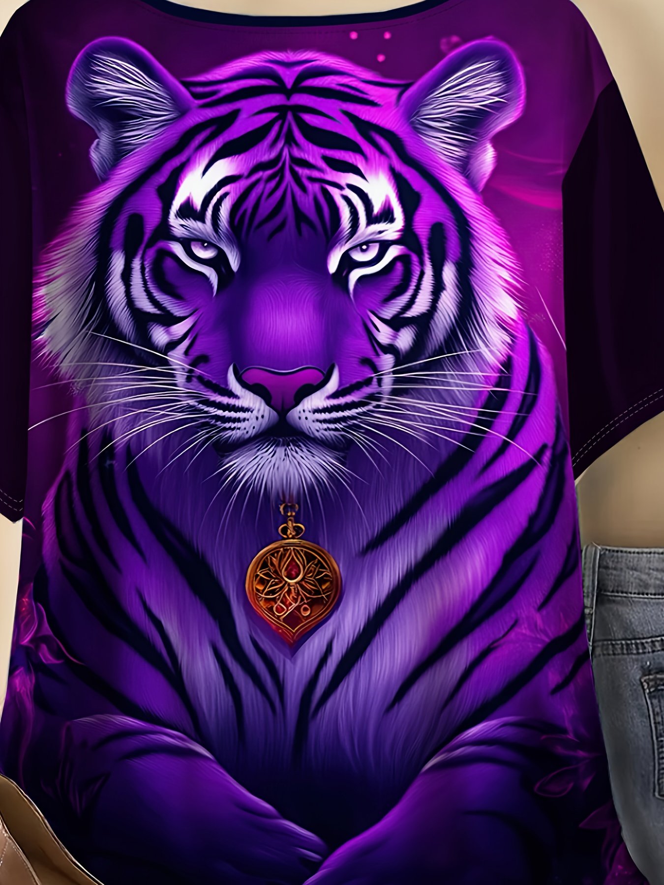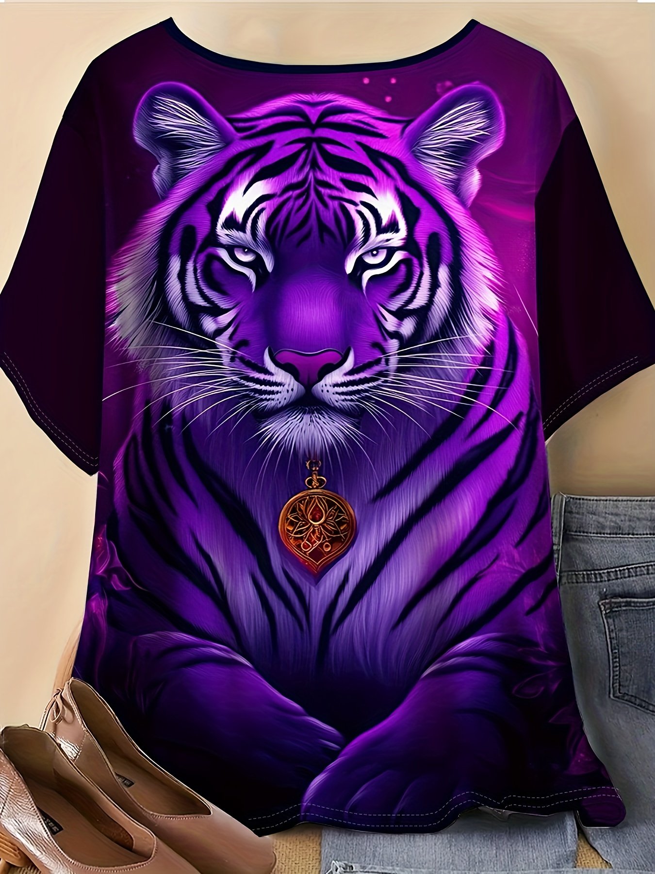 Camiseta Feminina Plus Size e/ou OverSized Fashion Elegante Com Estampa Floral e de Tigre Roxo – Camiseta Com Estampa Marcante de Tigre, Tecido Macio e Respirável para Looks Casuais e Formais – Blusa Não Transparente – Lavável à Máquina. Roupas Femininas, Roupas Com Estampa de Tigre, Roupa Casual, Artista.