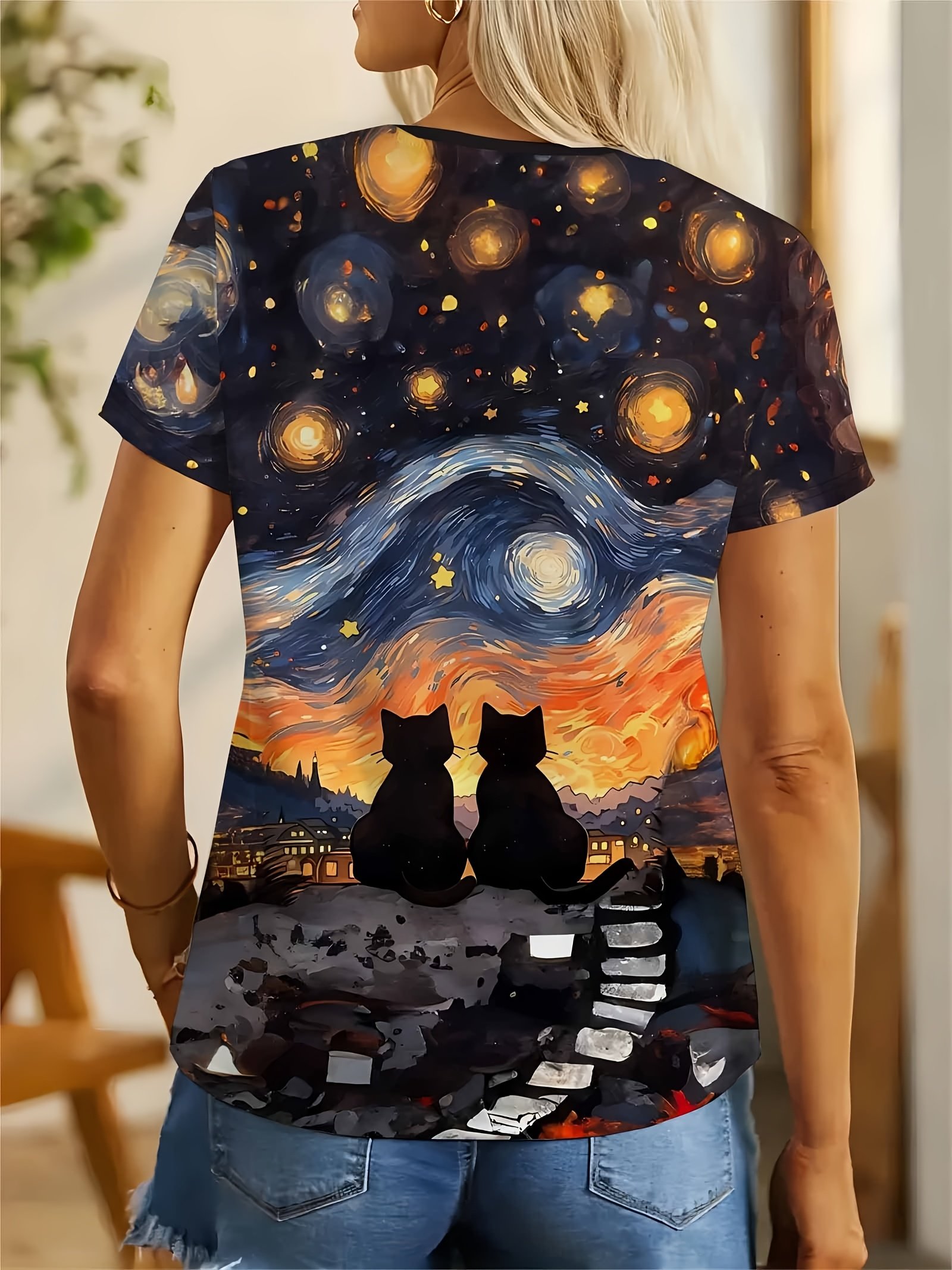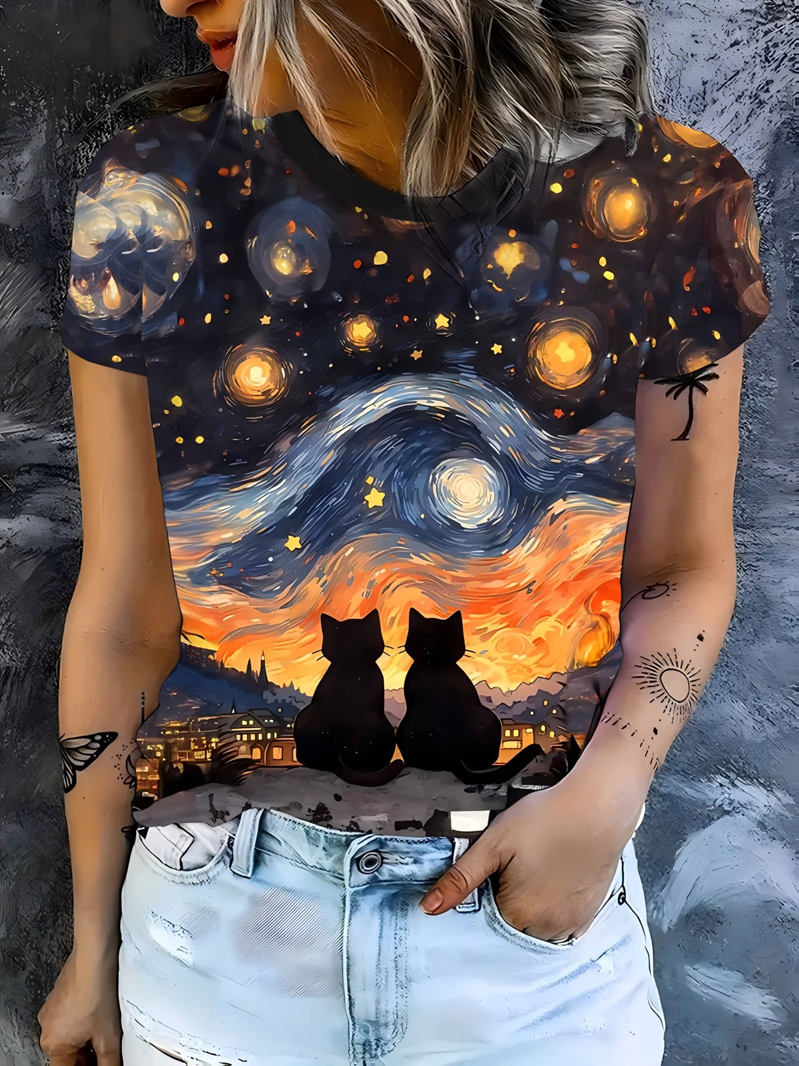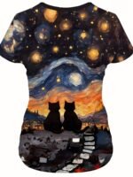 Camiseta Feminina Plus Size e/ou OverSized Fashion Estampa Sem Textura, Estampa de Gato, Casual e Confortável de Gola Redonda, Elegante.