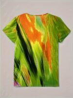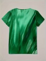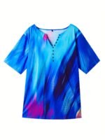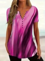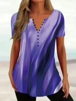 Especificações: Estilo da Gola: Decote Em "V" Composição: 95% Poliéster; 5% Elastano Detalhes: Botões Decorativos Tecido: Levemente Elástico Material: Poliéster Instruções de Lavagem: Lavar à Máquina, Não Lavar a Seco Estampa: Geométrica Tipo de Estampa: Estampa Em Pontos Estação: Todas as Estações Transparência: Não Comprimento da Manga: Manga Curta Estilo: Casual Método de Tecelagem: Malha