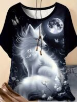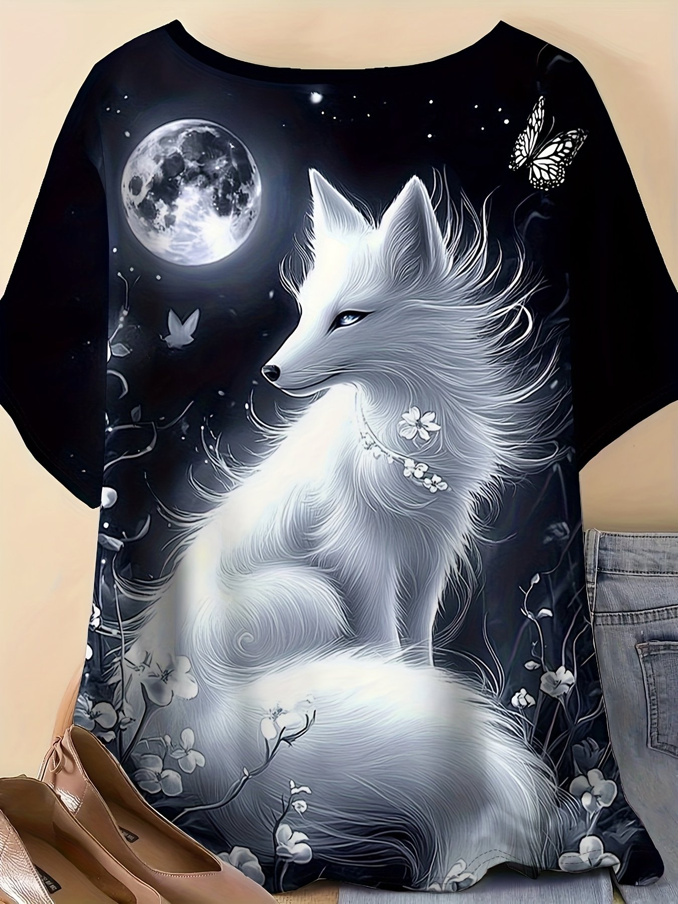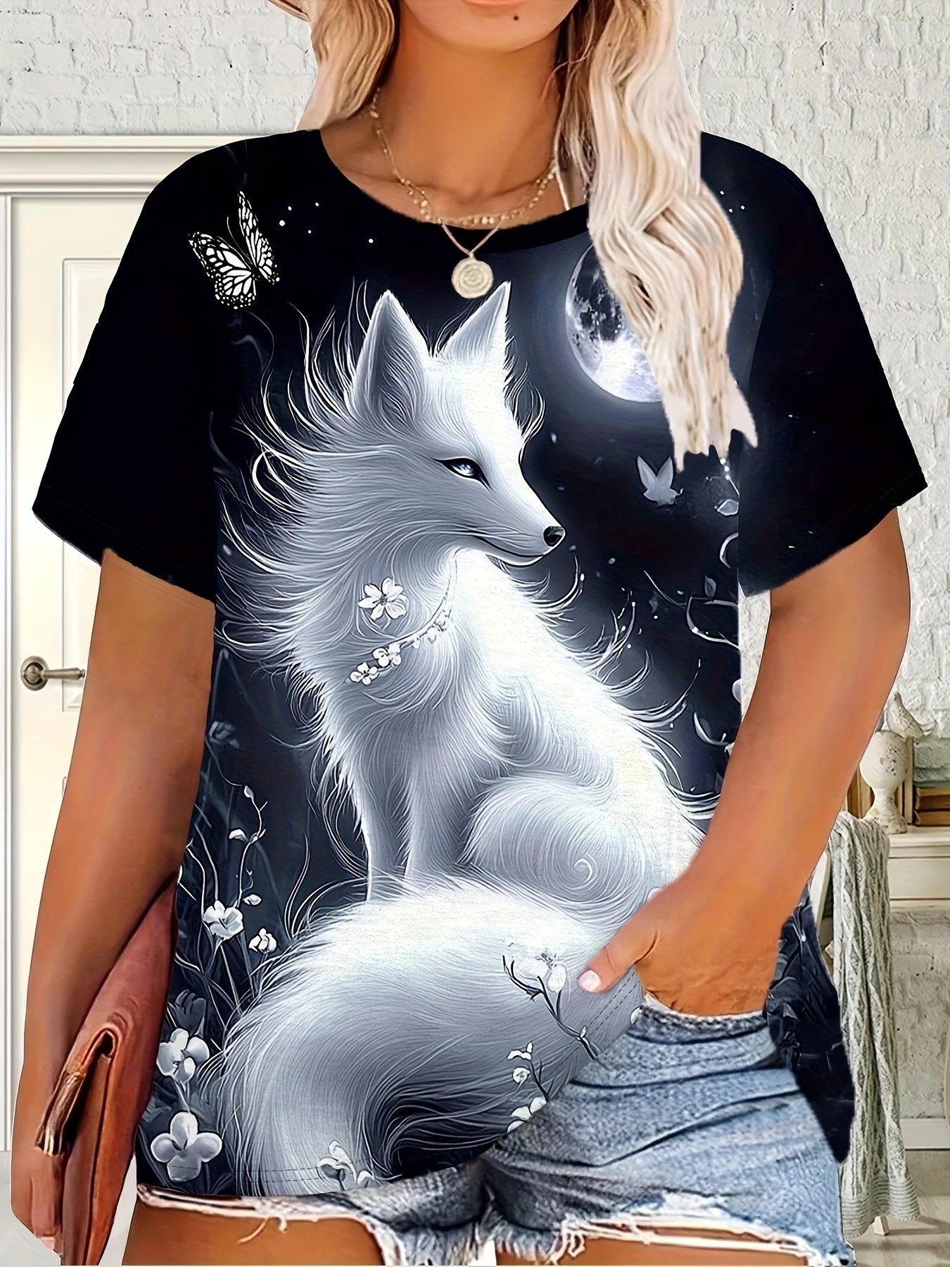 Camiseta Feminina Plus Size e/ou OverSized Fashion Vintage Com Estampa de Raposa Em 3D, Gola Redonda, Manga Curta, Casual e Confortável.