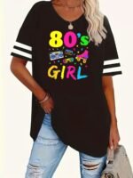 Camiseta Feminina Plus Size e/ou OverSized FashionCom Estampa, Gola Redonda, Mangas Curtas, Listras, Gola Canelada, Disponível nos Tamanhos 1 a 8 XL Com Letras.