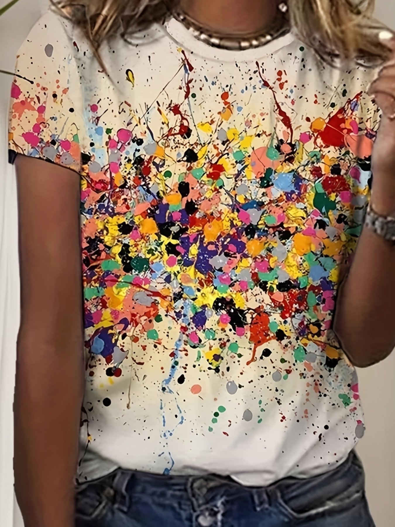 Especificações: Estilo da Gola: Gola Redonda Composição: 95% Poliéster; 5% Elastano Elasticidade do Tecido: Microelasticidade Comprimento: Regular Material: Poliéster Instruções de Lavagem: Lavável à Máquina, Não Lavar a Seco Estampa: Desenho Tipo de Estampa: Estampa Aleatória Estação: Todas Transparência: Não Estilo: Casual Método de Tecelagem: Malha