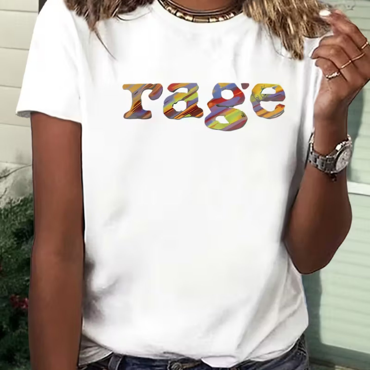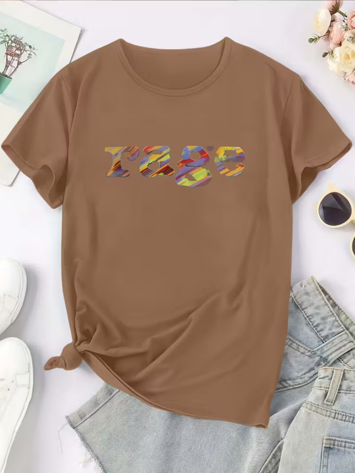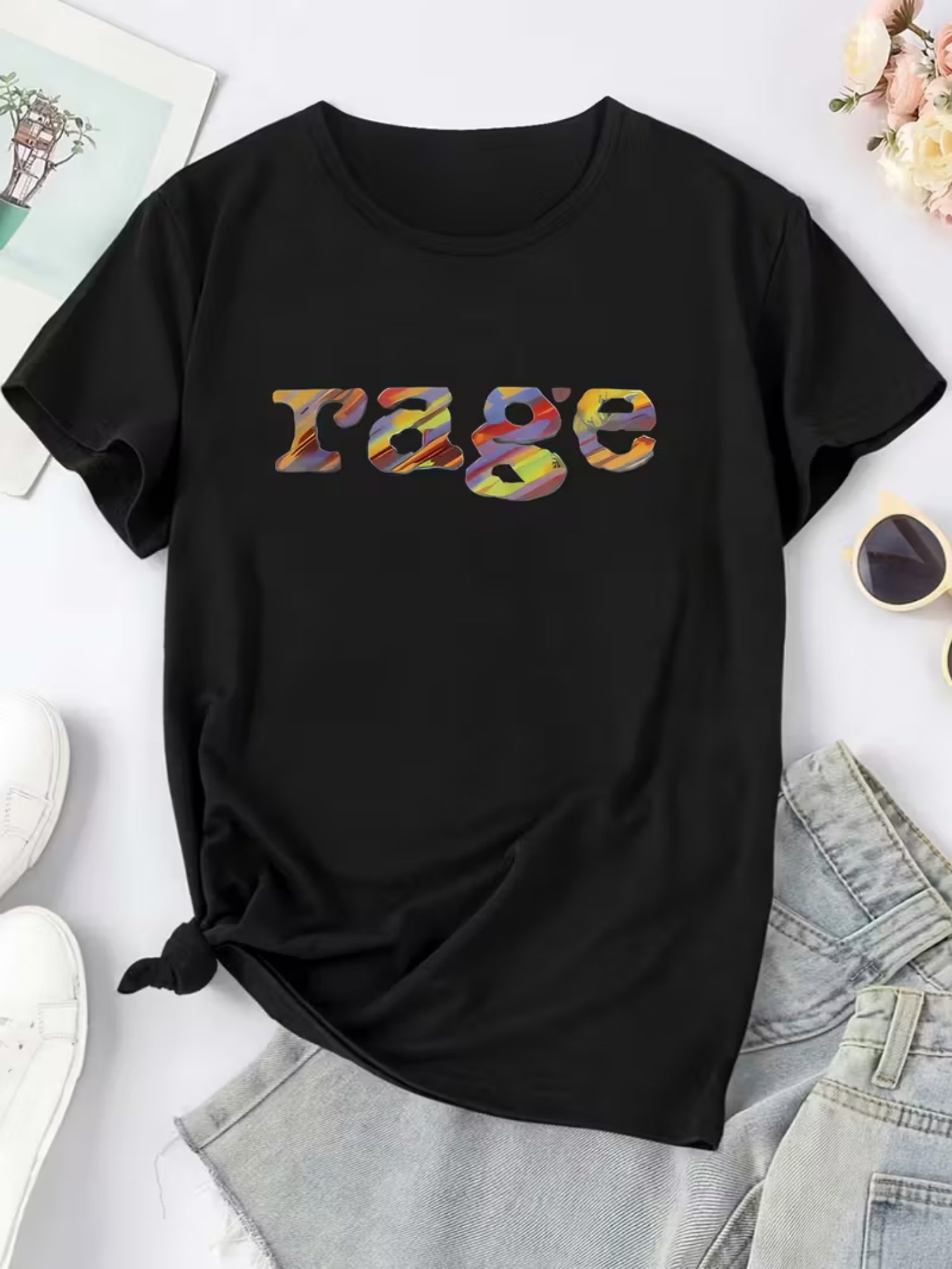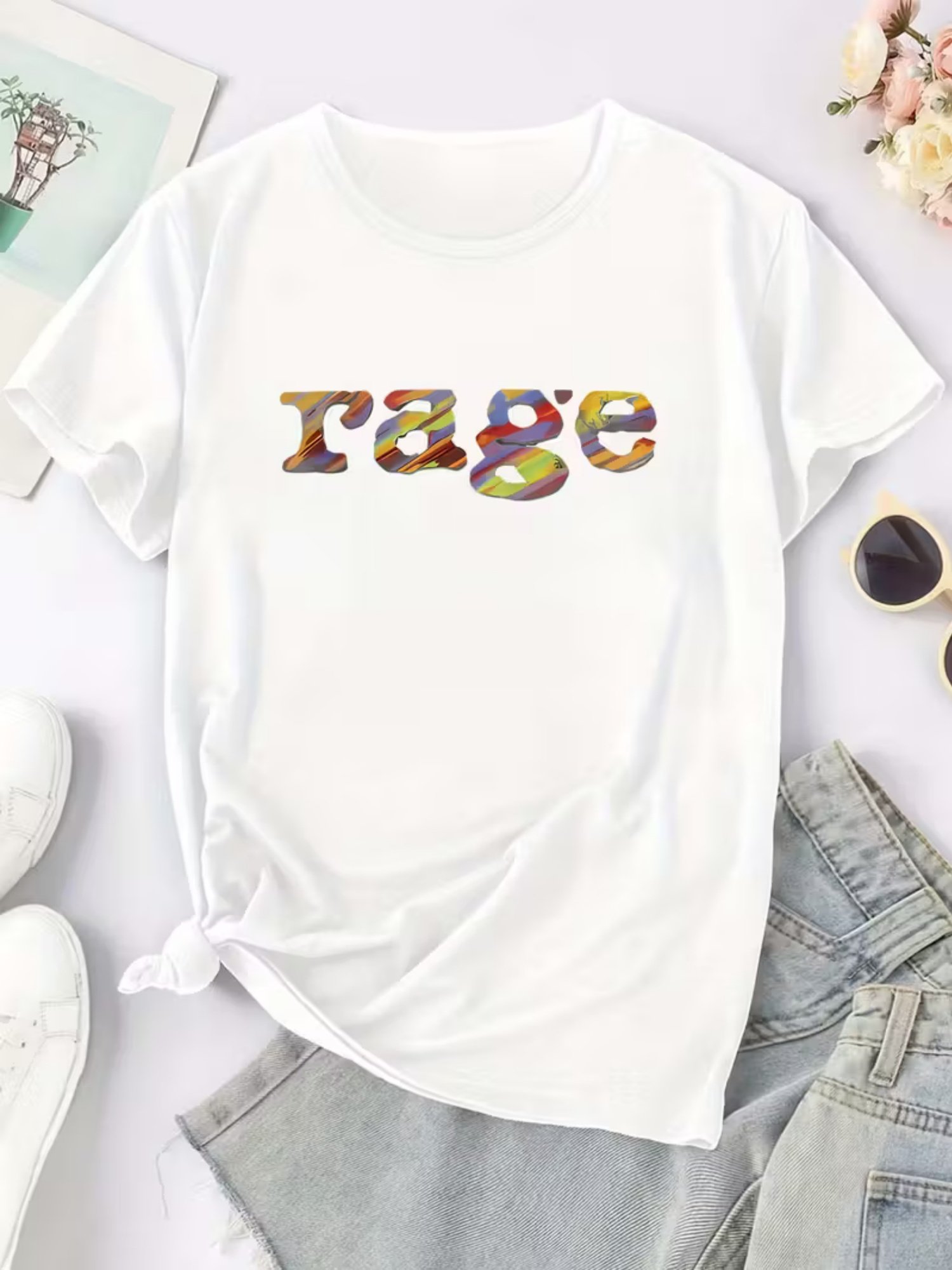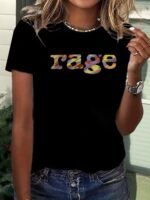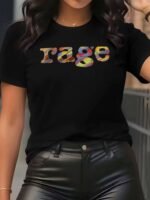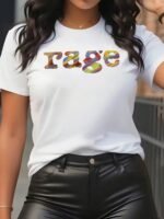 Camiseta Feminina Retrô Anos 90 Com Estampa Rage e Cores Icônicas dos Anos 90 ( Bege / Cassete / Cd / Vhs ) – Blusa Oversized Casual de Manga Curta e Gola Redonda, Tamanhos P ao GG – Look Nostálgico dos Anos 90 para Festas Temáticas e Uso Casual.