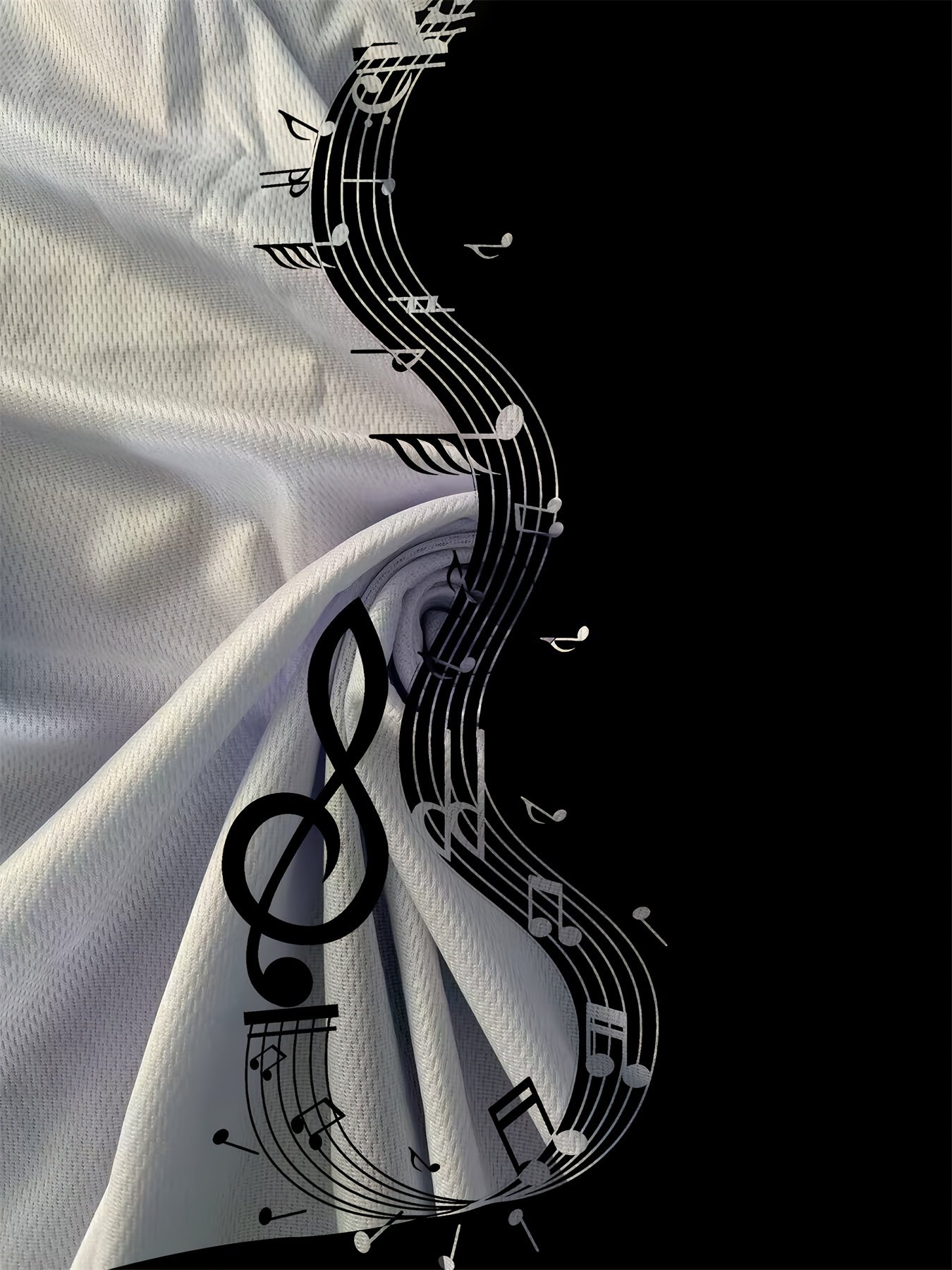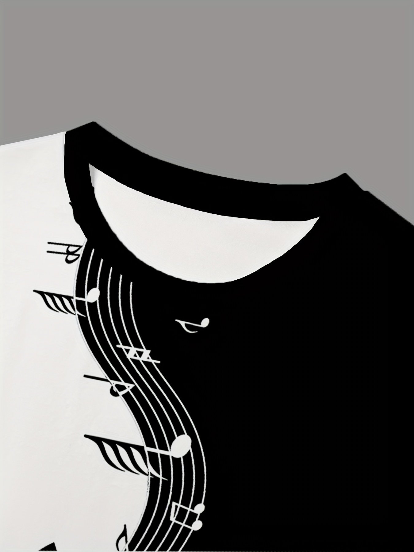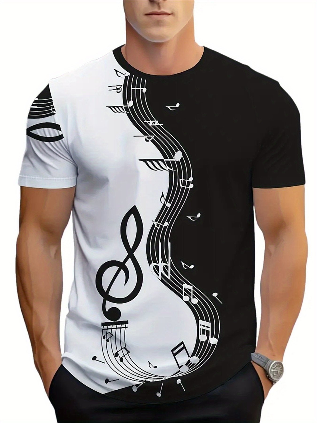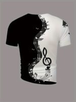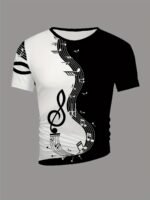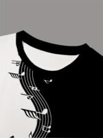 Camiseta Masculina de Manga Curta Oversized Com Estampa 3D de Notas Musicais, Estilo Streetwear, Modelagem Ampla, nas Cores Preto e Branco.