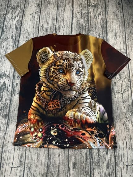 Camiseta Feminina Plus Size e/ou OverSized Fashion de Gola Redonda Com Estampa de Tigre – Blusa Casual de Manga Curta Com Estampa Vibrante de Tigre por Toda a Peça, Tecido Elástico e Respirável, Lavável à Máquina, Peça Casual e Moderna, Camiseta Com Estampa Detalhada.
