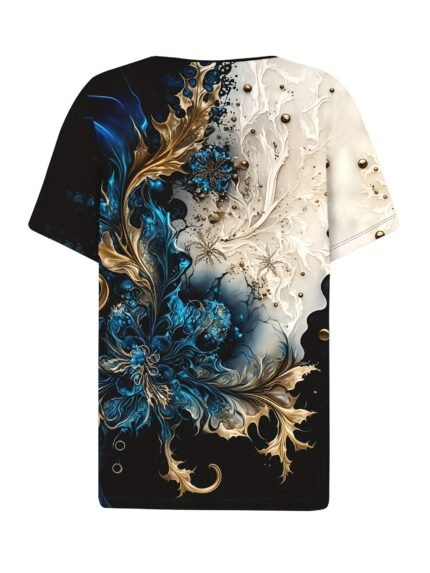 Camiseta Feminina Plus Size e/ou OverSized Fashion de Primavera / Verão / Outono / Inverno Com Estampa Geométrica Abstrata 3D, Decote Em “V”, Manga Curta e Modelagem Solta.