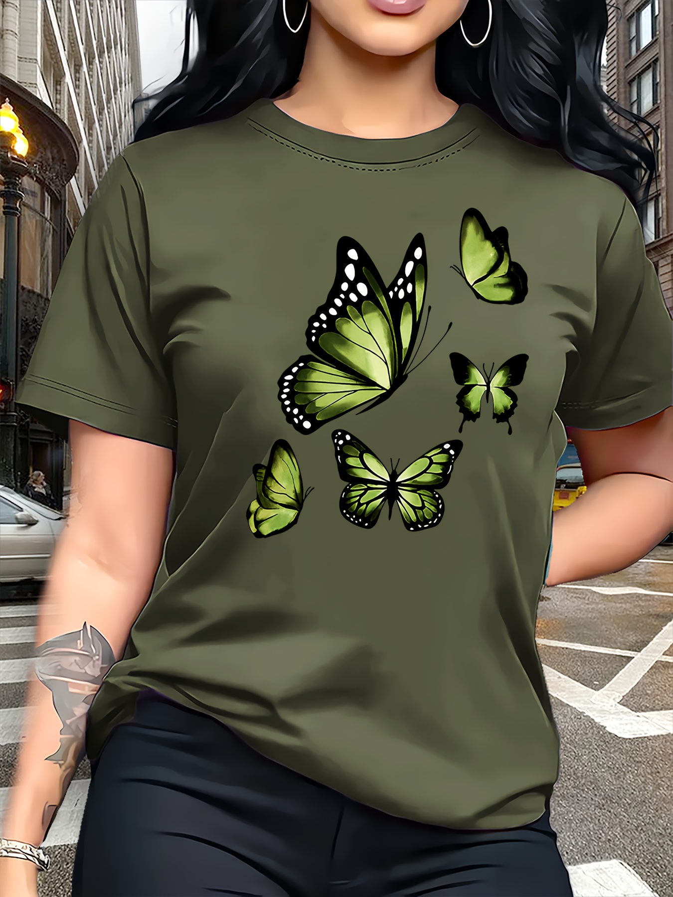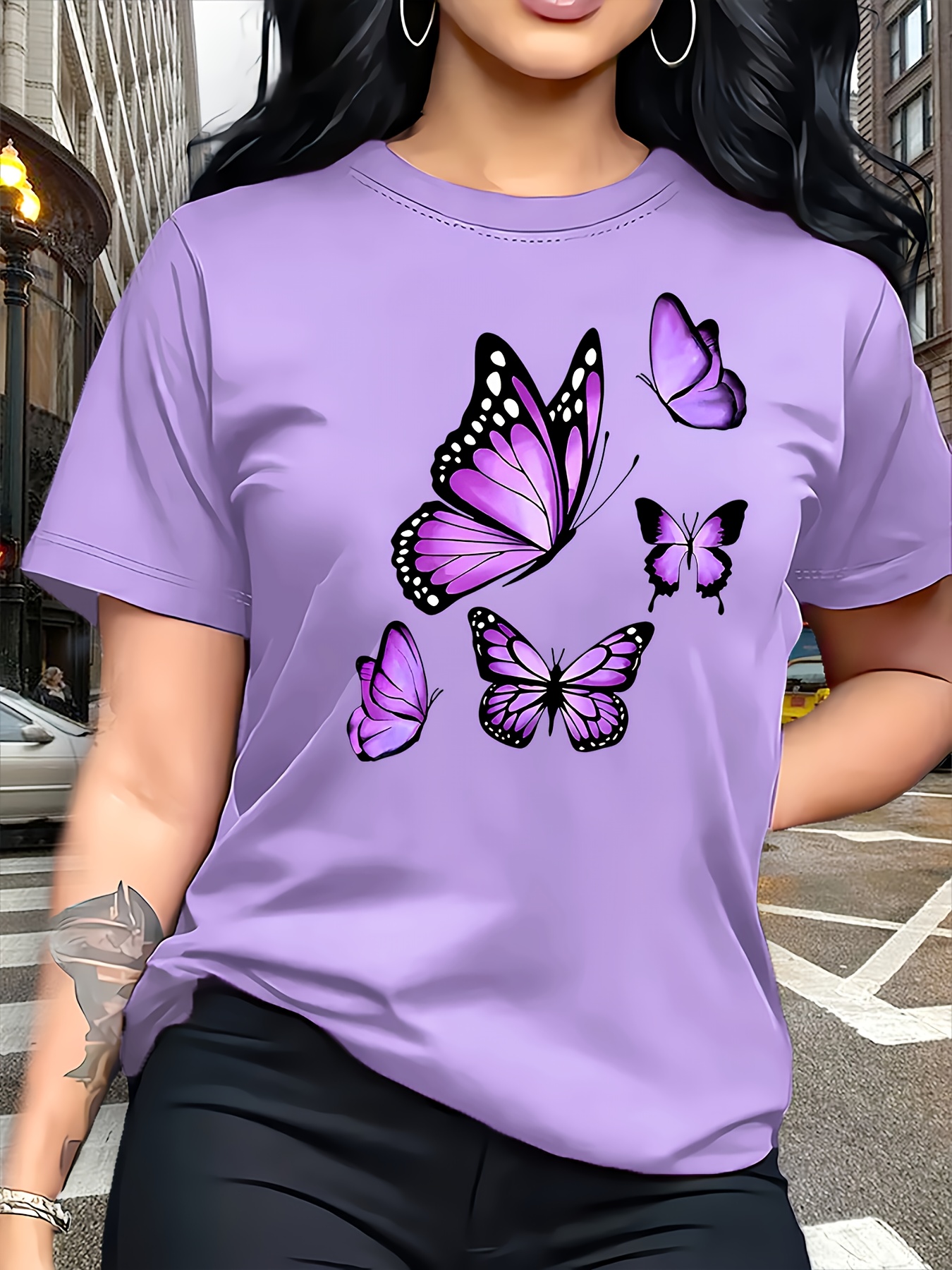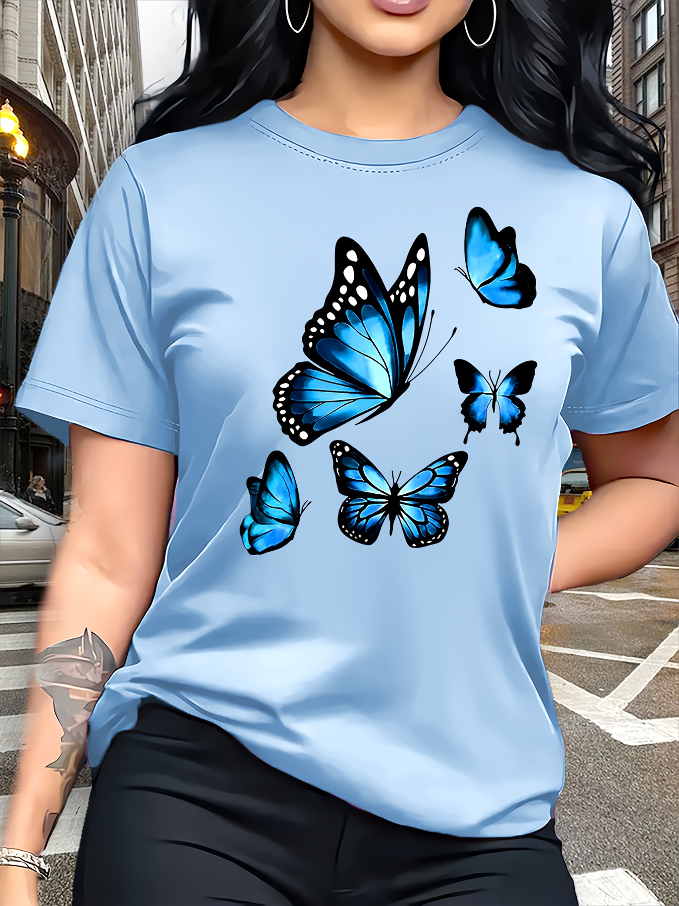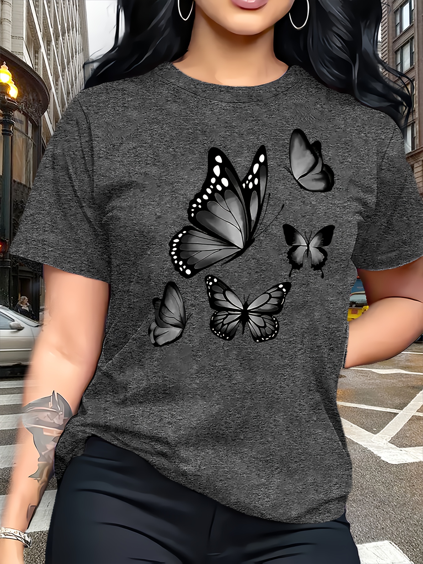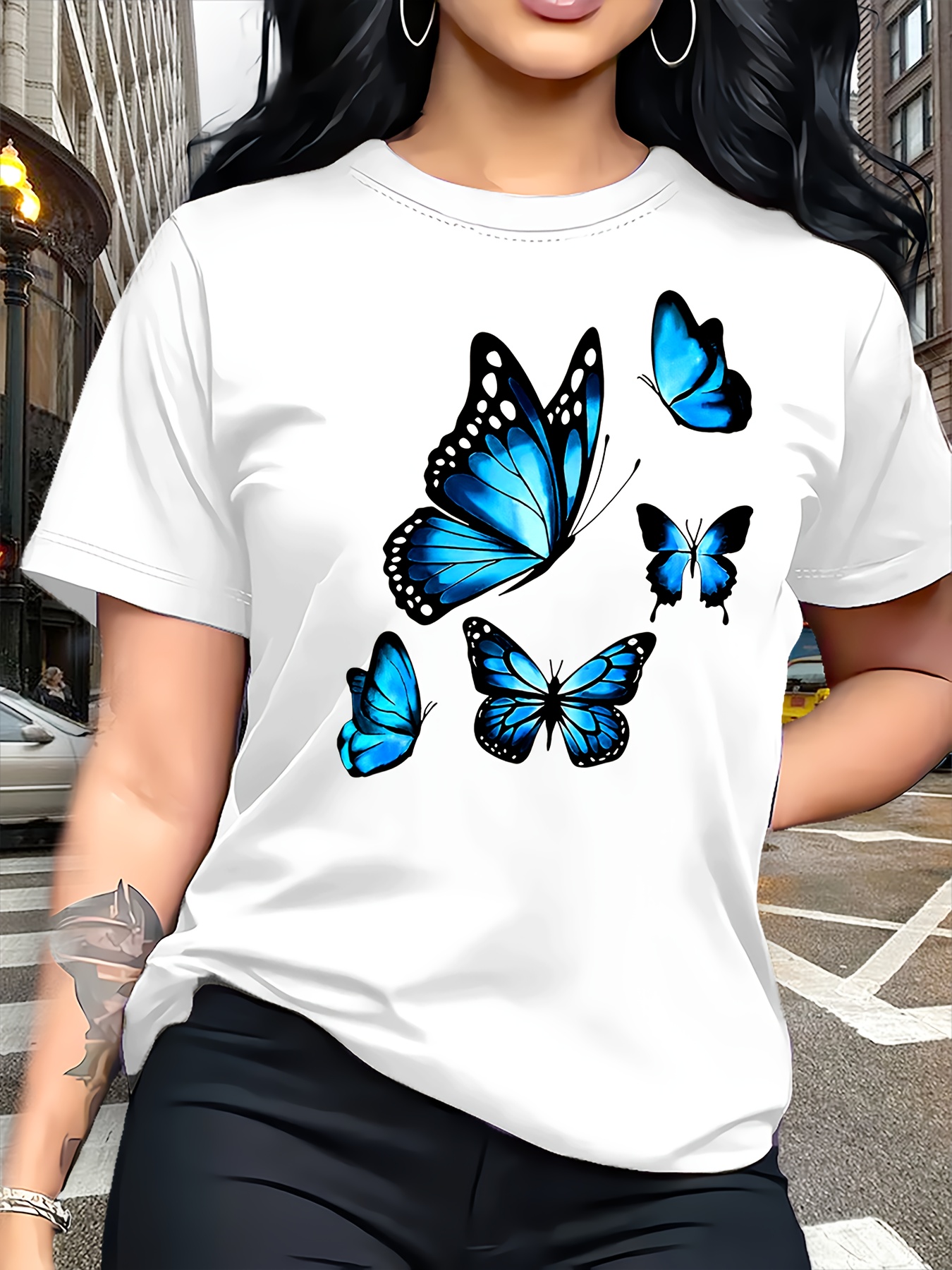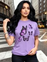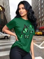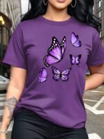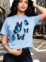 Camiseta Plus Size e/ou OverSized Feminina Chic Com Estampa de Borboletas - Manga Curta, Gola Redonda, Confortável, Respirável e Macia.