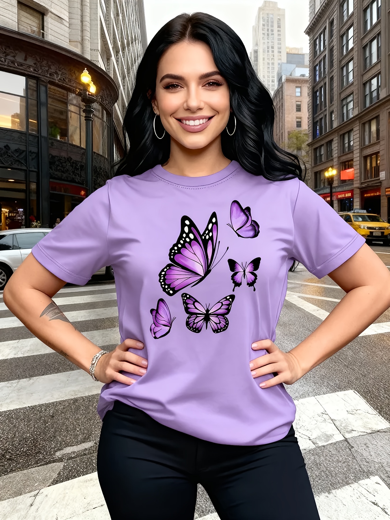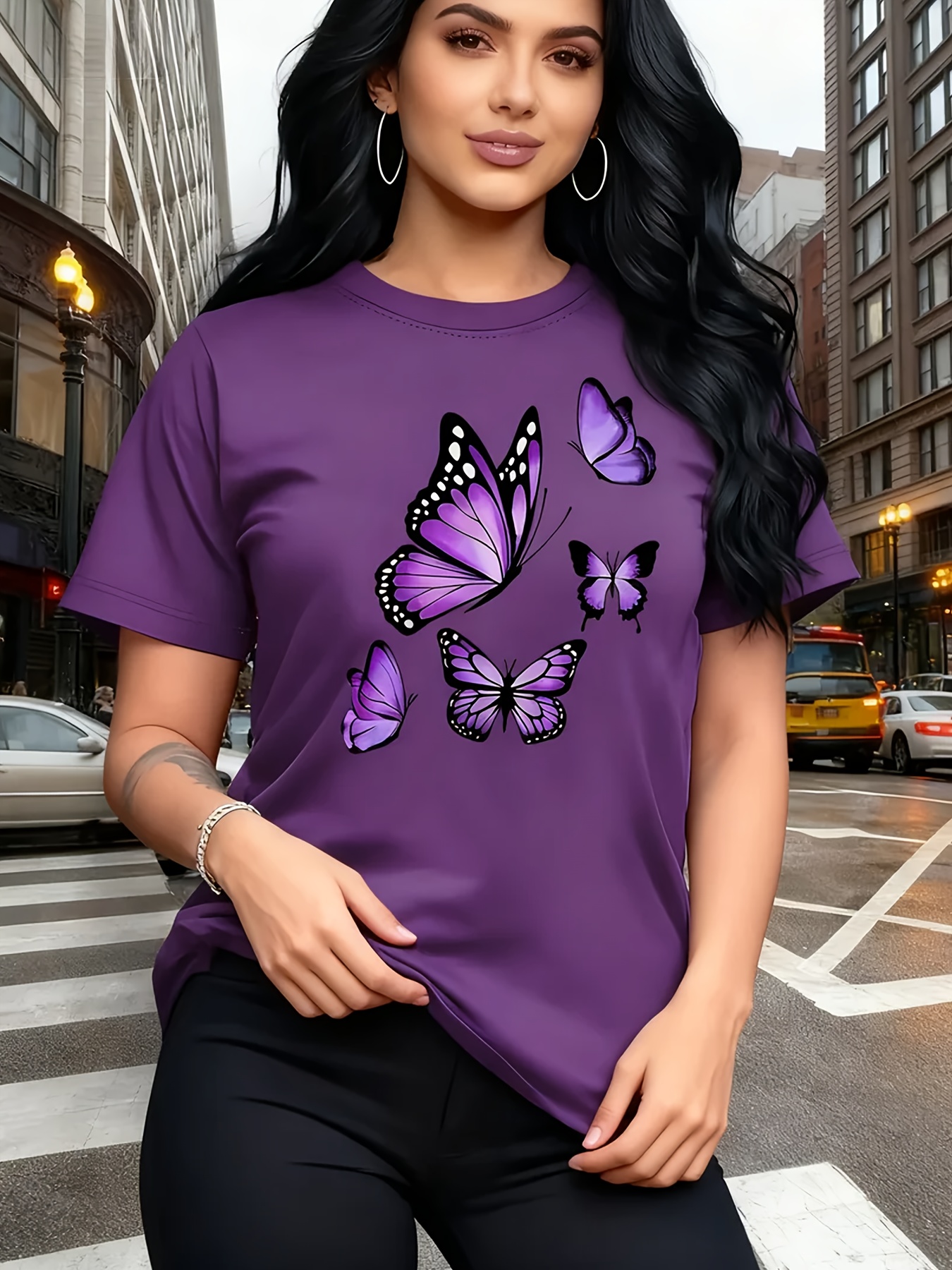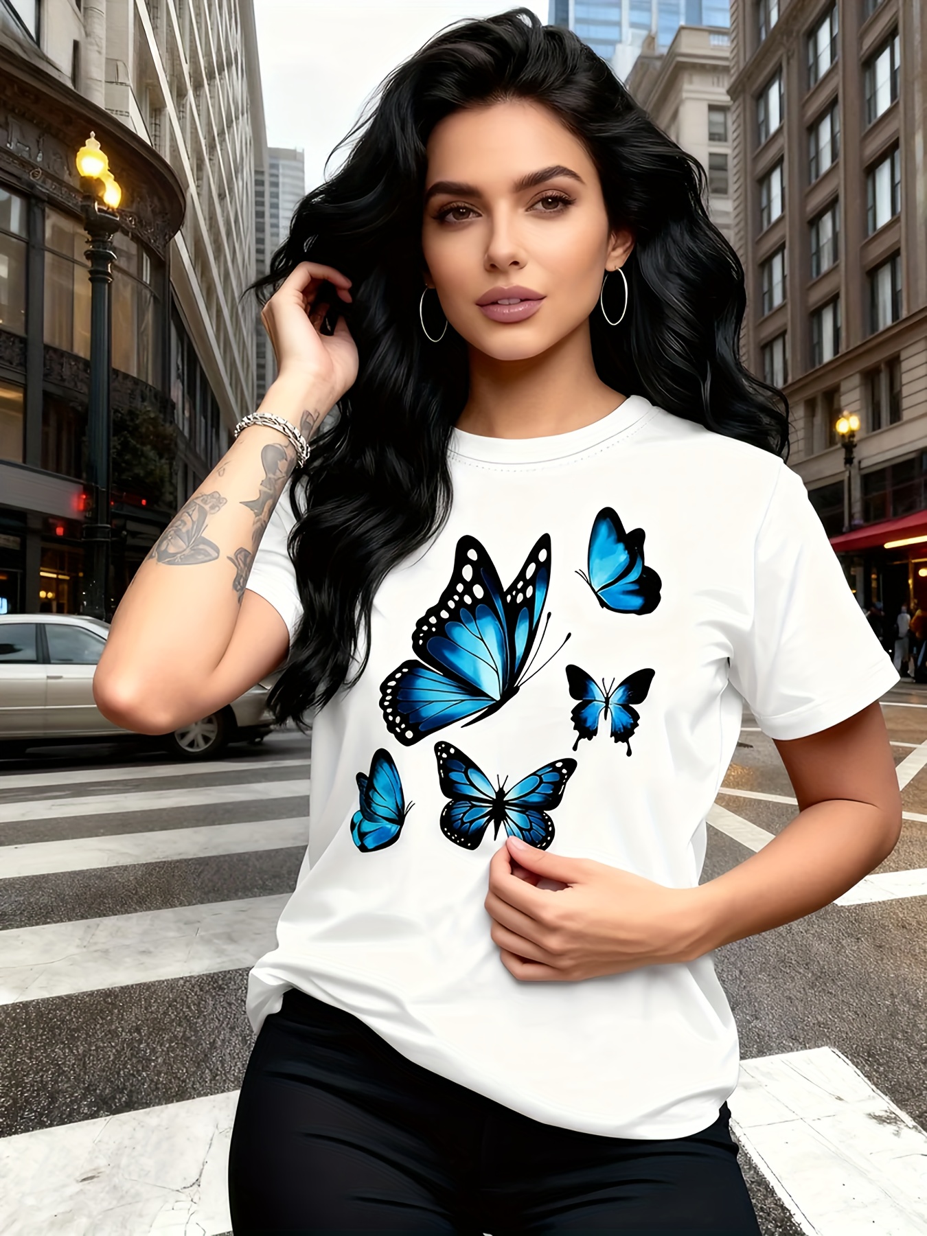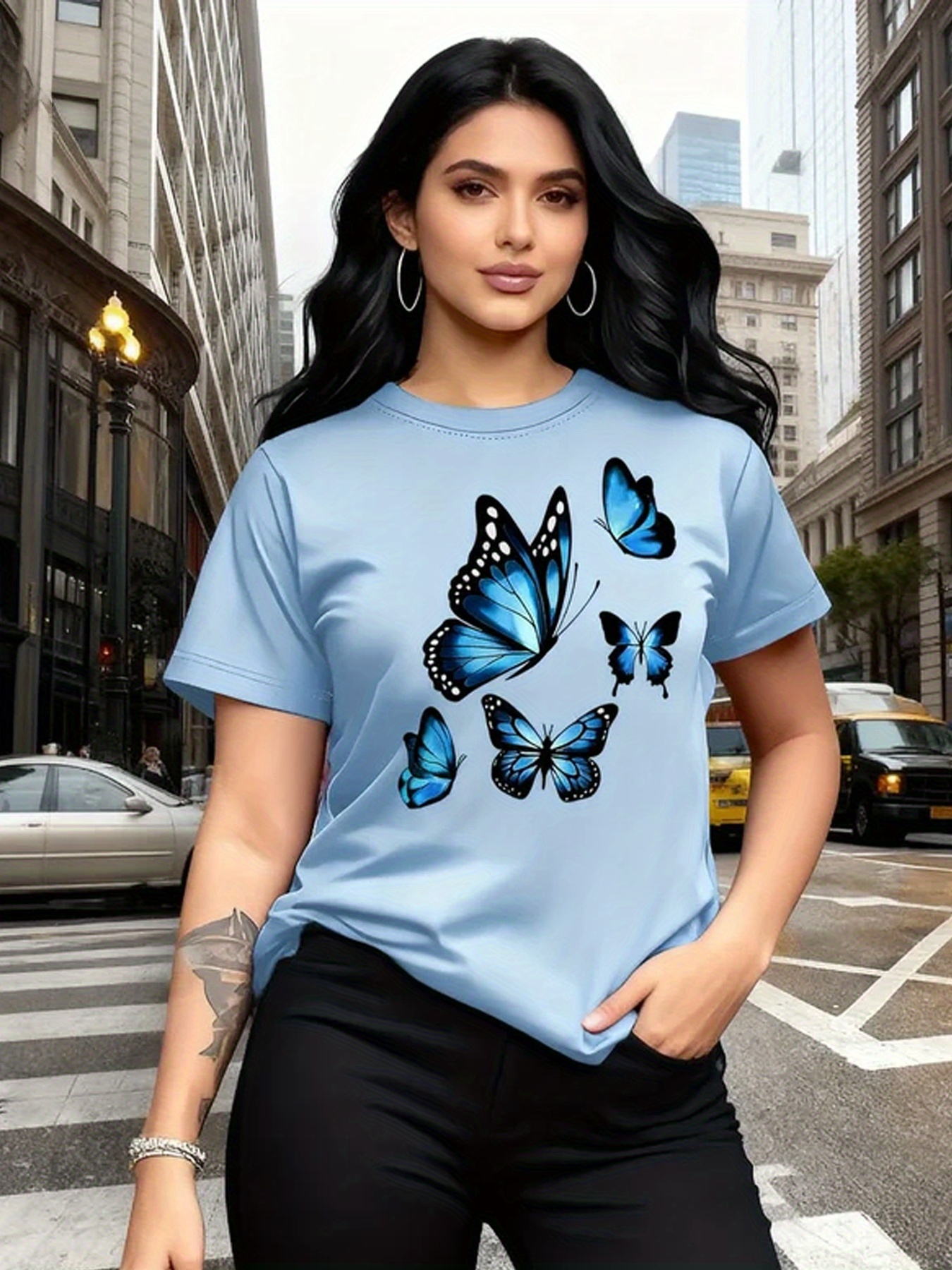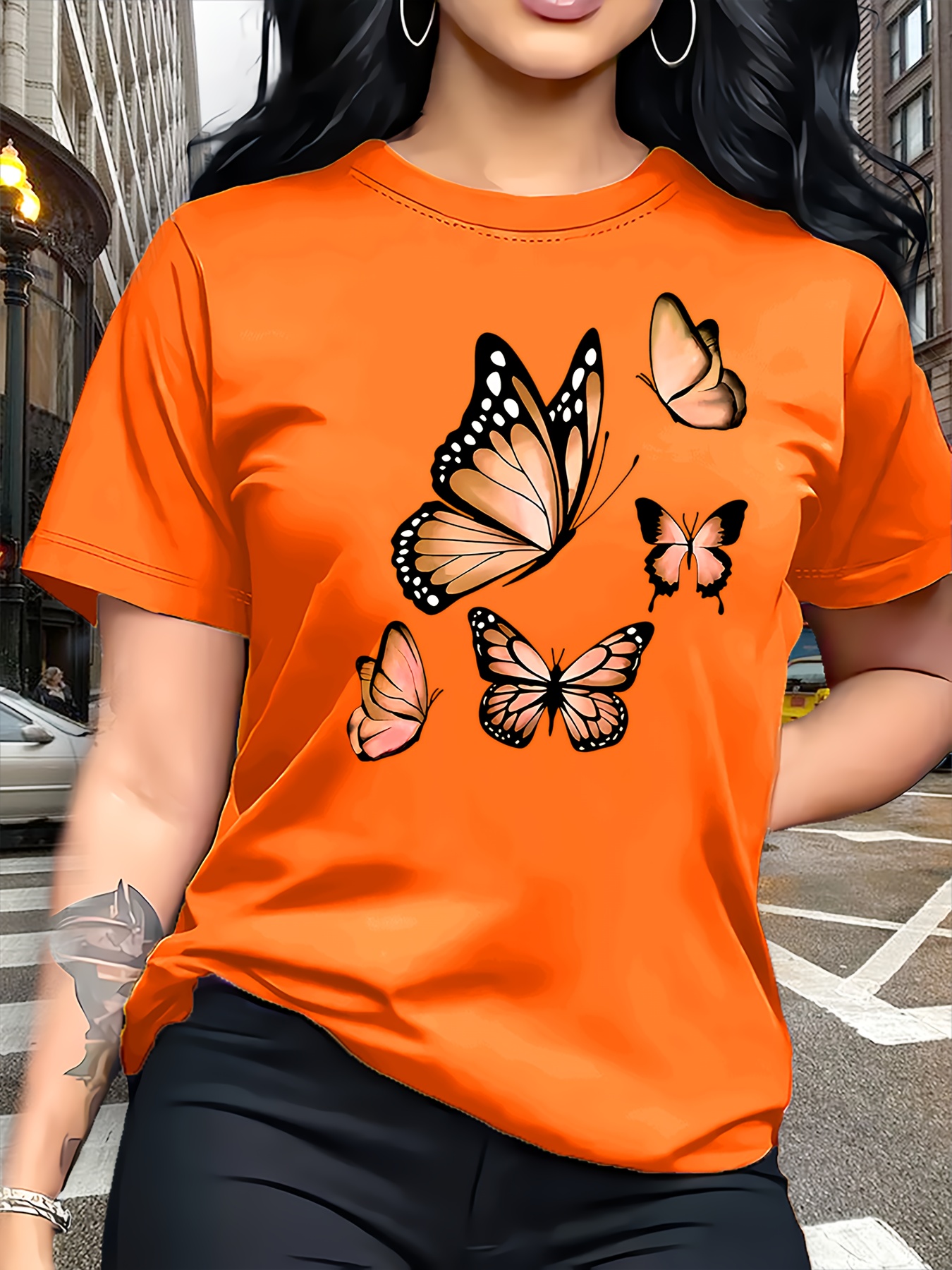 Camiseta Plus Size e/ou OverSized Feminina Chic Com Estampa de Borboletas - Manga Curta, Gola Redonda, Confortável, Respirável e Macia.