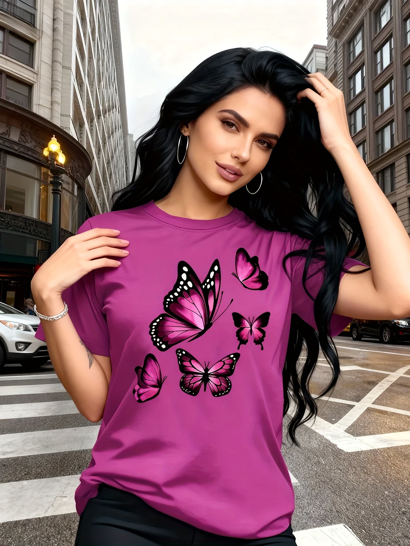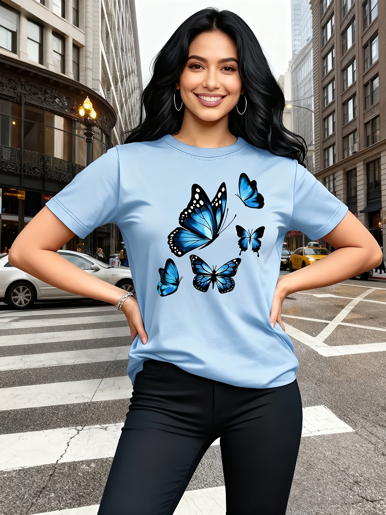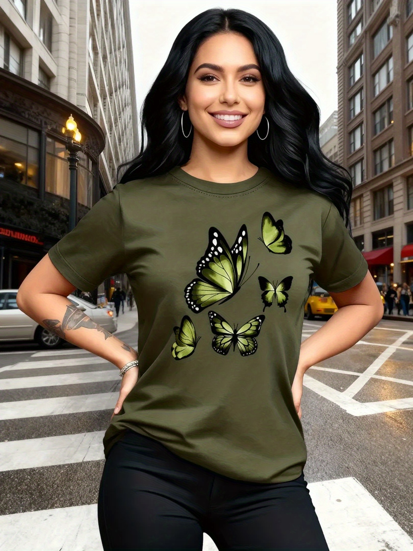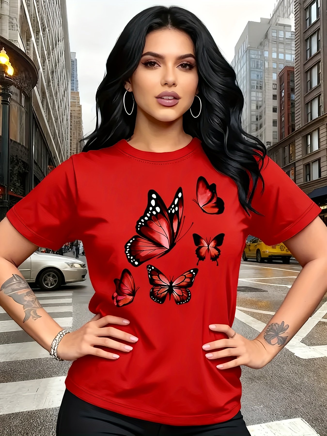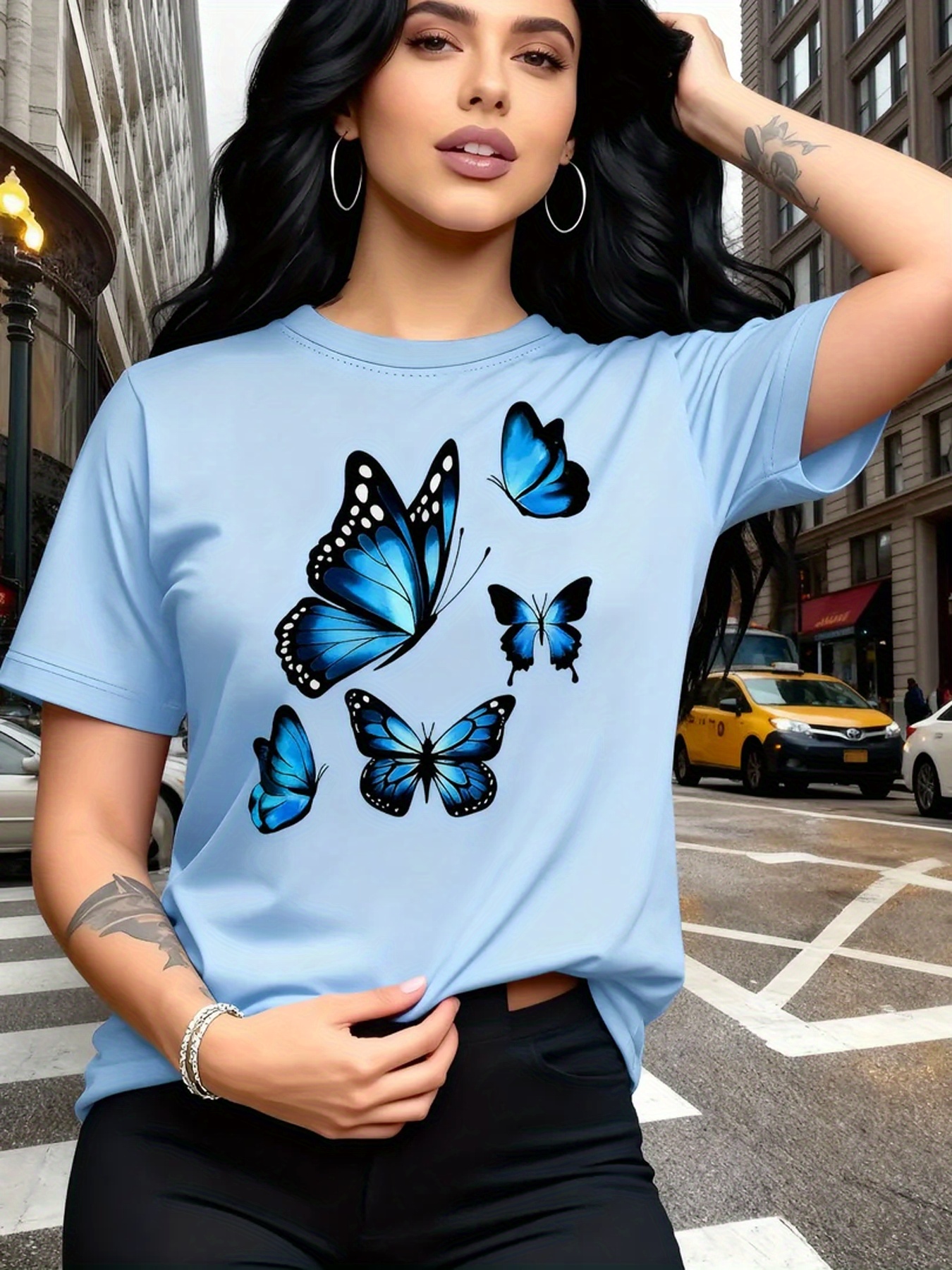 Camiseta Plus Size e/ou OverSized Feminina Chic Com Estampa de Borboletas - Manga Curta, Gola Redonda, Confortável, Respirável e Macia.