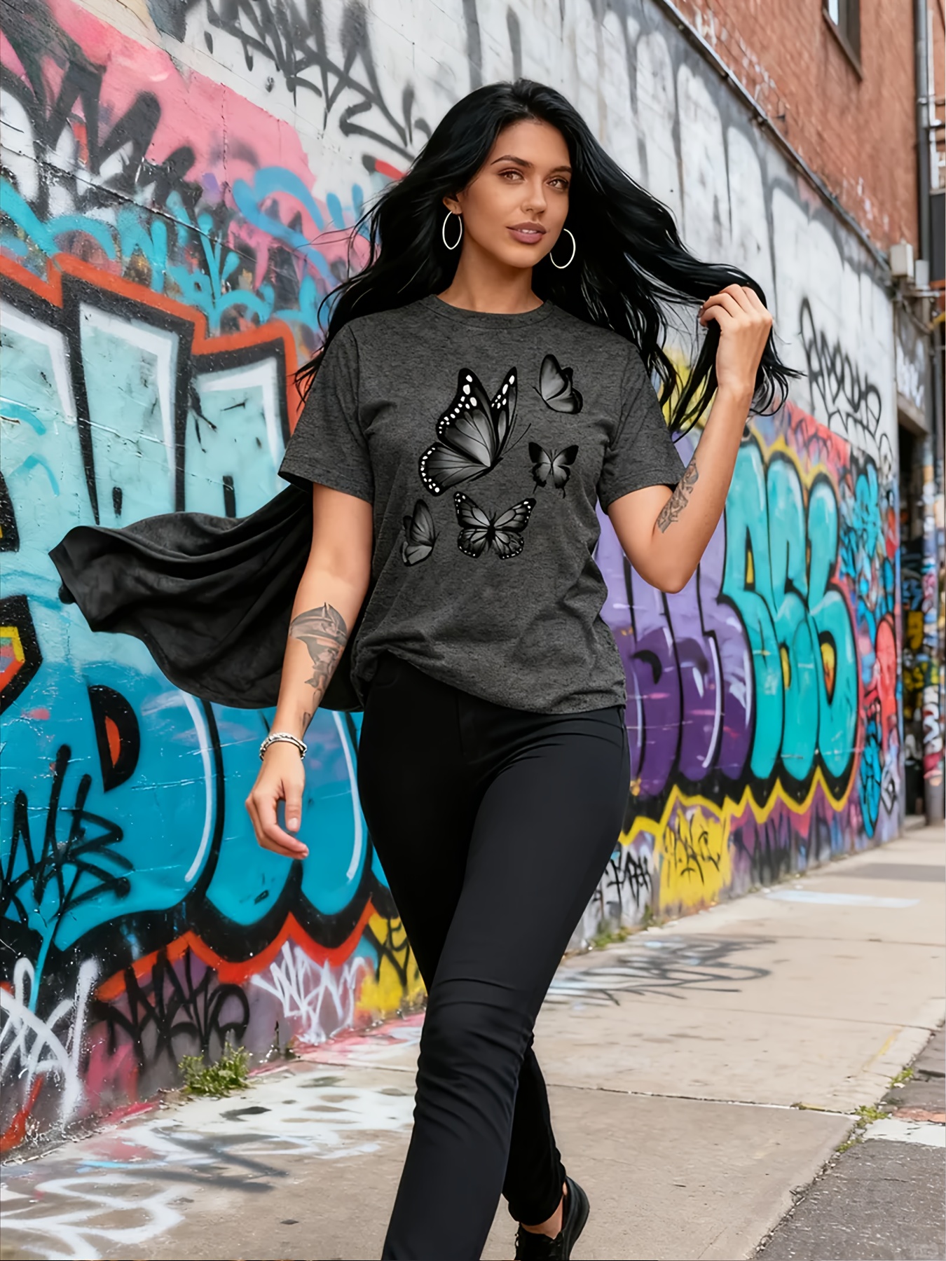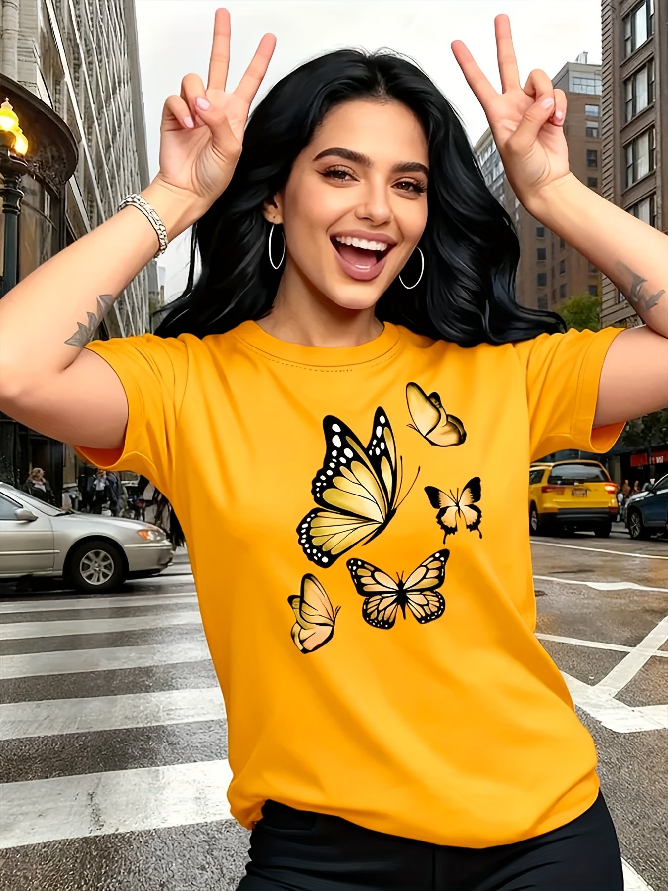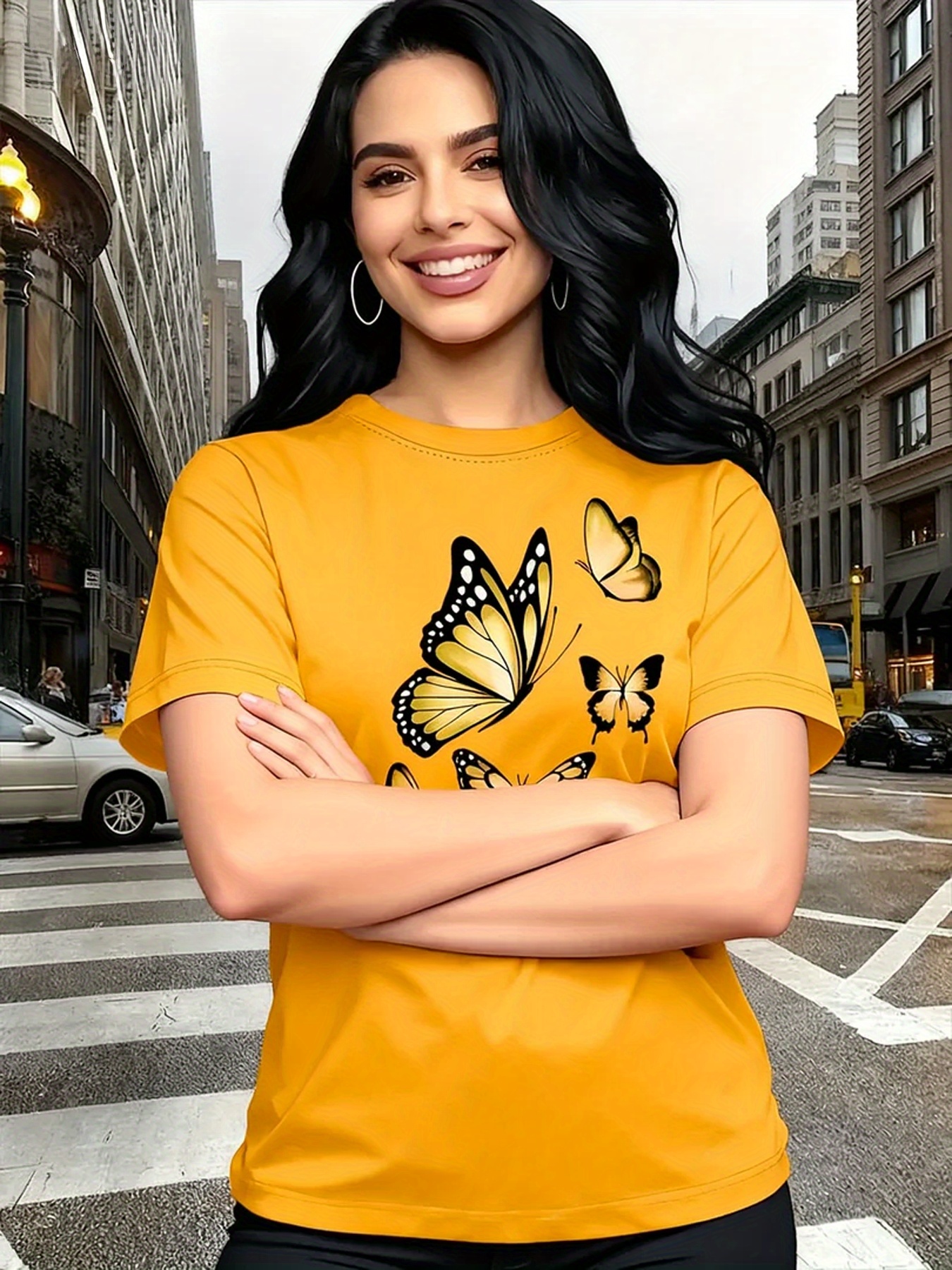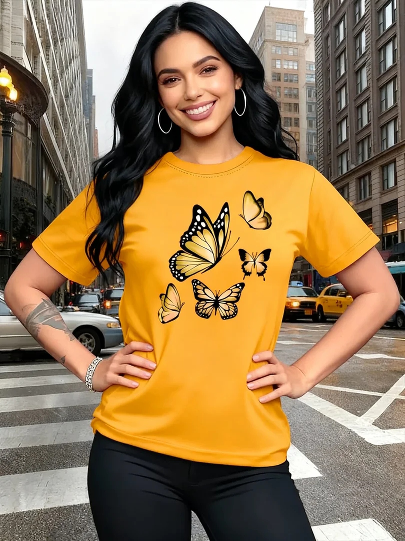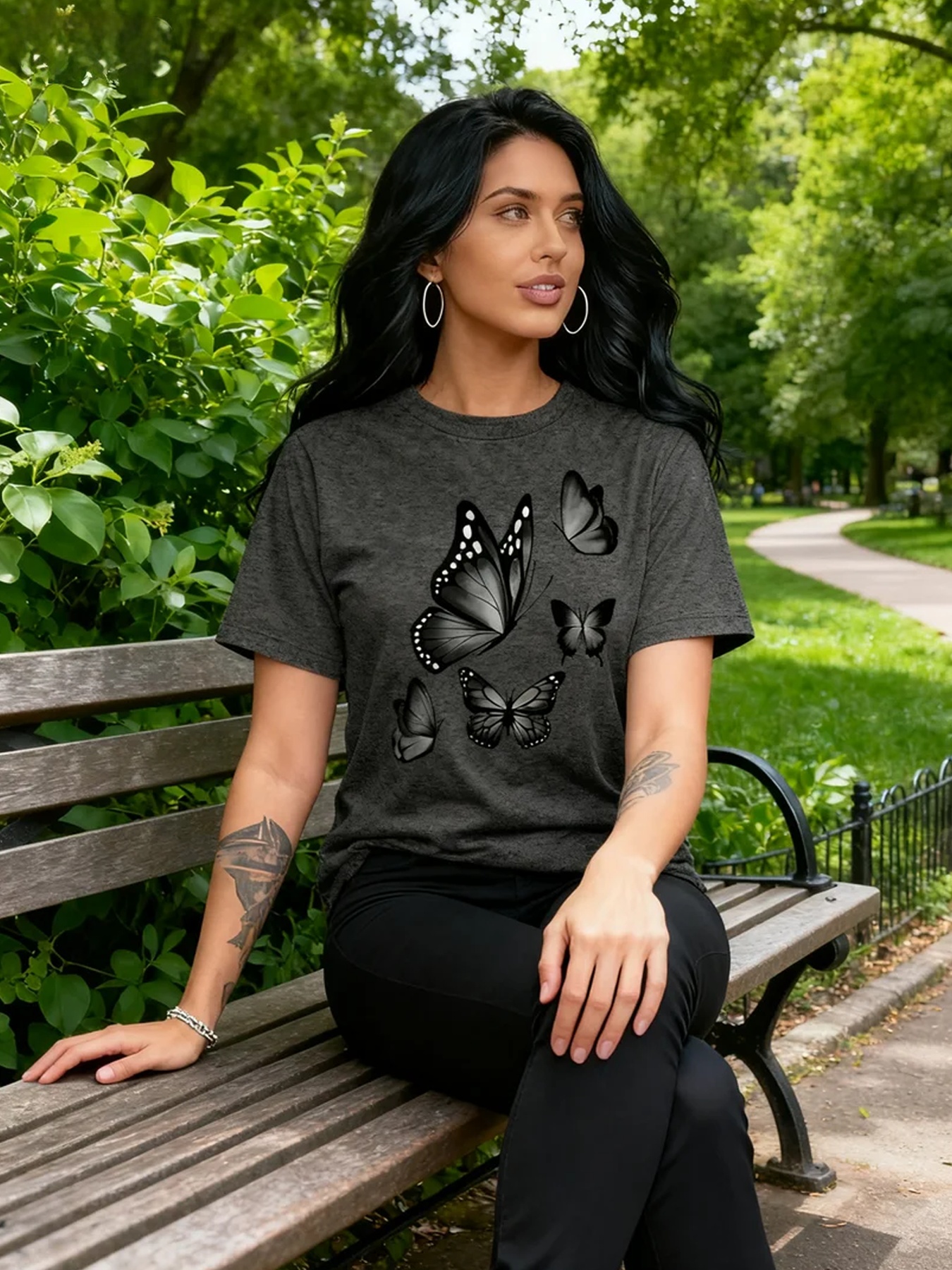 Camiseta Plus Size e/ou OverSized Feminina Chic Com Estampa de Borboletas - Manga Curta, Gola Redonda, Confortável, Respirável e Macia.
