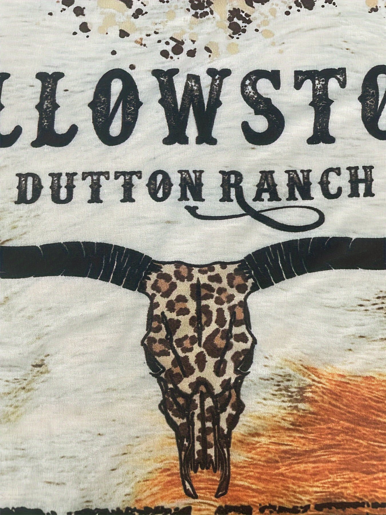 Camiseta Plus Size e/ou Oversized Feminina Com Estampa Western de Caveira e Letras, Modelagem Solta, Manga Curta e Gola Redonda. Lavável à Máquina, Ideal para o Dia a Dia. Perfeita para Todas as Estações. Tecido Não Transparente.
