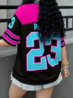 Camiseta Plus Size e/ou Oversized Feminina de Manga Curta Com Decote Em “V”, Estilo Streetwear, Modelagem Solta, Estampa Color Block Em Preto e Rosa, Tamanho Grande 23, Blusa Moderna e Versátil, Caimento Regular e Confortável.