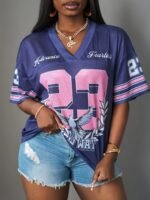 Seja o primeiro a avaliar “Camiseta Plus Size e/ou Oversized Feminina Estampada Com Decote Em “V”, Ombros Caídos, Mangas Três-Quartos, Modelo Casual, Com Listras Em Azul Marinho e Detalhes Em Rosa na Parte Superior.” Cancelar resposta