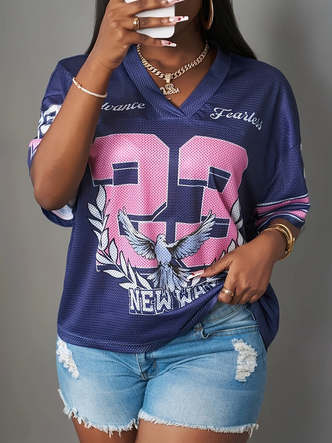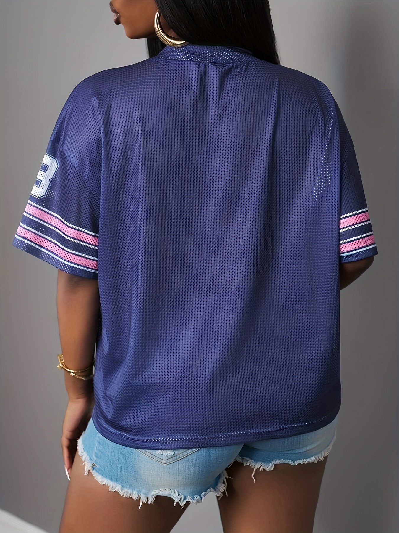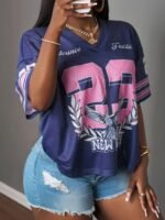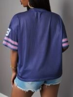 Camiseta Plus Size e/ou Oversized Feminina Estampada Com Decote Em “V”, Ombros Caídos, Mangas Três-Quartos, Modelo Casual, Com Listras Em Azul Marinho e Detalhes Em Rosa na Parte Superior.