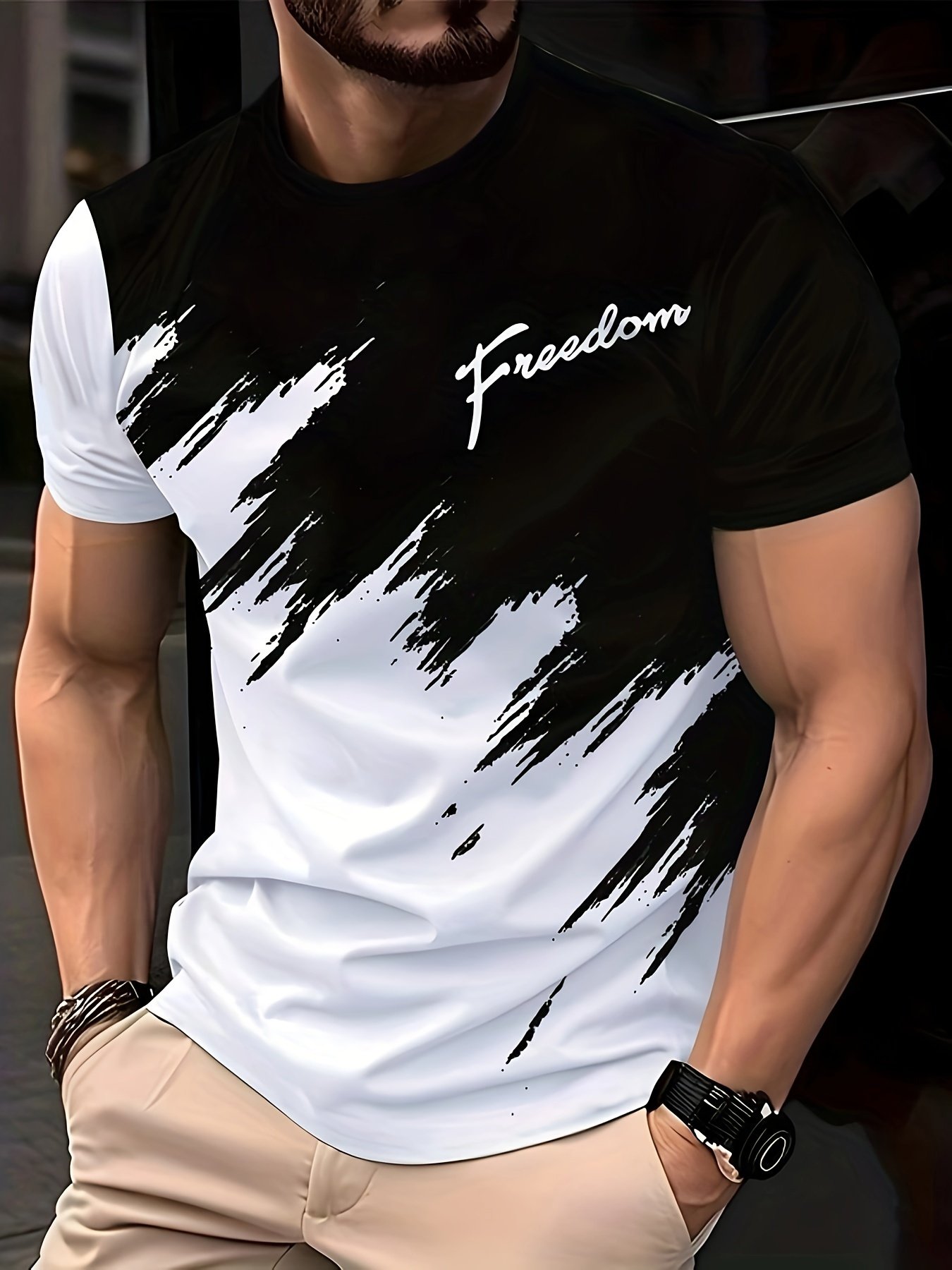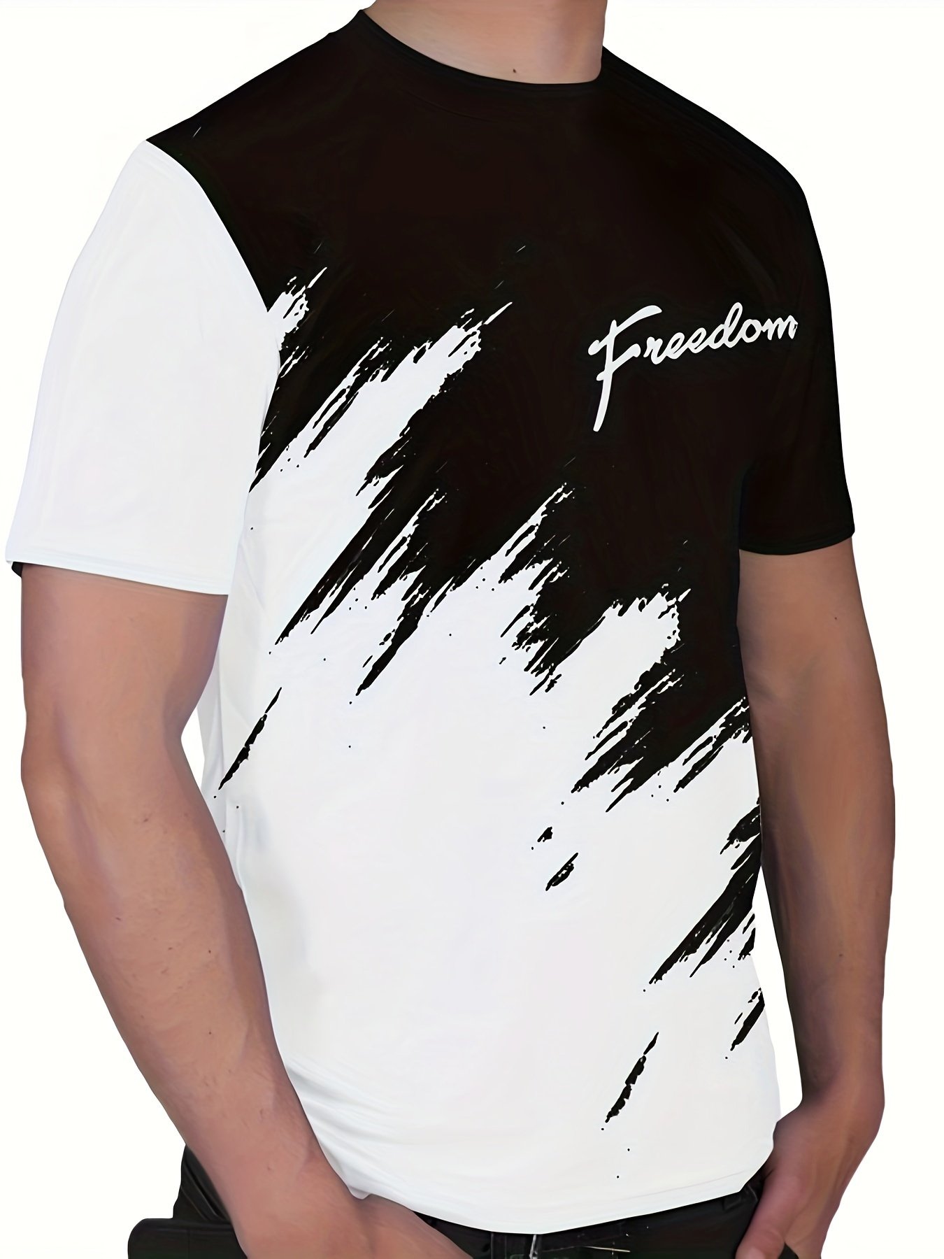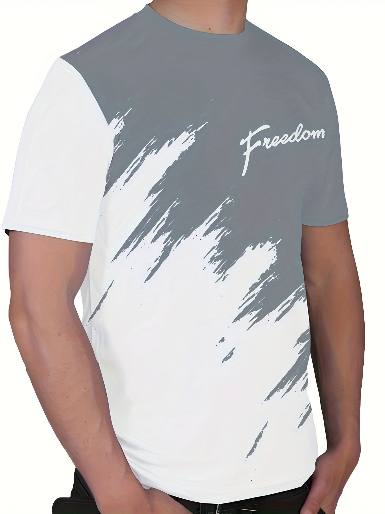 Camiseta Plus Size Masculina Casual Com Estampa Geométrica e a Palavra “Freedom” Em Cursiva – Cinza Claro, Modelagem Regular, Gola Redonda, Ideal para Looks Casuais, Confortável e Estilosos, Confeccionada Em Tecido Elástico.