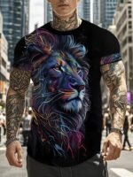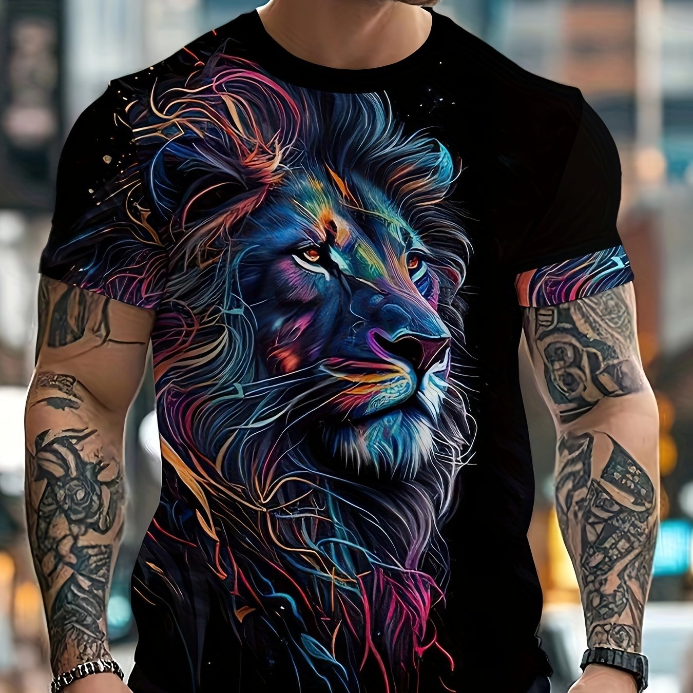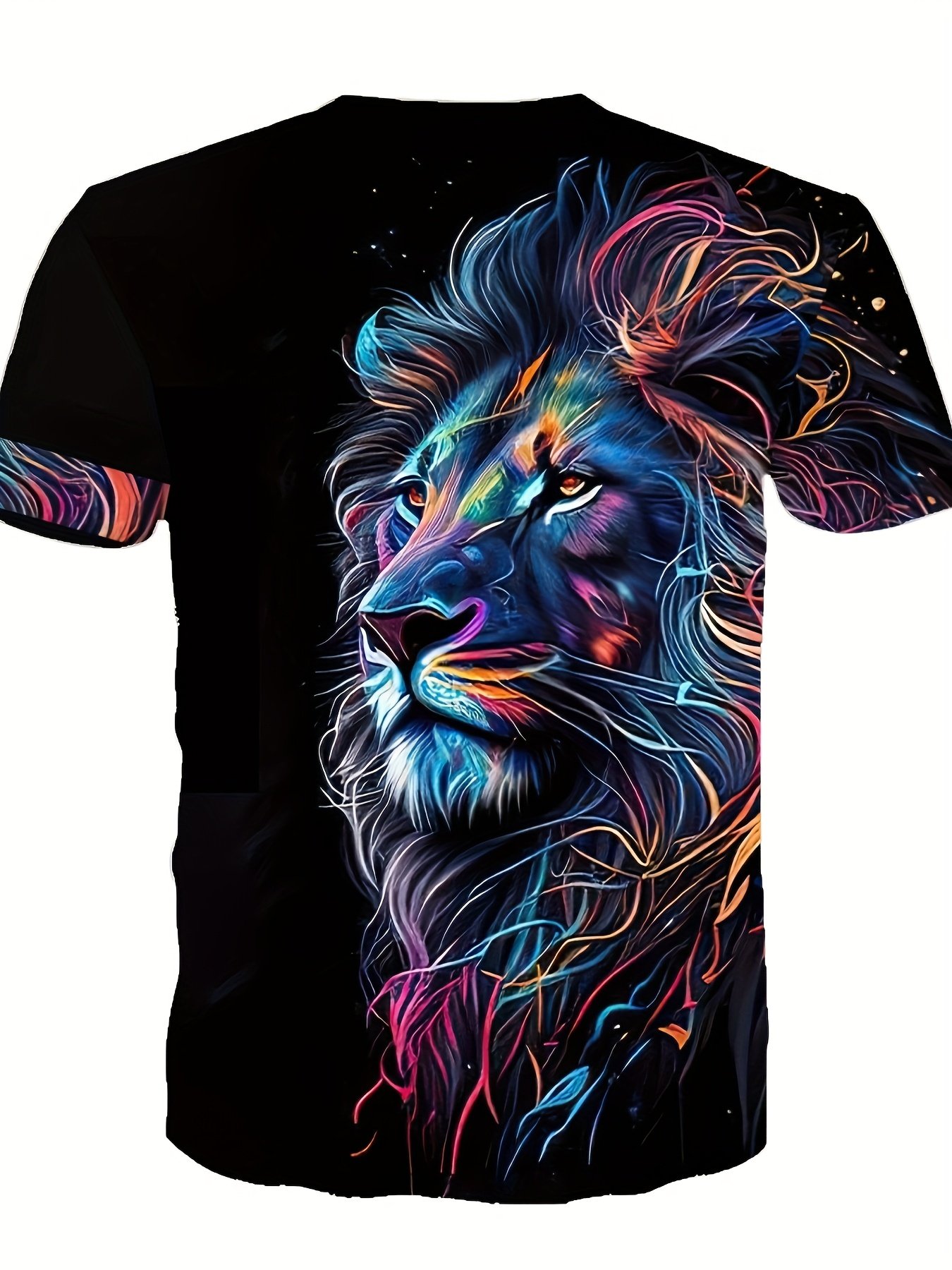 Camiseta Plus Size Masculina Com Gola Redonda e Estampa de Leão, Camiseta Casual e Confortável, Ideal para Presentear, Roupa para Atividades Ao Ar Livre.