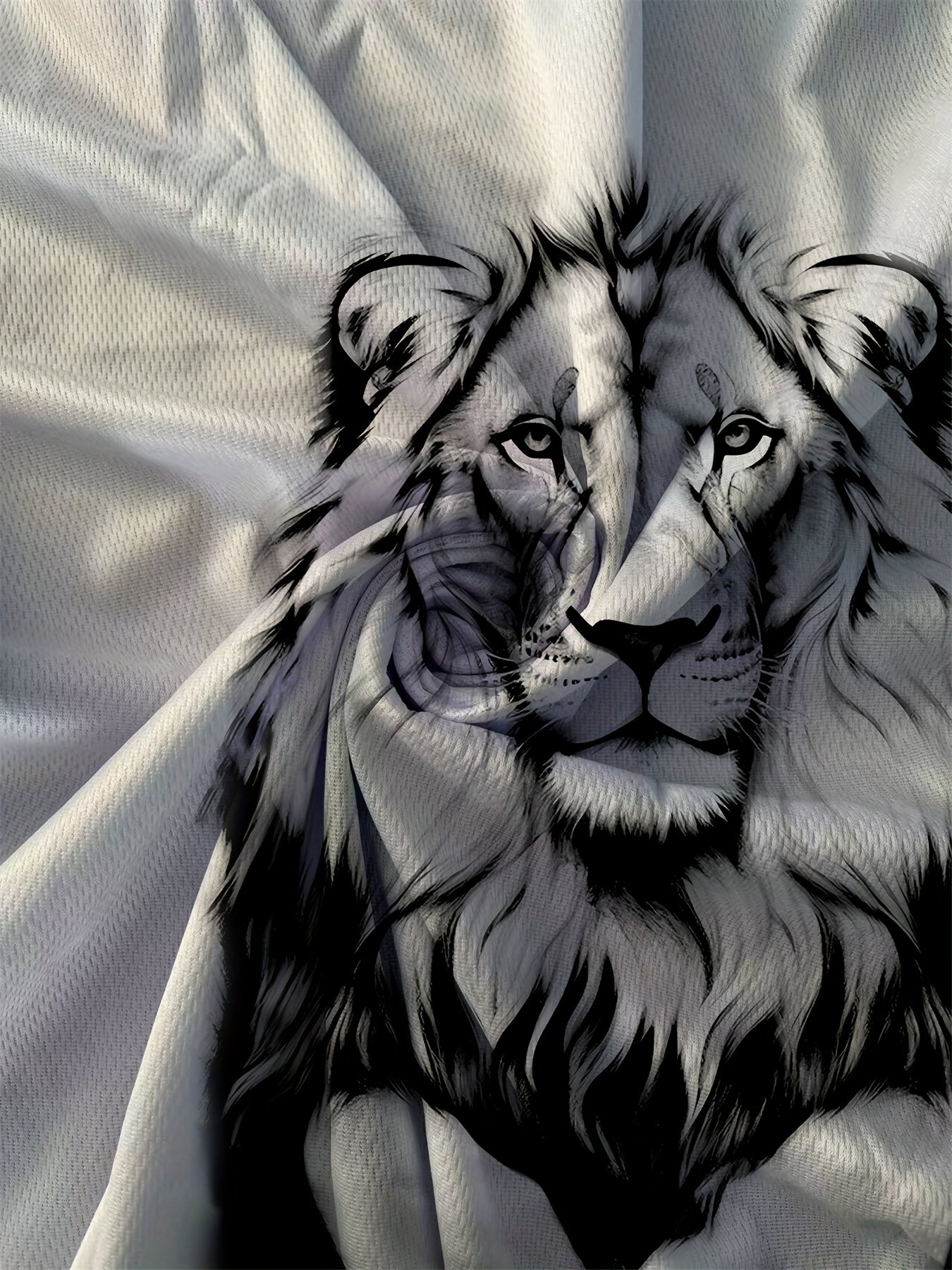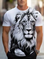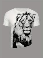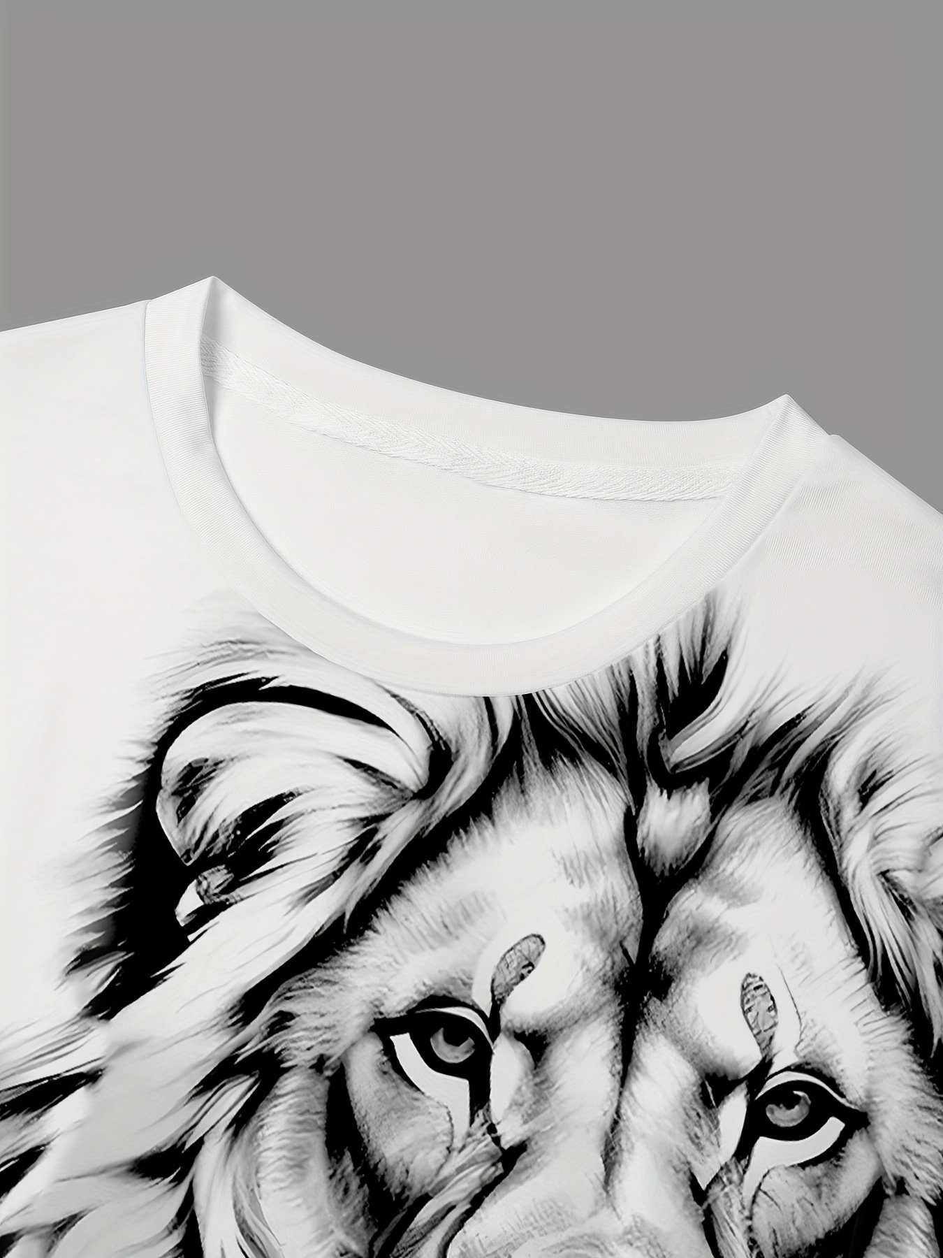 Camiseta Plus Size Streetwear Com Estampa de Leão Em 3D, Estilosa, Casual e Divertida, de Manga Curta, na Cor Branca Com Desenho de Leão.