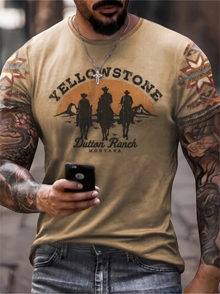 Camiseta Plus Size Masculina 3D, Tamanho Grande, Manga Curta, Com Estampa Retrô do Parque Nacional de Yellowstone.