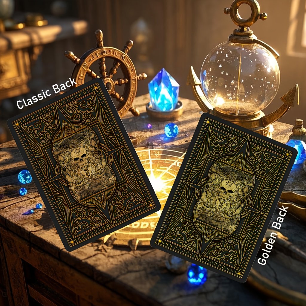 Cartas de Pôquer Vintage Com Tema de Pirata da Strublfe – Requintado Relevo Antiderrapante Dupla Face, Fundição Sob Pressão de Quatro Camadas, Perfeito para Reuniões Familiares e Jogos de Festa, Caveira Elegante e Design Geométrico, Detalhes Dourados, Noite de Jogos Em Família. Padrões Geométricos de Cartas. Luxo