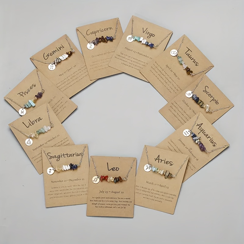 Conjunto de 12 Colares Com Pedras de Nascimento do Zodíaco, Estilo Boho e Simples, Pingente de Aço Inoxidável Com Contas de Pedra Natural, Joias Femininas da Moda para Uso Diário e Festas, Inclui Cartão de Presente – Compatível Com Todas as Estações.