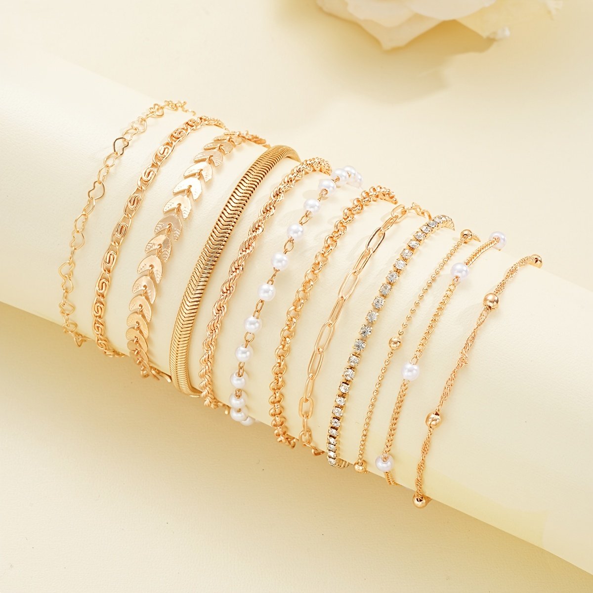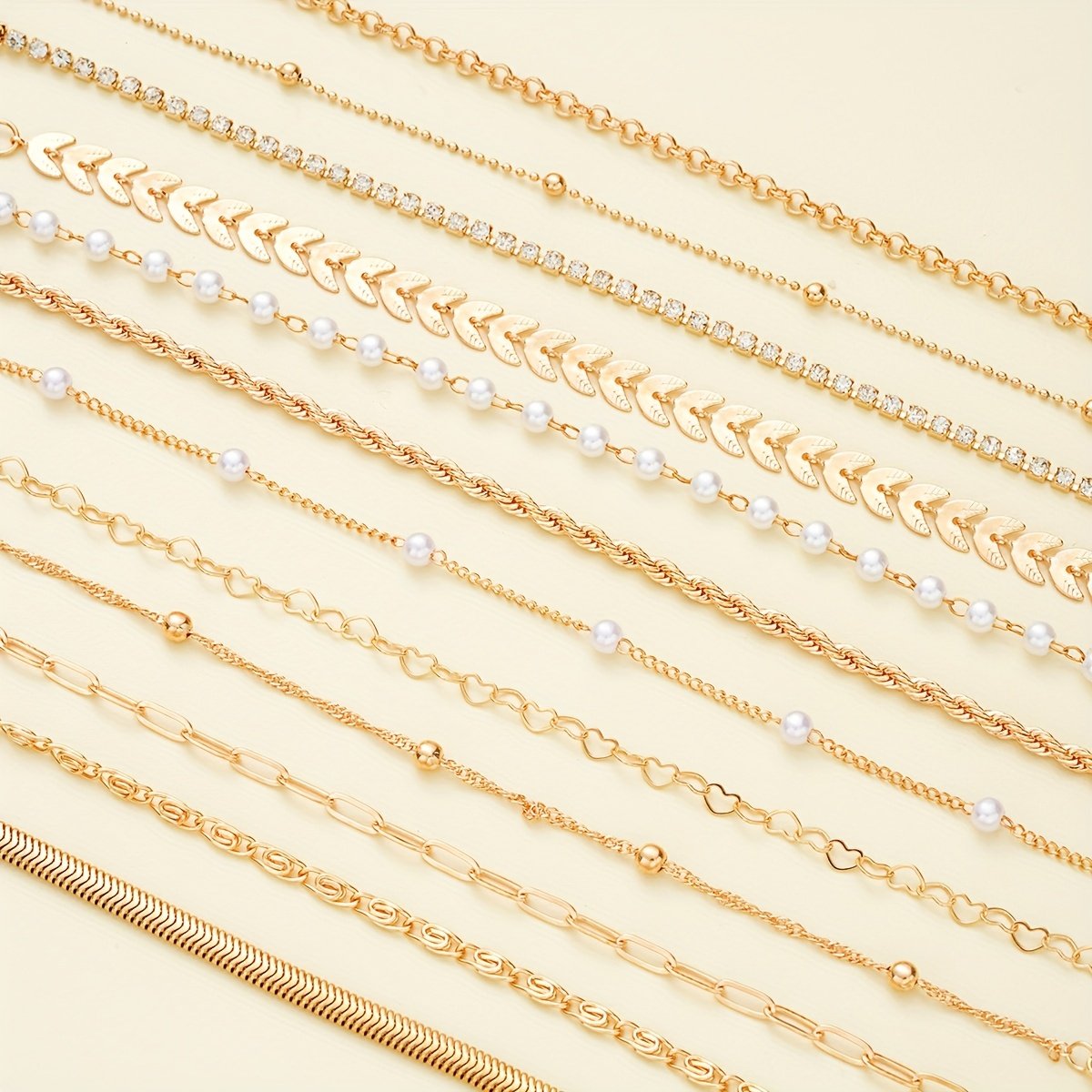 Início Vestuário e Acessórios Bijouterias Conjunto de 12 Pulseiras Elegantes Douradas Com Pingente de Coração e Corrente de Contas para Mulheres – Perfeito para Encontros, Feriados e para o Dia a Dia, Acessório Versátil para Todas as Estações, Conjunto de Pulseiras para o Dia a Dia | Conjunto de Acessórios Chiques | Liga de Zinco Durável.