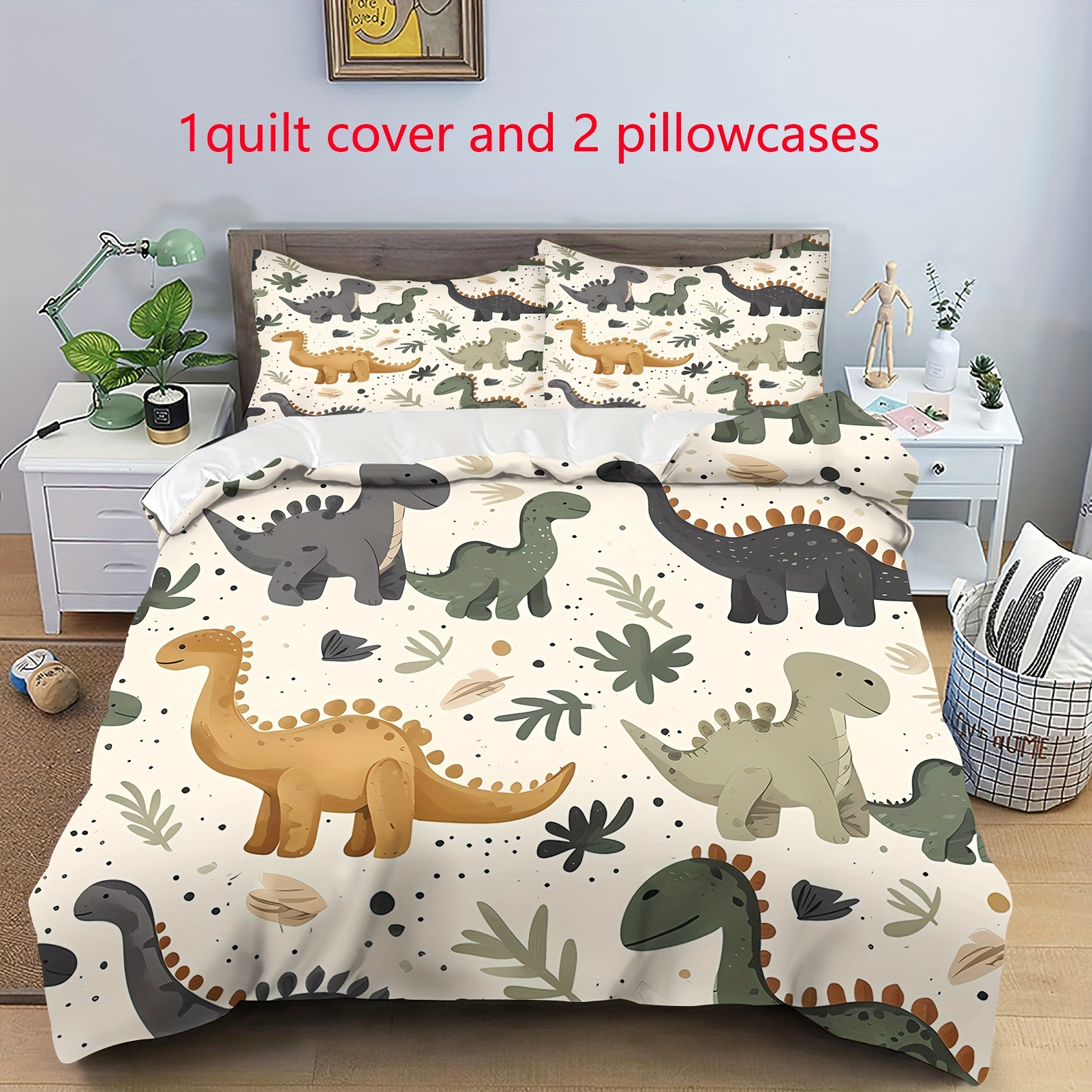 Conjunto de 3 Peças, Capa de Edredom Original de Alta Qualidade Com Estampa de Dinossauro Em Desenho Animado, Macia e Confortável (Ideal para Quarto e Quarto de Hóspedes) (1 Capa de Edredom + 2 Fronhas, Sem Núcleo).