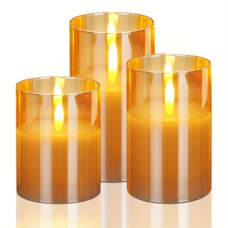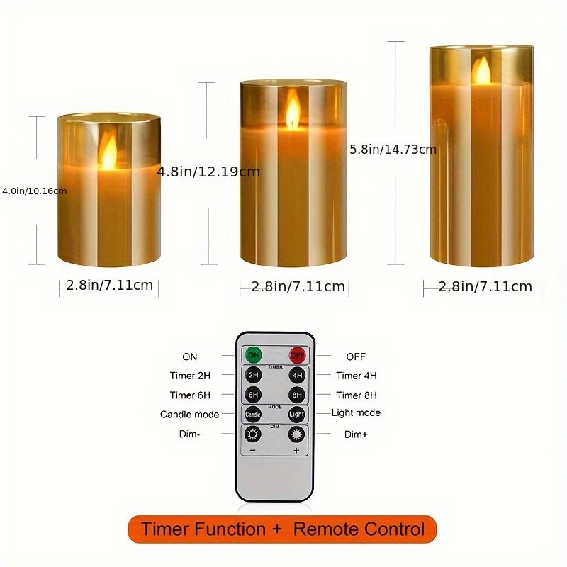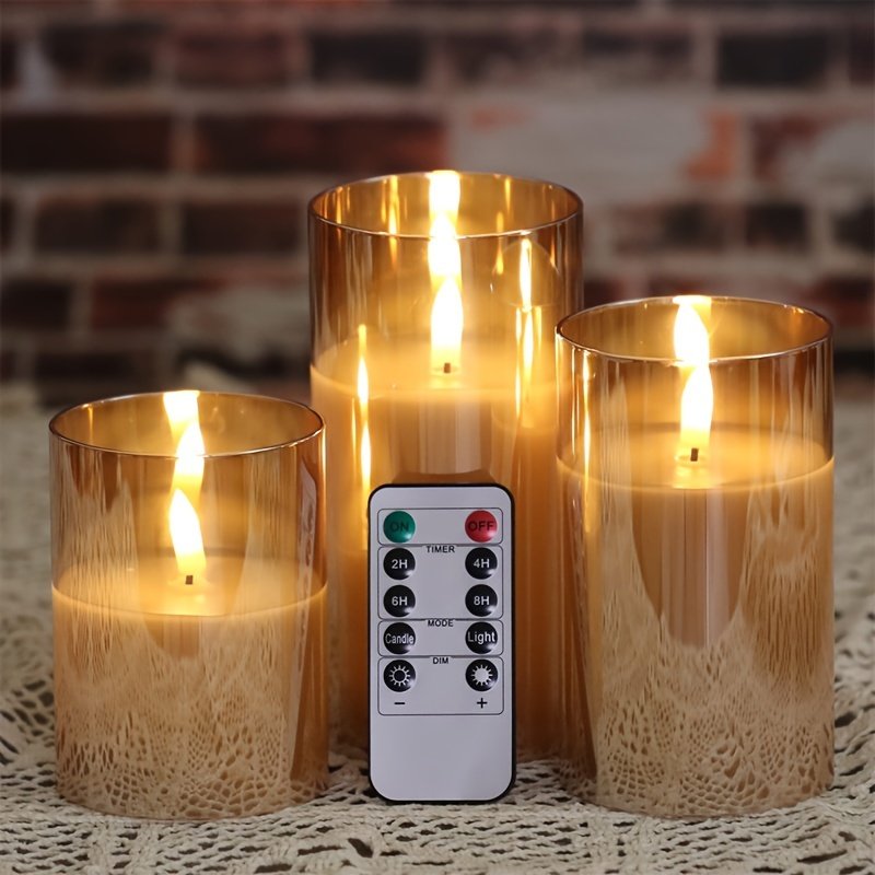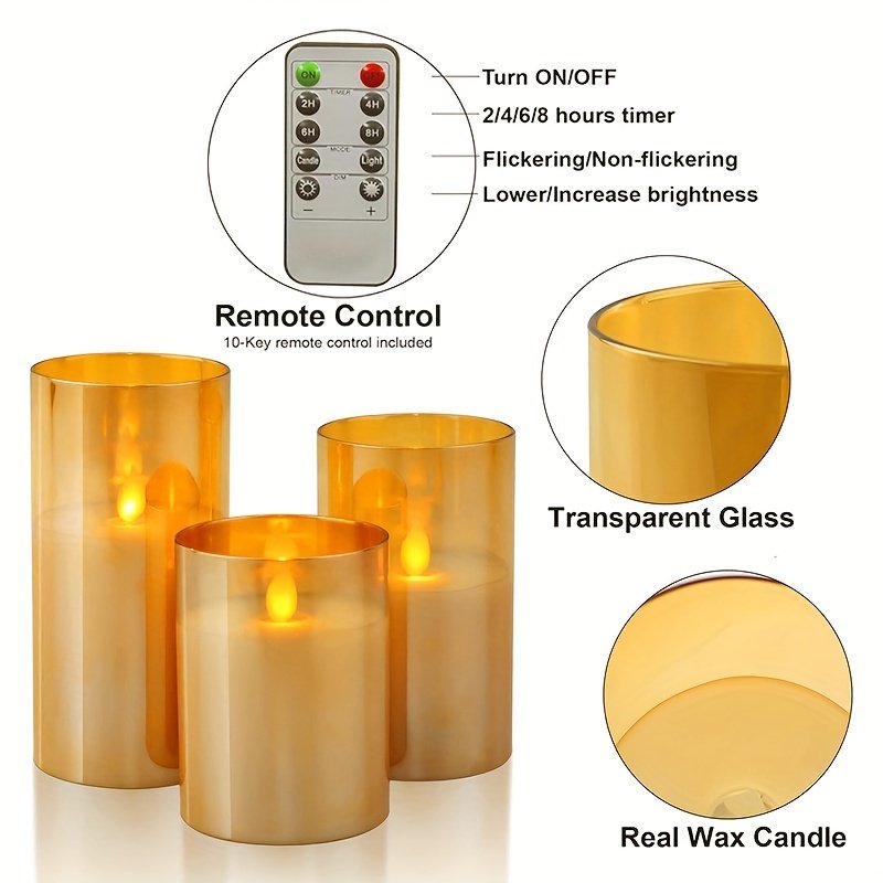 Conjunto de 3 velas eletrônicas de LED com controle remoto, acabamento em metal polido, plástico, operado por bateria, comutável, para decoração de casa, atmosfera romântica, casamento, pedido de casamento, Natal, dia dos namorados, festa da empresa