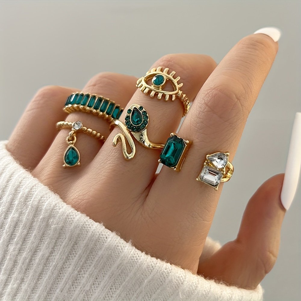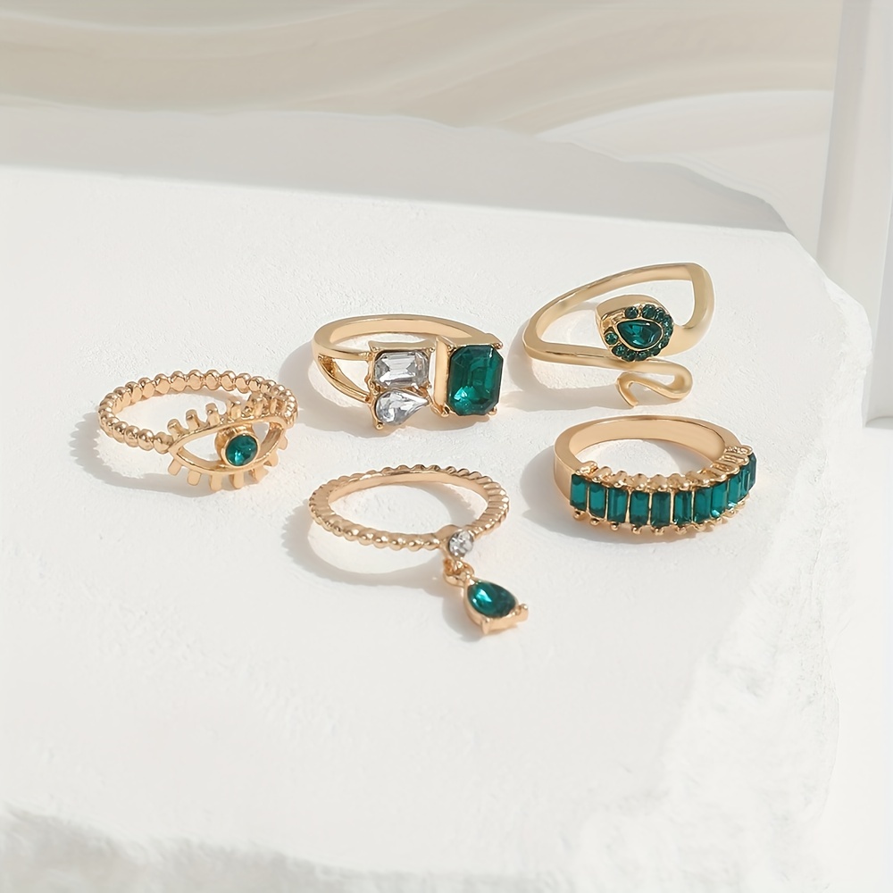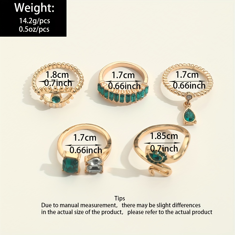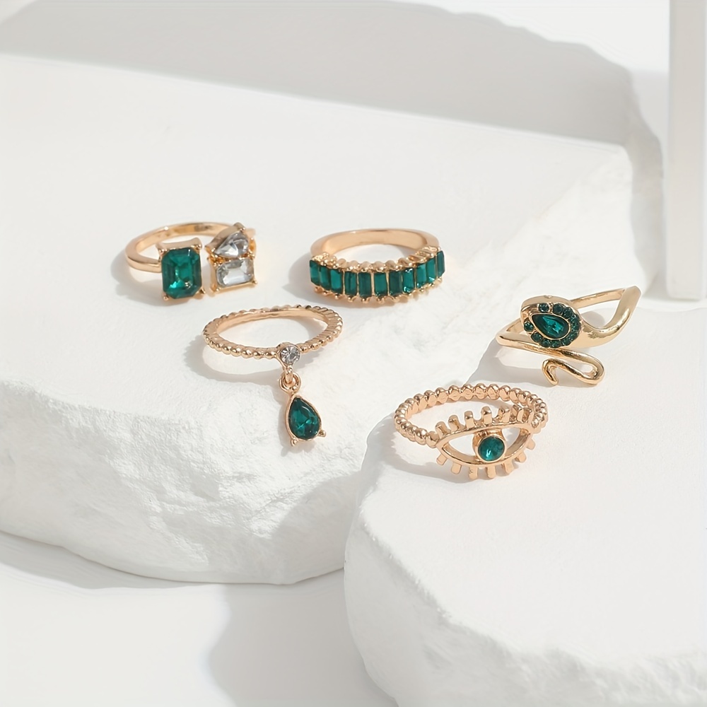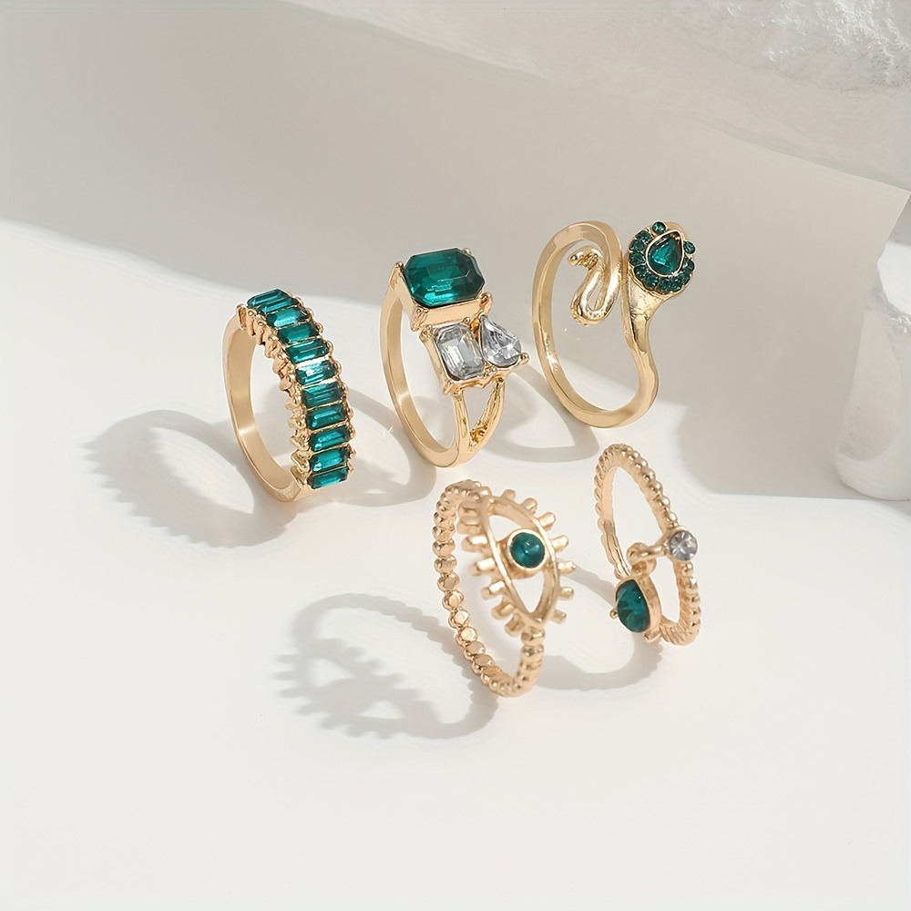 Conjunto de 5 Anéis de Liga, Pingente de Gota de Strass Verde Cobra Elegante Vintage.