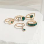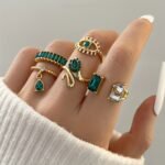 Início Vestuário e Acessórios Bijouterias Conjunto de 5 Anéis de Liga, Pingente de Gota de Strass Verde Cobra Elegante Vintage.