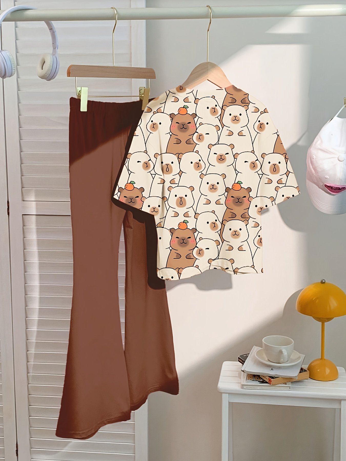 Conjunto de Duas Peças de Camiseta Estampada Com Urso Fofo + Calça Flare Slim Fit para Meninas, Perfeito para Atividades Ao Ar Livre.
