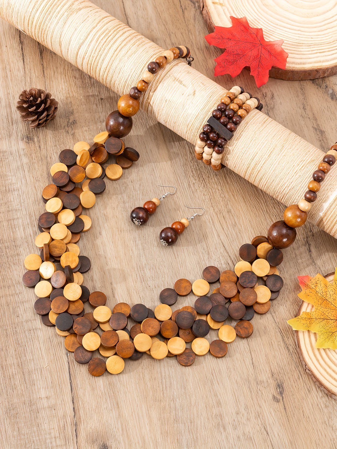 Conjunto de Joias Feminina Estilo Boho “1 par de Brincos + 1 Colar + 1 Pulseira” Feito de Contas de Madeira, Combina Com Roupas Design Estiloso e Moderno.