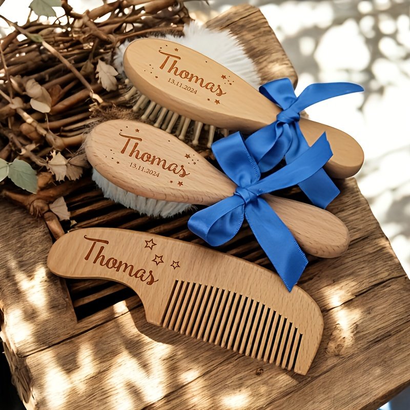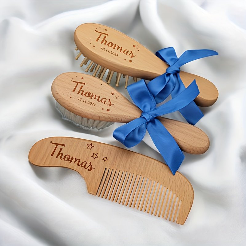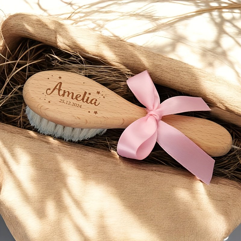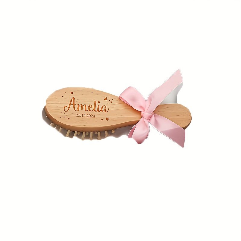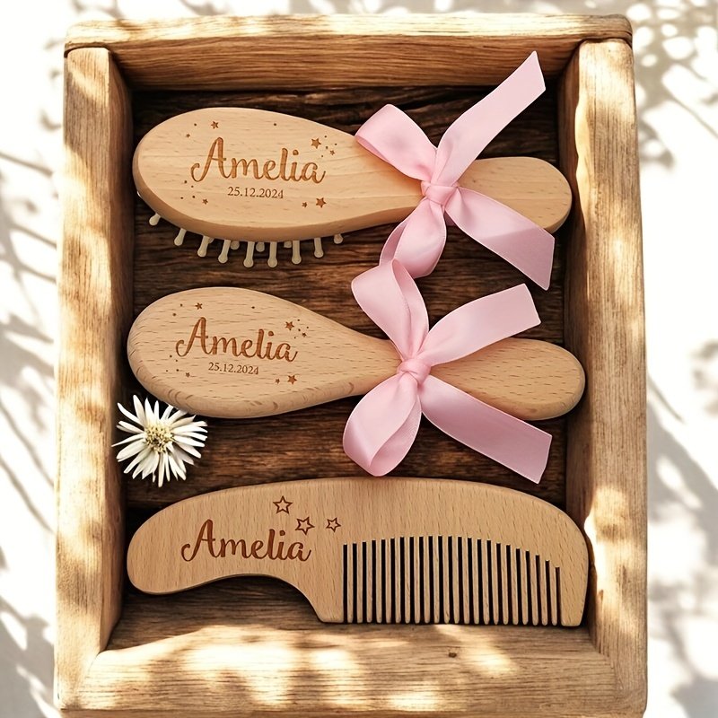 Conjunto de Pentes de Cabelo de Madeira Personalizados e Gravados, 1/3 Peças – Nome e Data Personalizados, Design Elegante de Laço Rosa, Cerdas de Nylon Duráveis, Presente Ideal para o Dia das Mães para Recém-nascidos e Mães, Acessório de Banho Exclusivo para Lembrança, Acessórios de Cabelo.