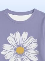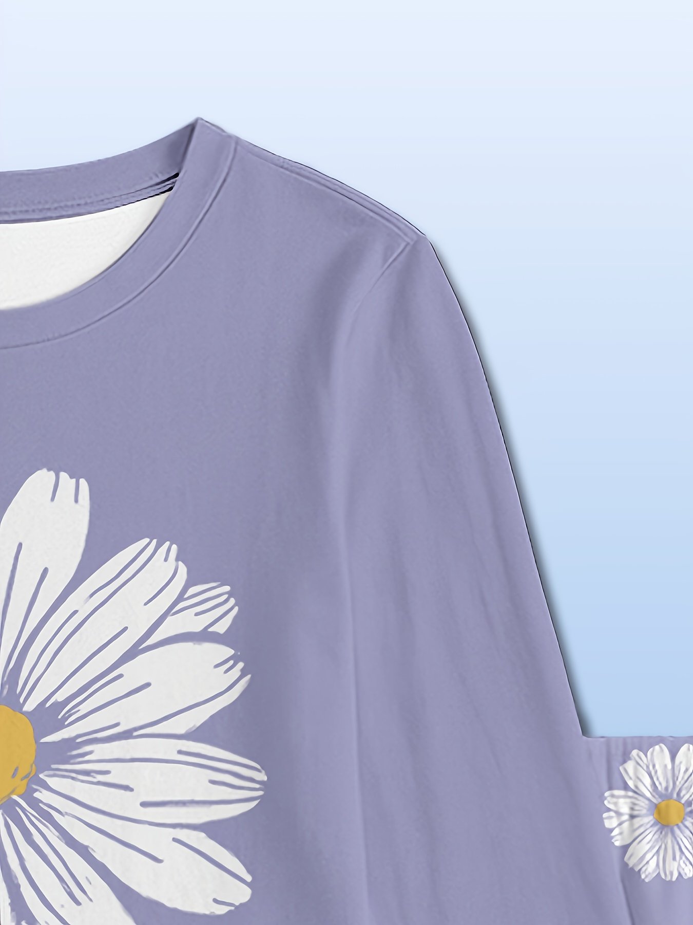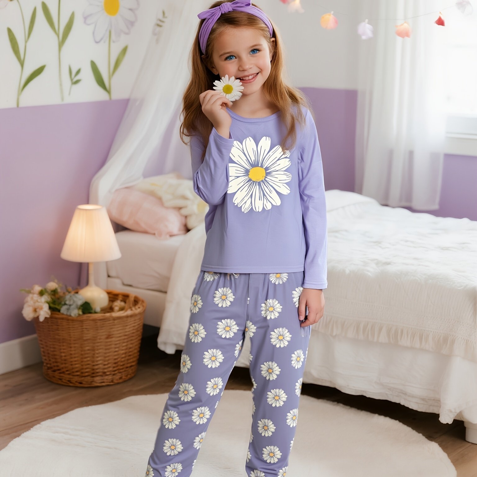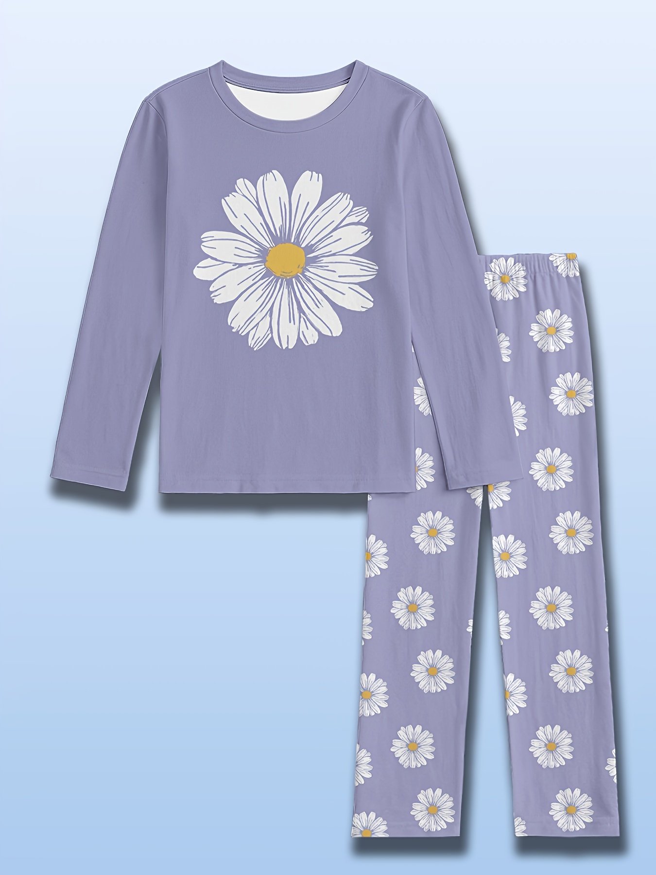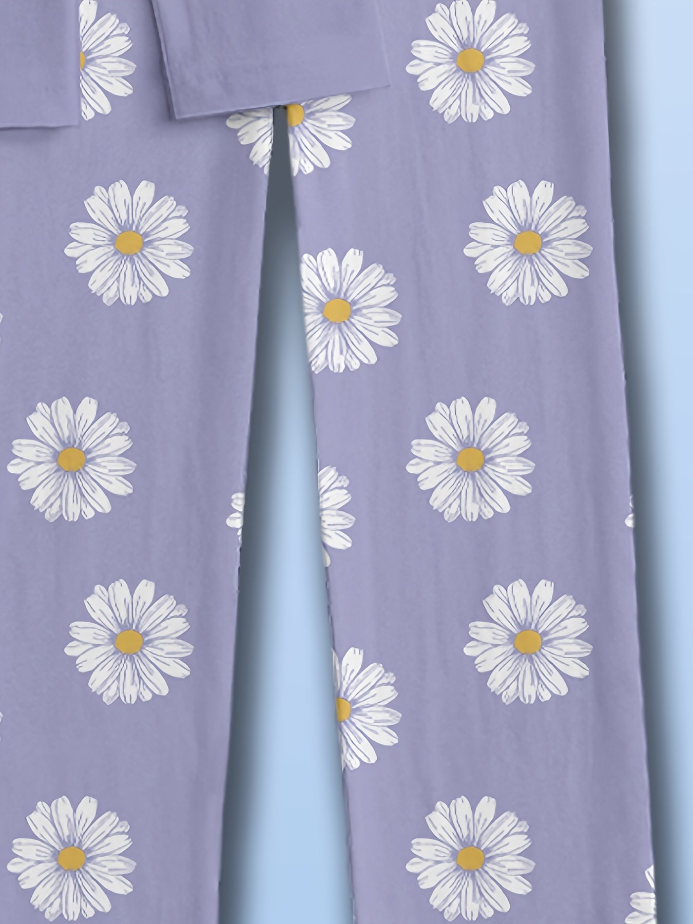 Conjunto de Pijama de Duas Peças Com Estampa Floral de Margaridas Brancas, Manga Comprida e Calça, Calça de Dormir Estampada Estilo Desenho Animado, Estampa Digital, Design Floral Moderno para Uso Em Casa, Roupa de Dormir para Dormir, Estampa Floral, Roupa de Dormir Moderna, Durável.