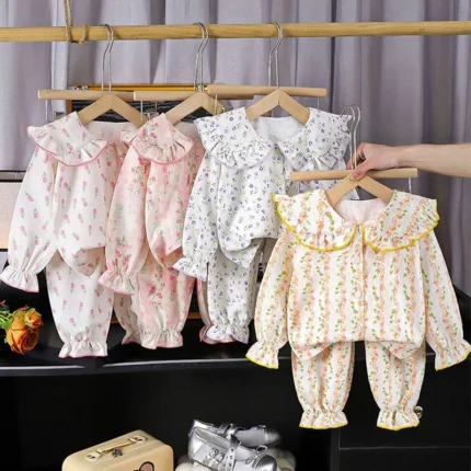 Verão Meninas Pijamas Doce Bonito Estilo Princesa Casa Terno Conjunto Impresso Gola Boneca Rendas Crianças Calças de Manga Comprida Pijamas.